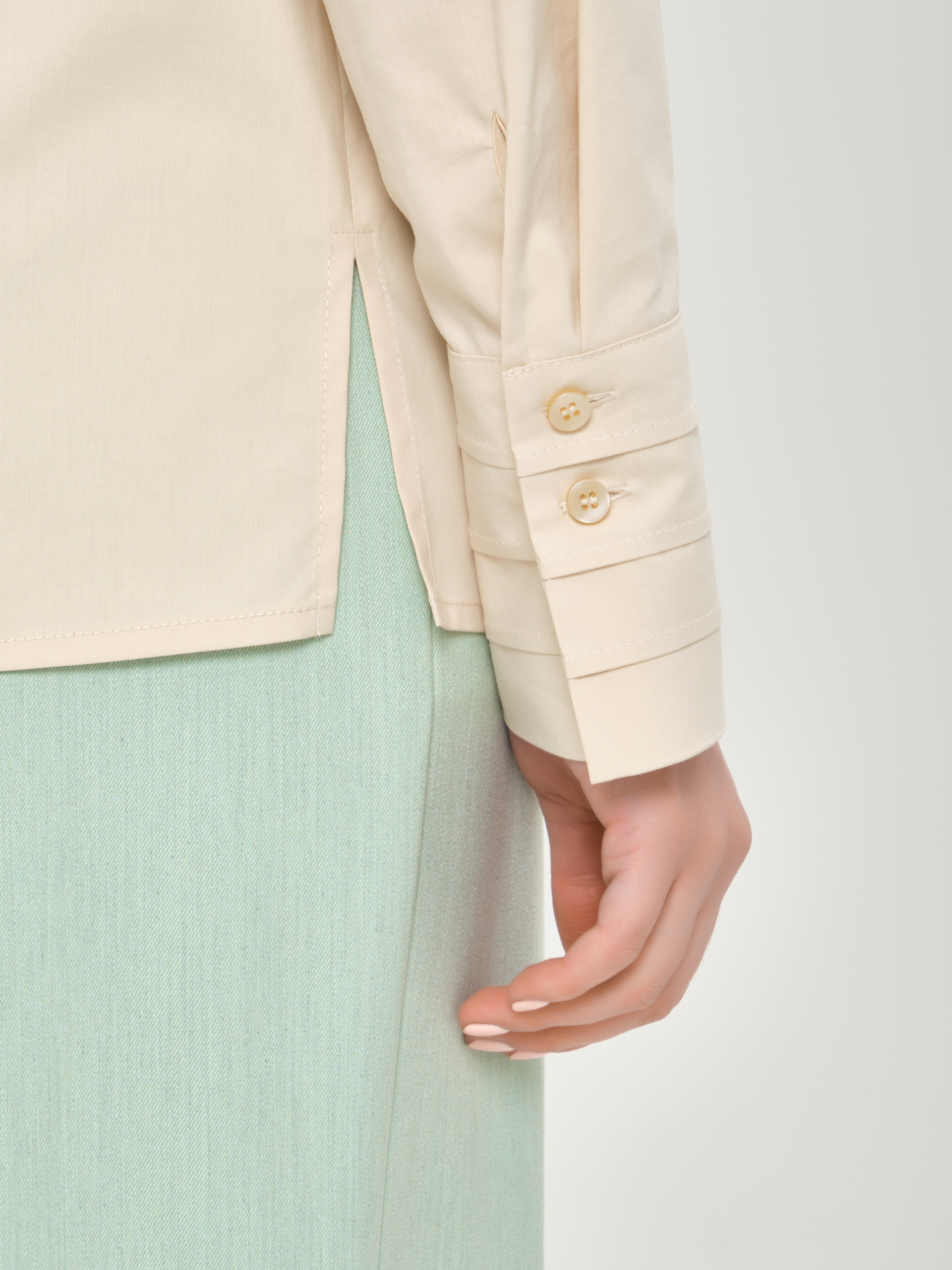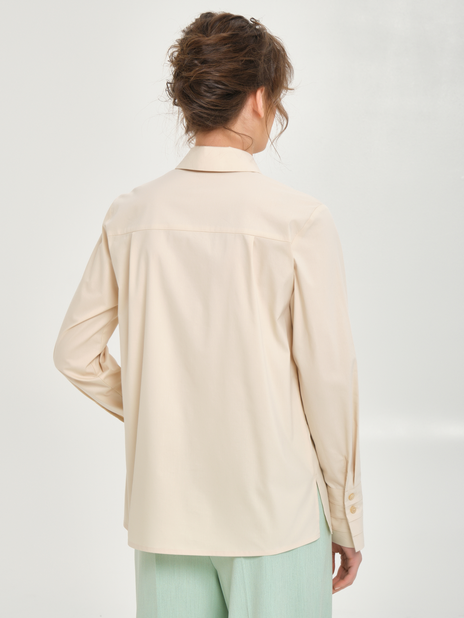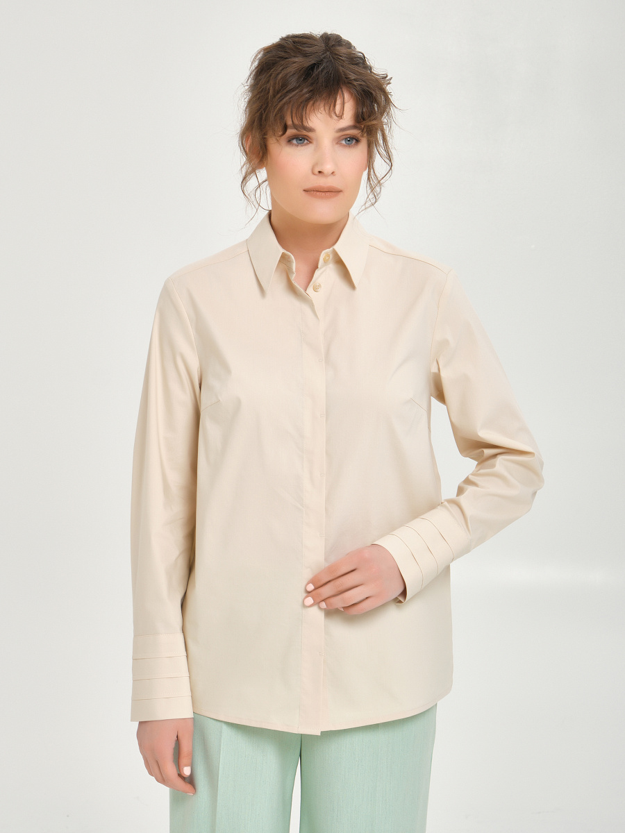 Спереди потайная застёжка на петли и пуговицы. Спинка с кокеткой, переходящей на перед. Сзади под кокеткой защипы. В боковых швах разрезы. По низу рукава защипы и широкая манжета. На манжете обработана группа застроченных складок и застёжка на пуговицы.