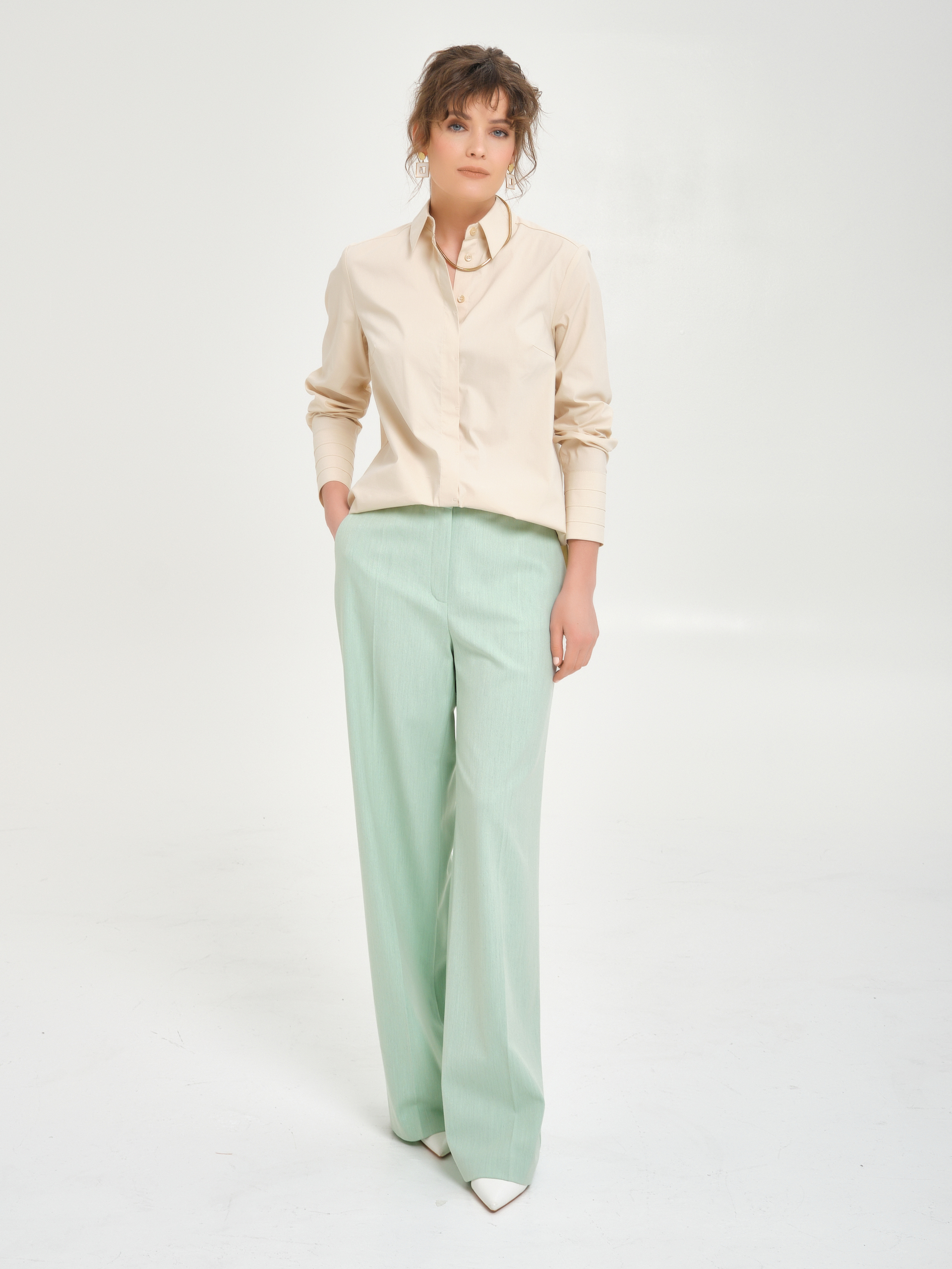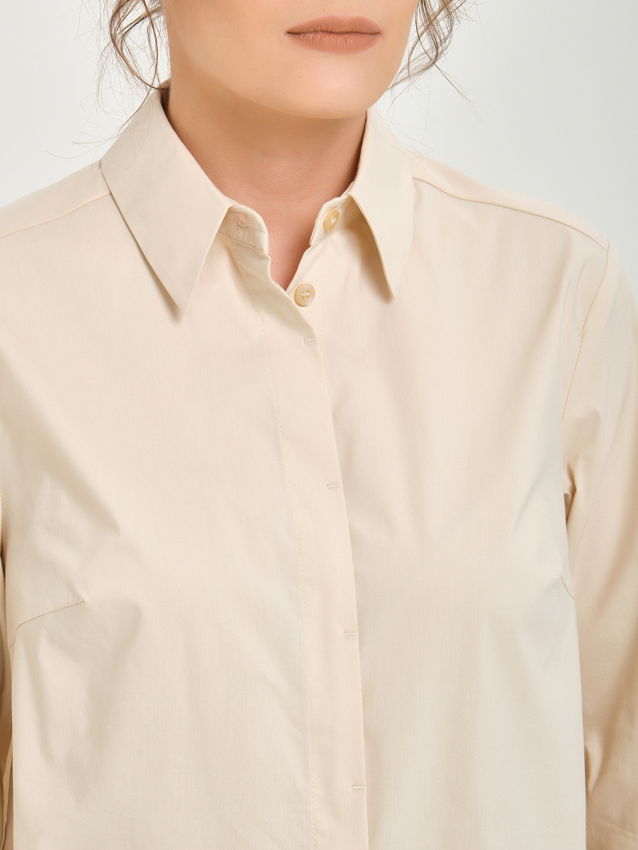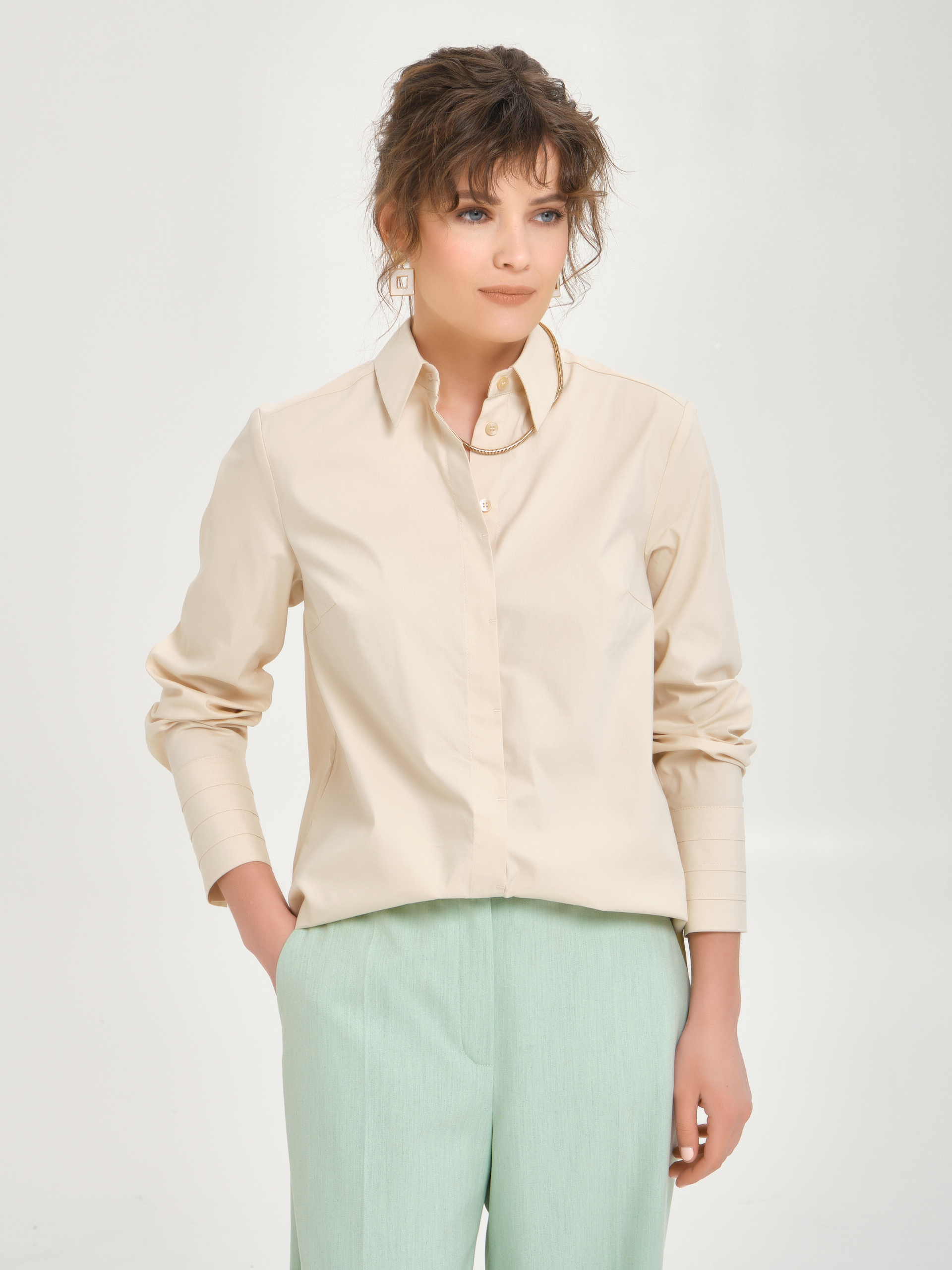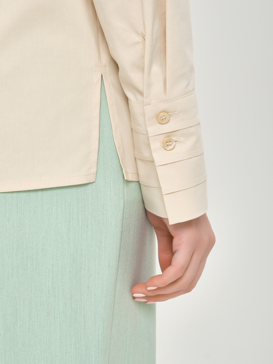 Спереди потайная застёжка на петли и пуговицы. Спинка с кокеткой, переходящей на перед. Сзади под кокеткой защипы. В боковых швах разрезы. По низу рукава защипы и широкая манжета. На манжете обработана группа застроченных складок и застёжка на пуговицы.