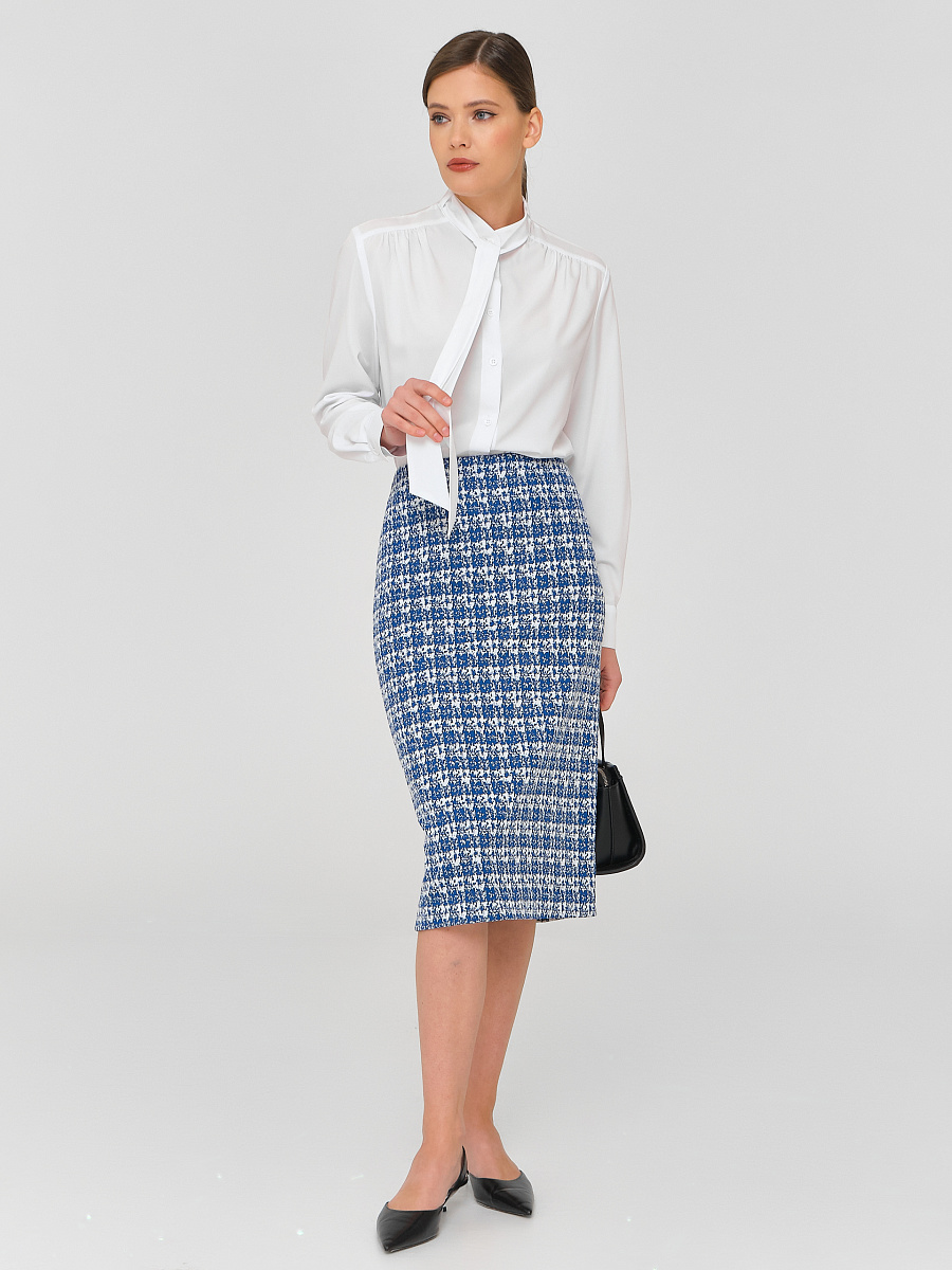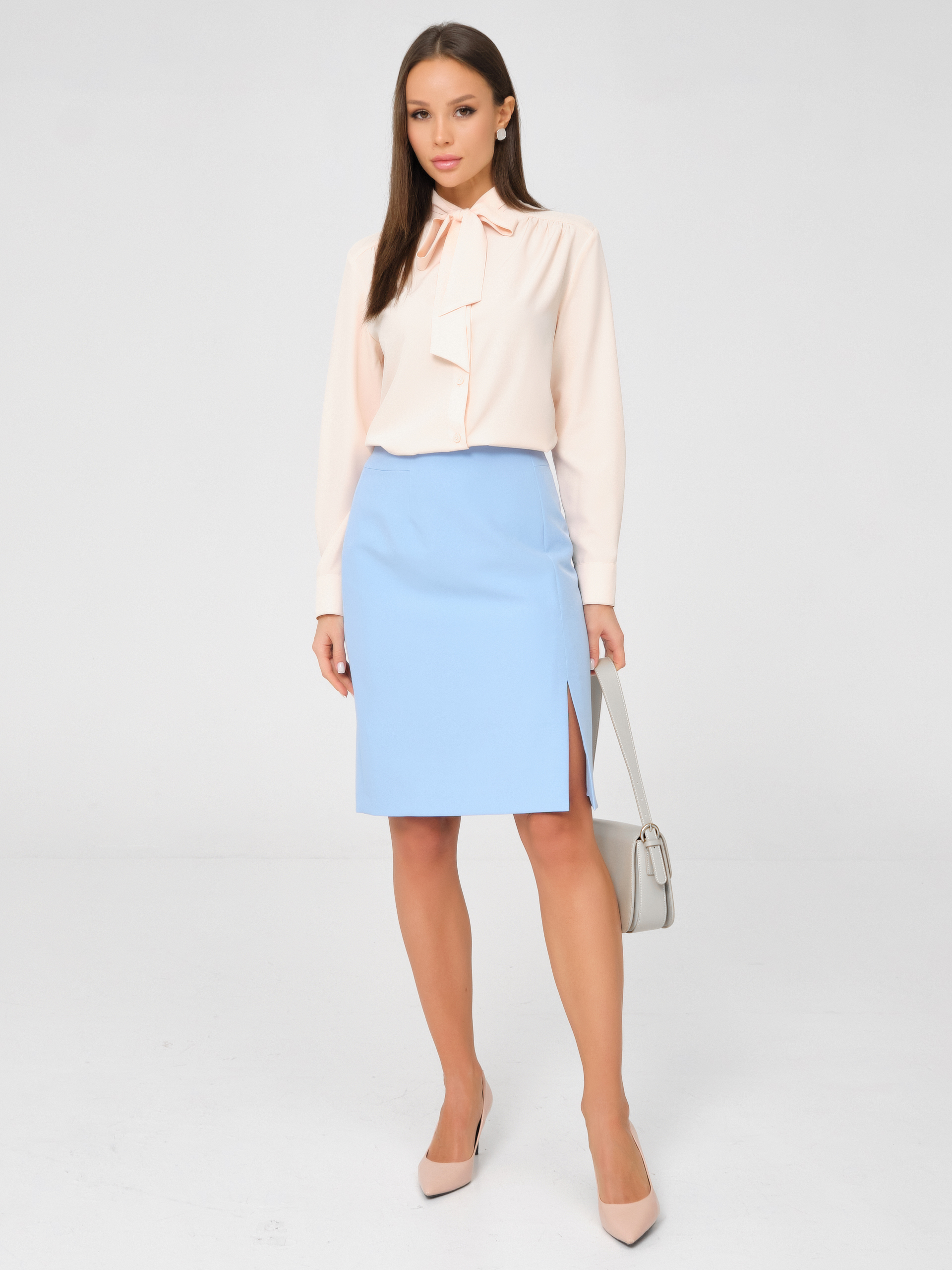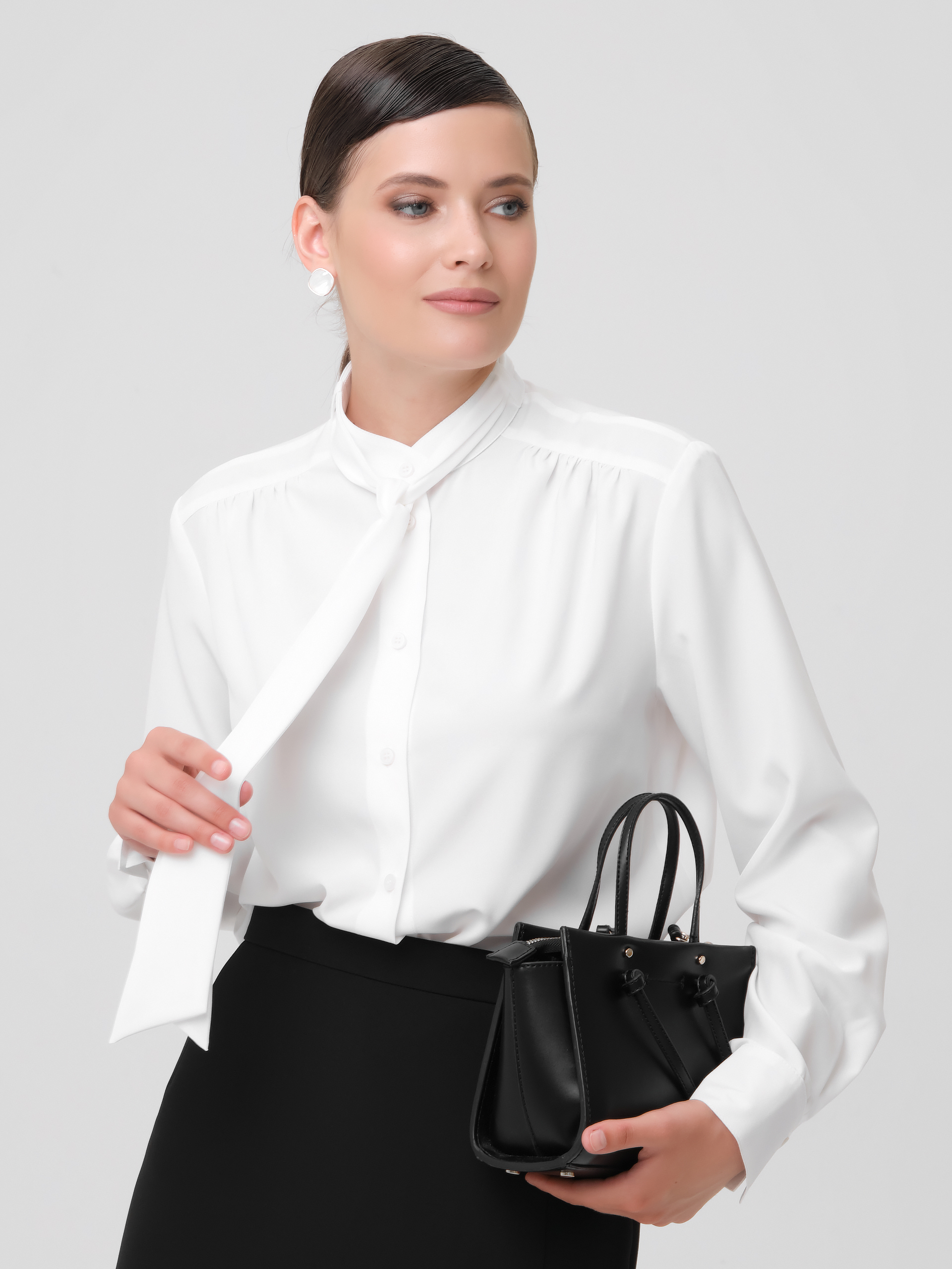 Перед с кокетками, под кокетками сборка. В боковых швах разрезы. По низу рукава разрез, защипы и манжета с застёжкой на пуговицу. В шлёвки на воротнике стойке вставлен съёмный завязывающийся бант.