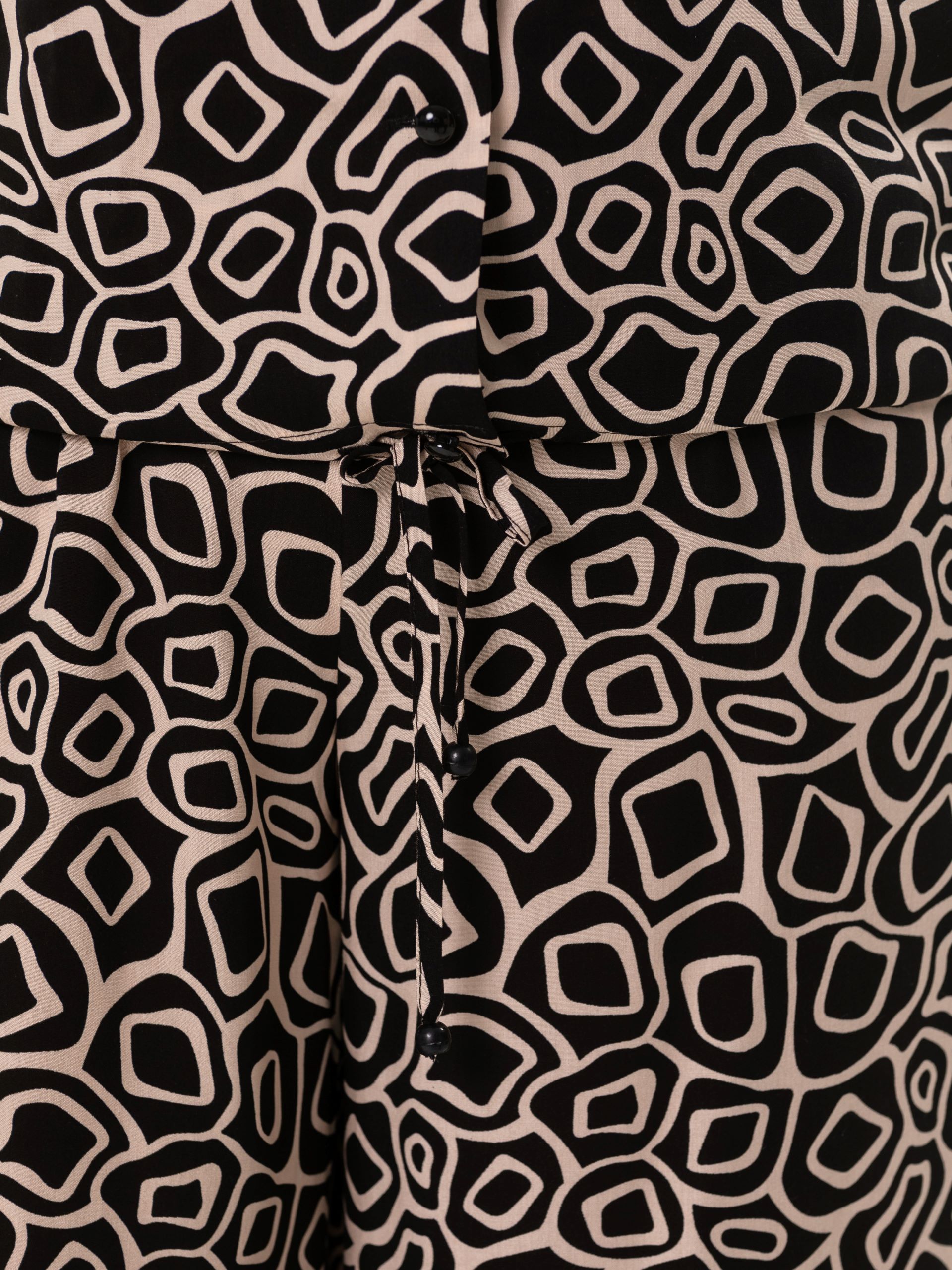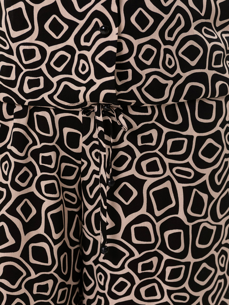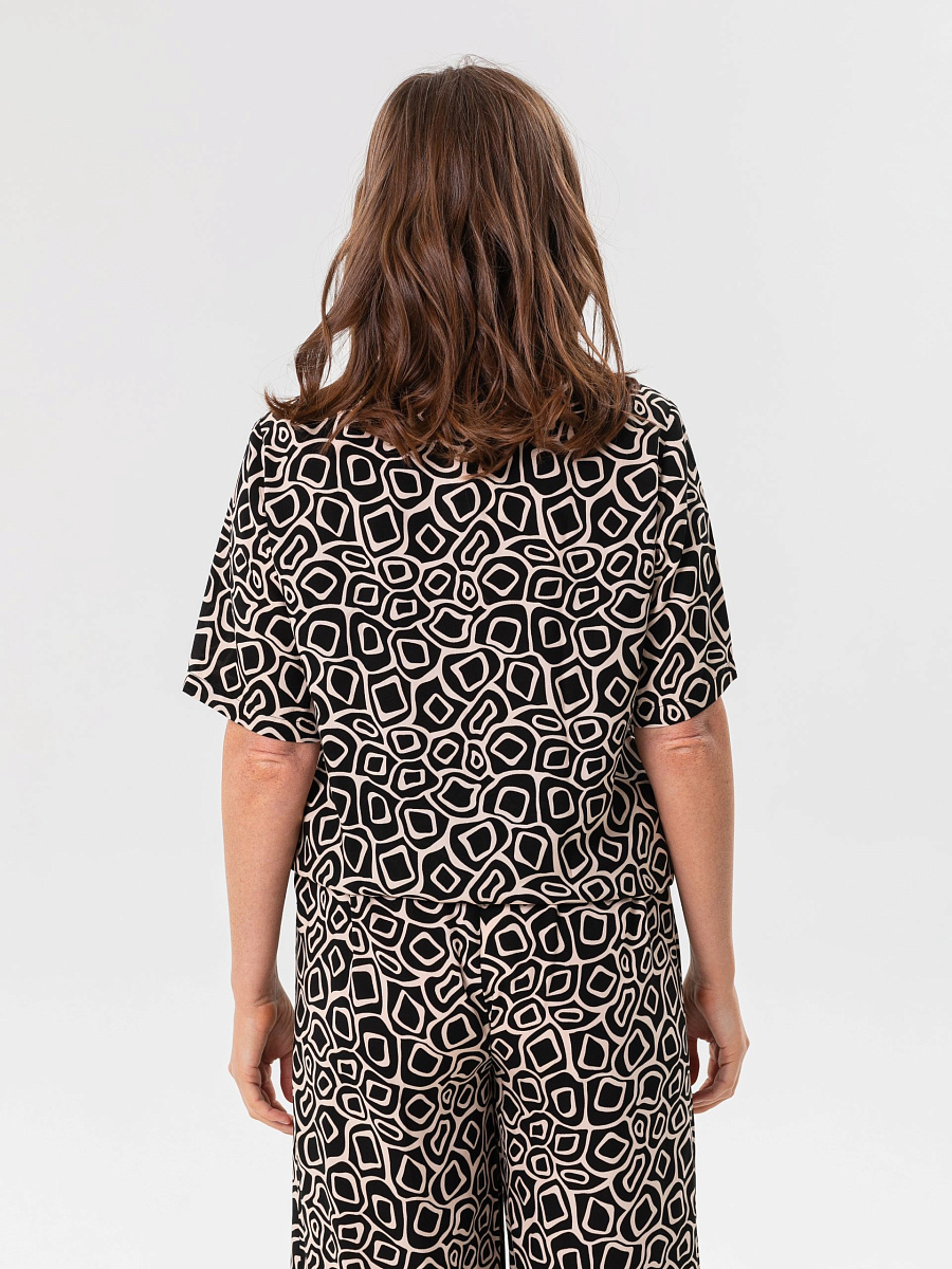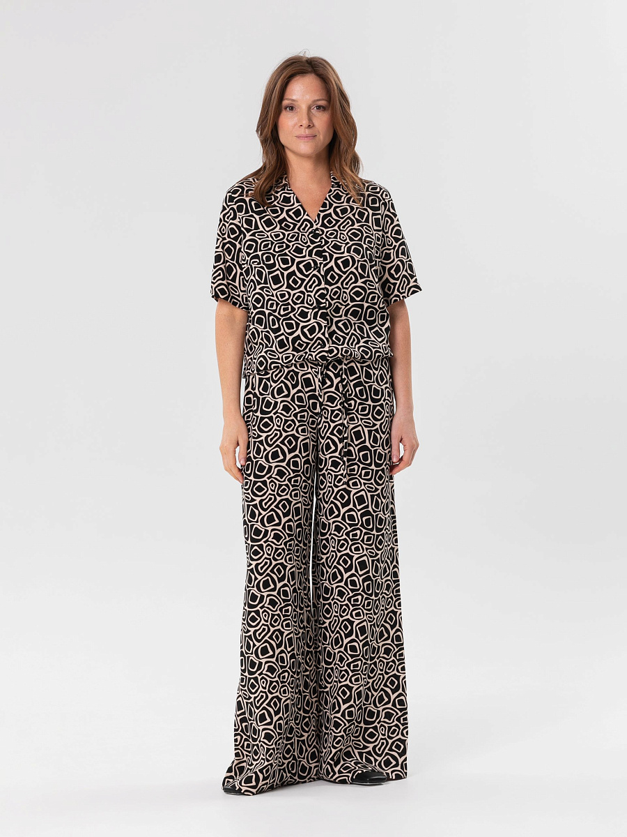 Модель прямого силуэта с застёжкой на петли и пуговицы. V-образный вырез горловины. Воротник отложной. По низу блузки кулиса, в которую вставлен шнурок из основной ткани с наконечниками.
