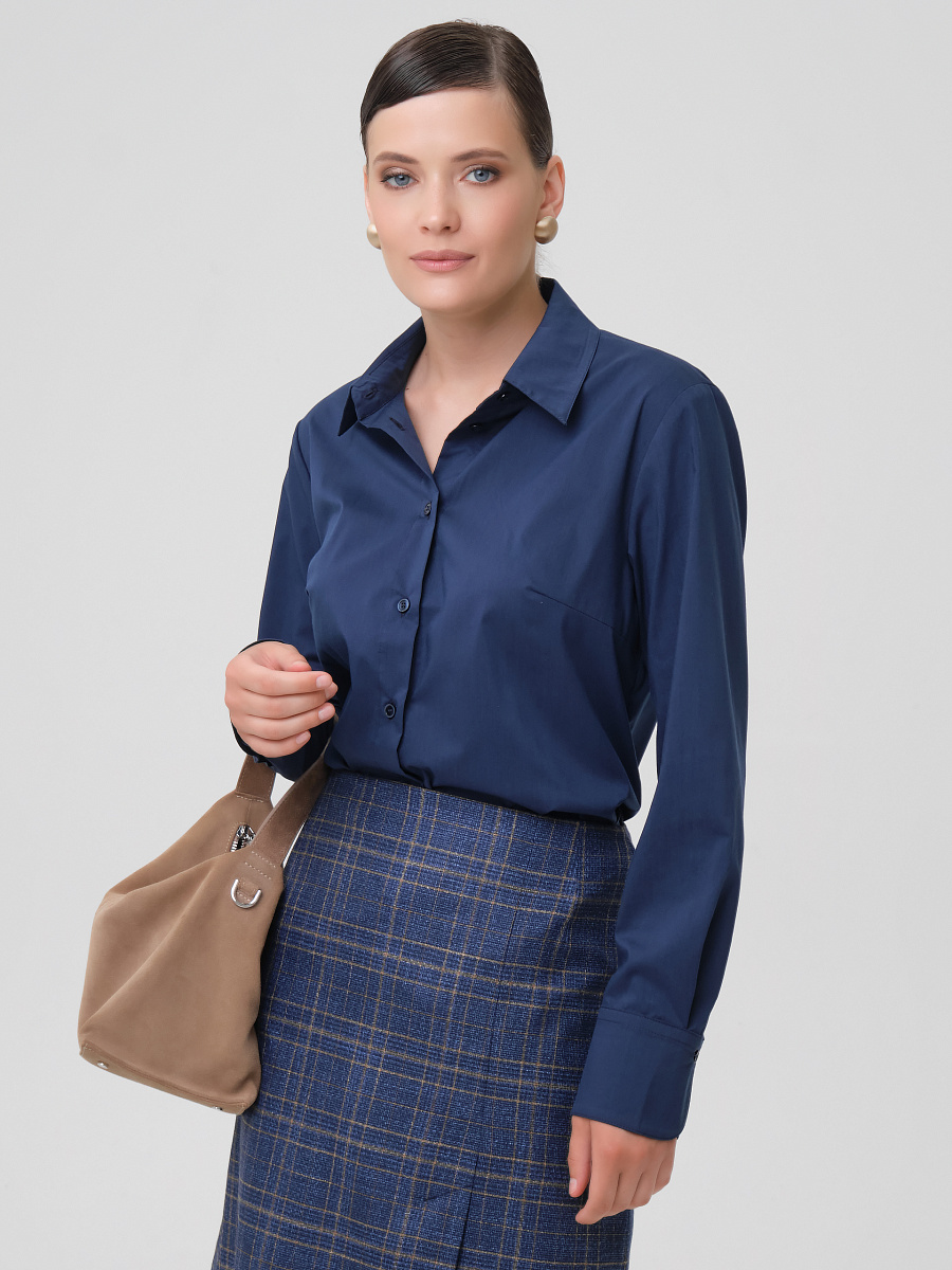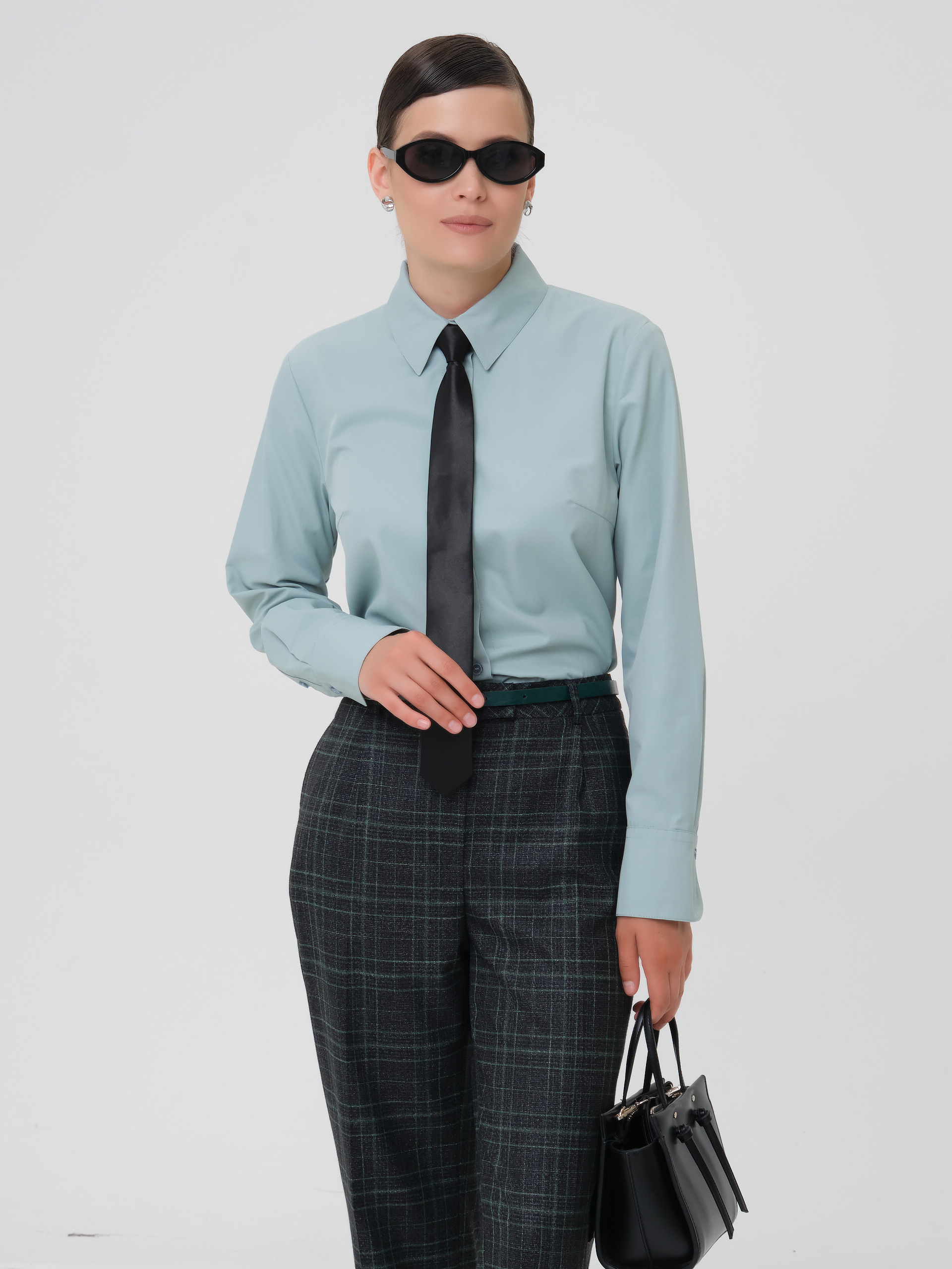 Модель прямого силуэта. Спереди застёжка на петли и пуговицы. В среднем шве спинки обработаны разрезы. Воротник сорочечный. По низу рукава защип, планка и закруглённая манжета с застёжкой на пуговицы.