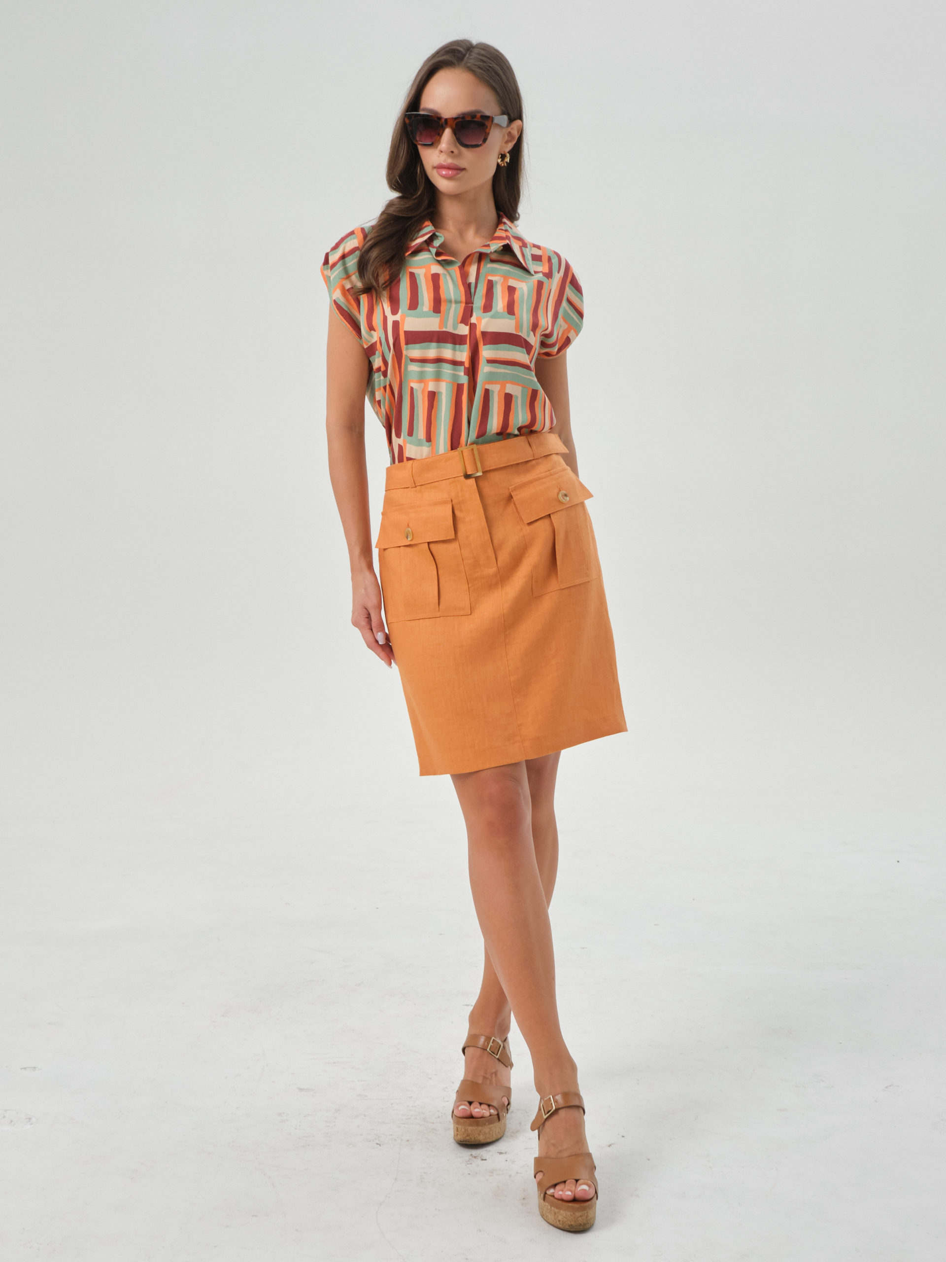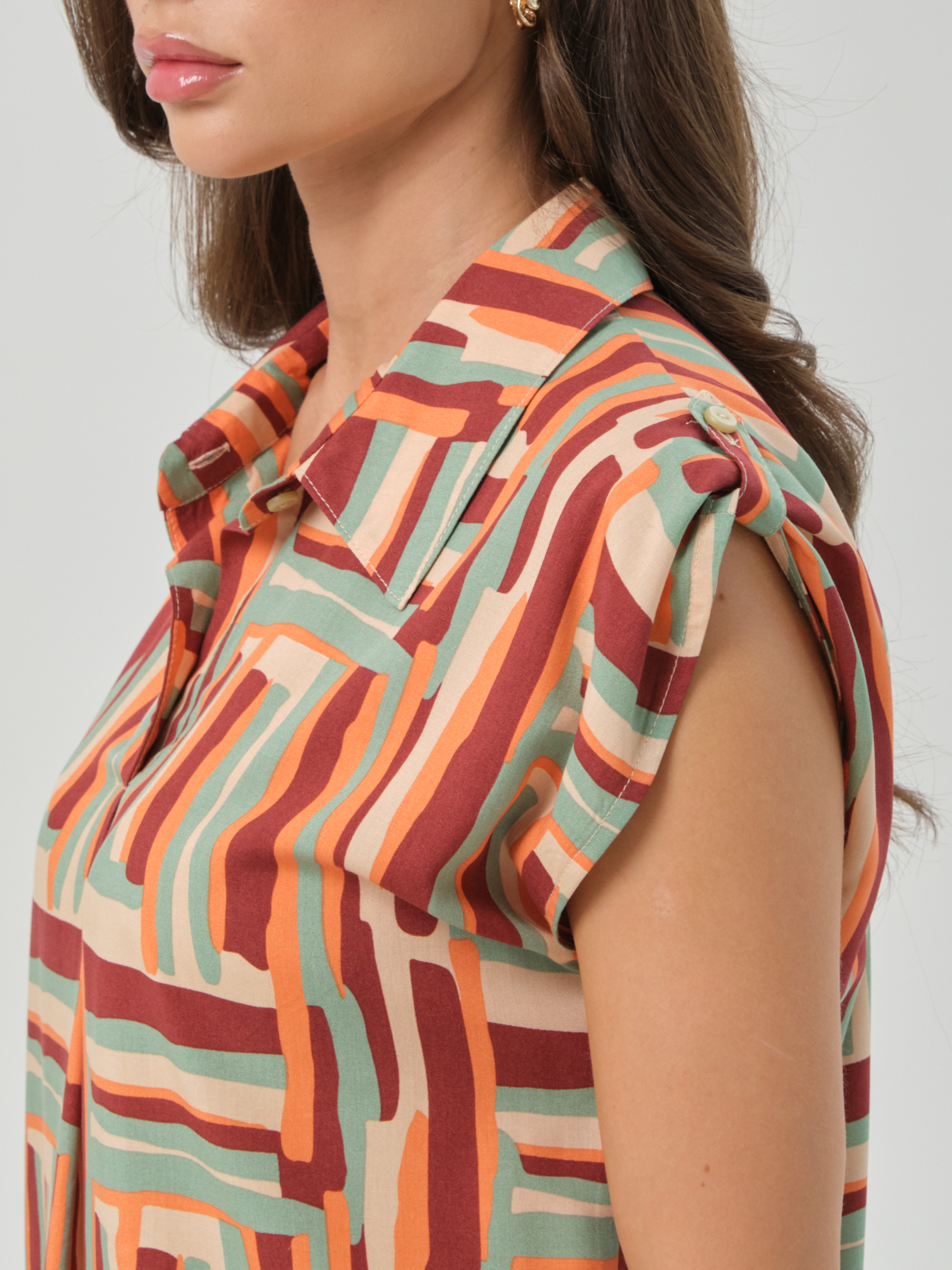 Модель прямого силуэта. В верхней части переда обработана планка, под планкой заложена складка. Воротник сорочейный. Застежка на стойке на петлю и пуговицу. Рукав короткий цельнокроеный, с патой, застёгивающейся на пуговицу. В боковых швах небольшие разрезы.