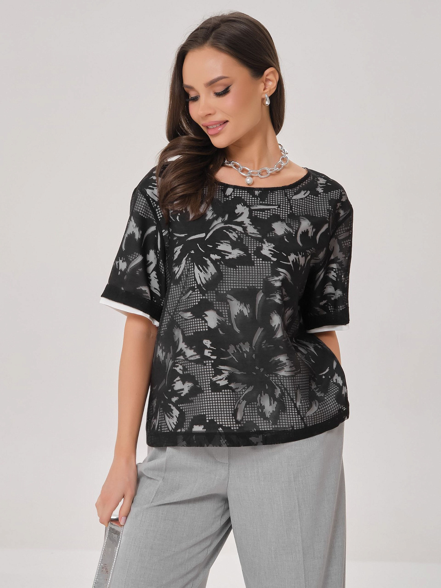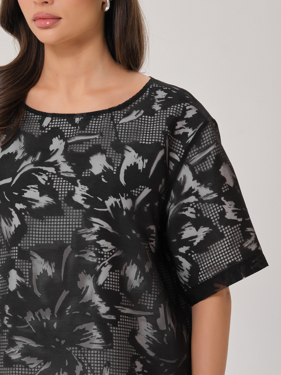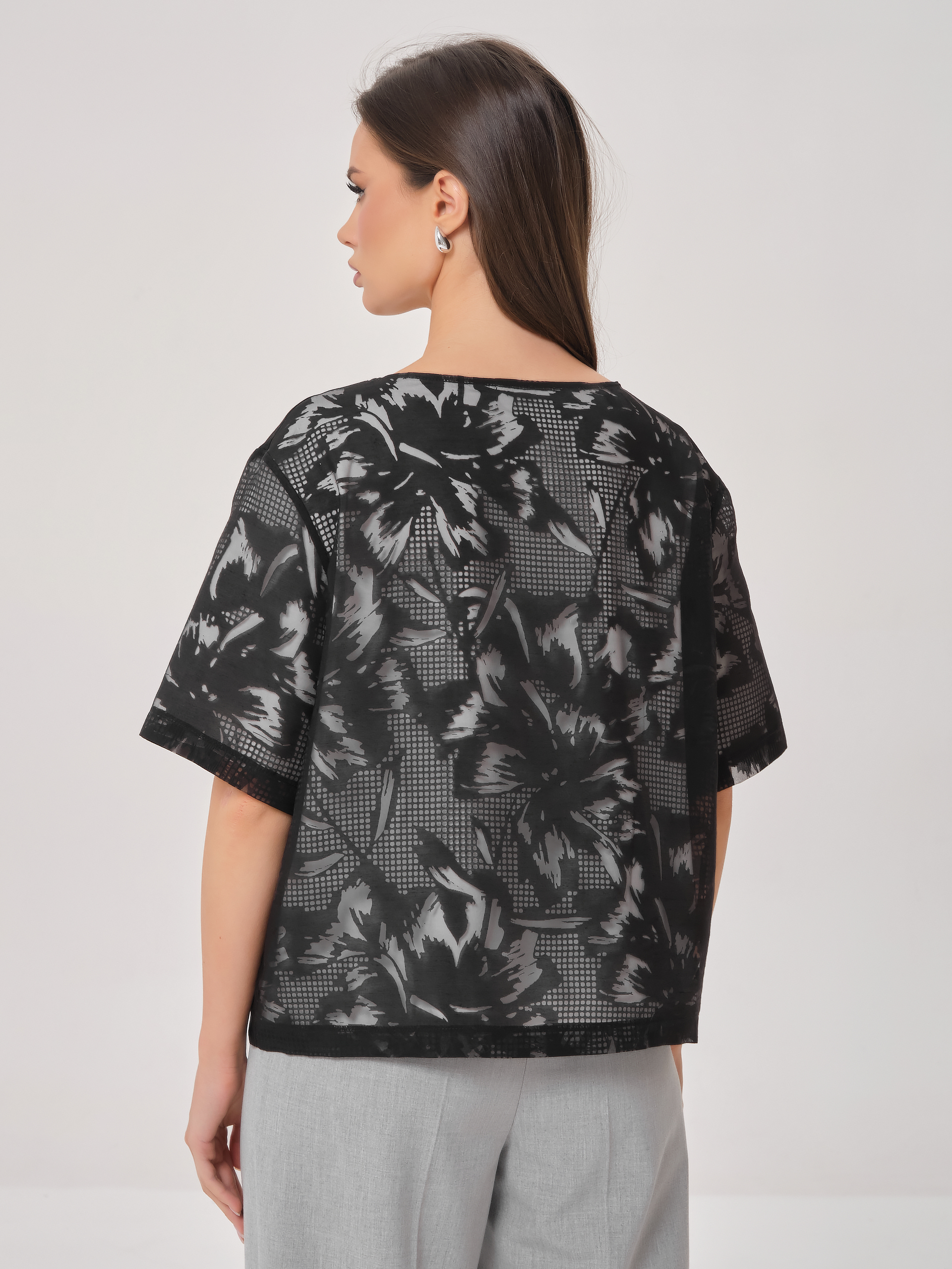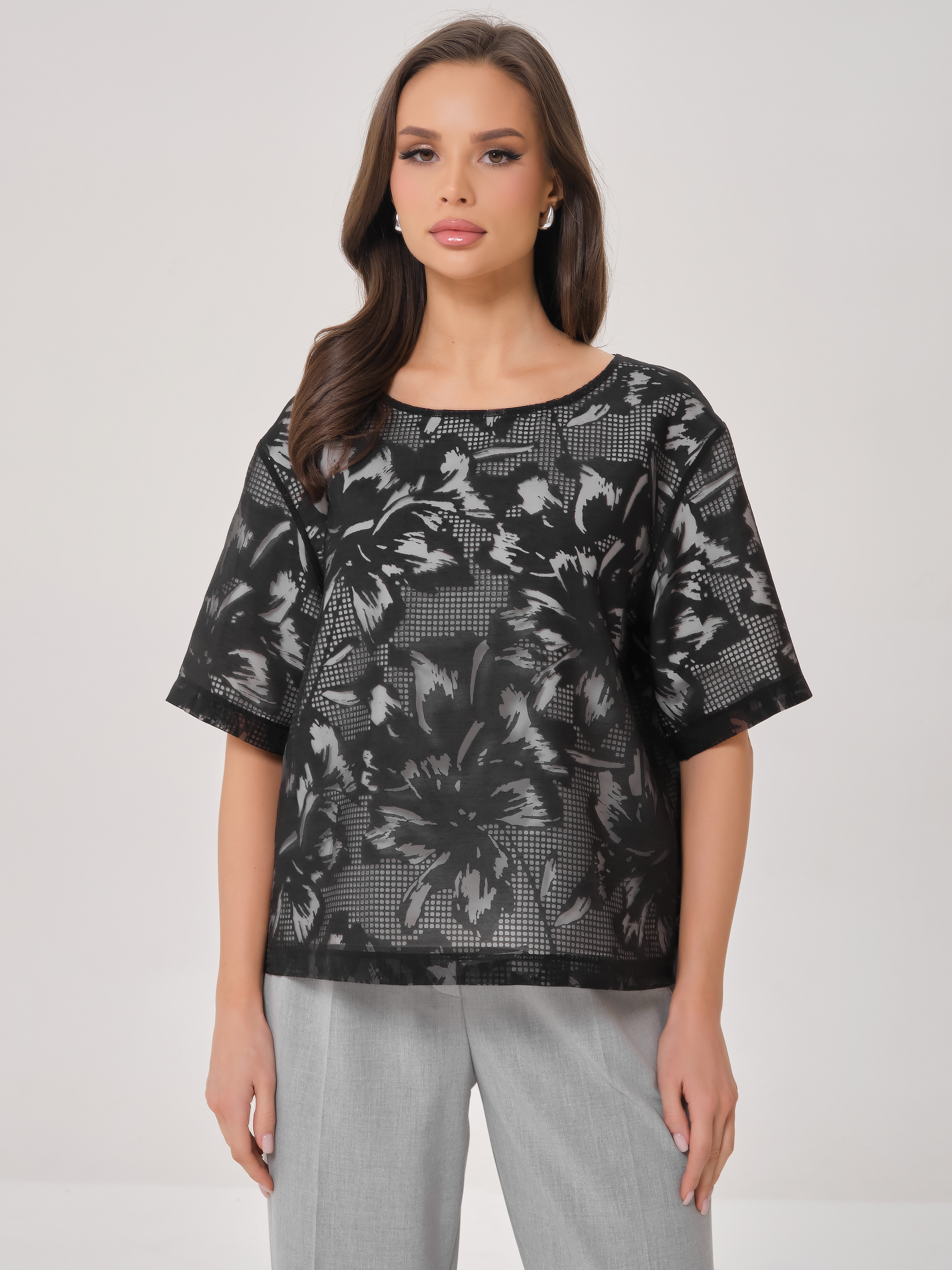 Блузка из органзы с вытравной печатью. Вытравная печать сохраняет дышащие свойства текстиля. Даже при носке одежды в жару кожа дышит.