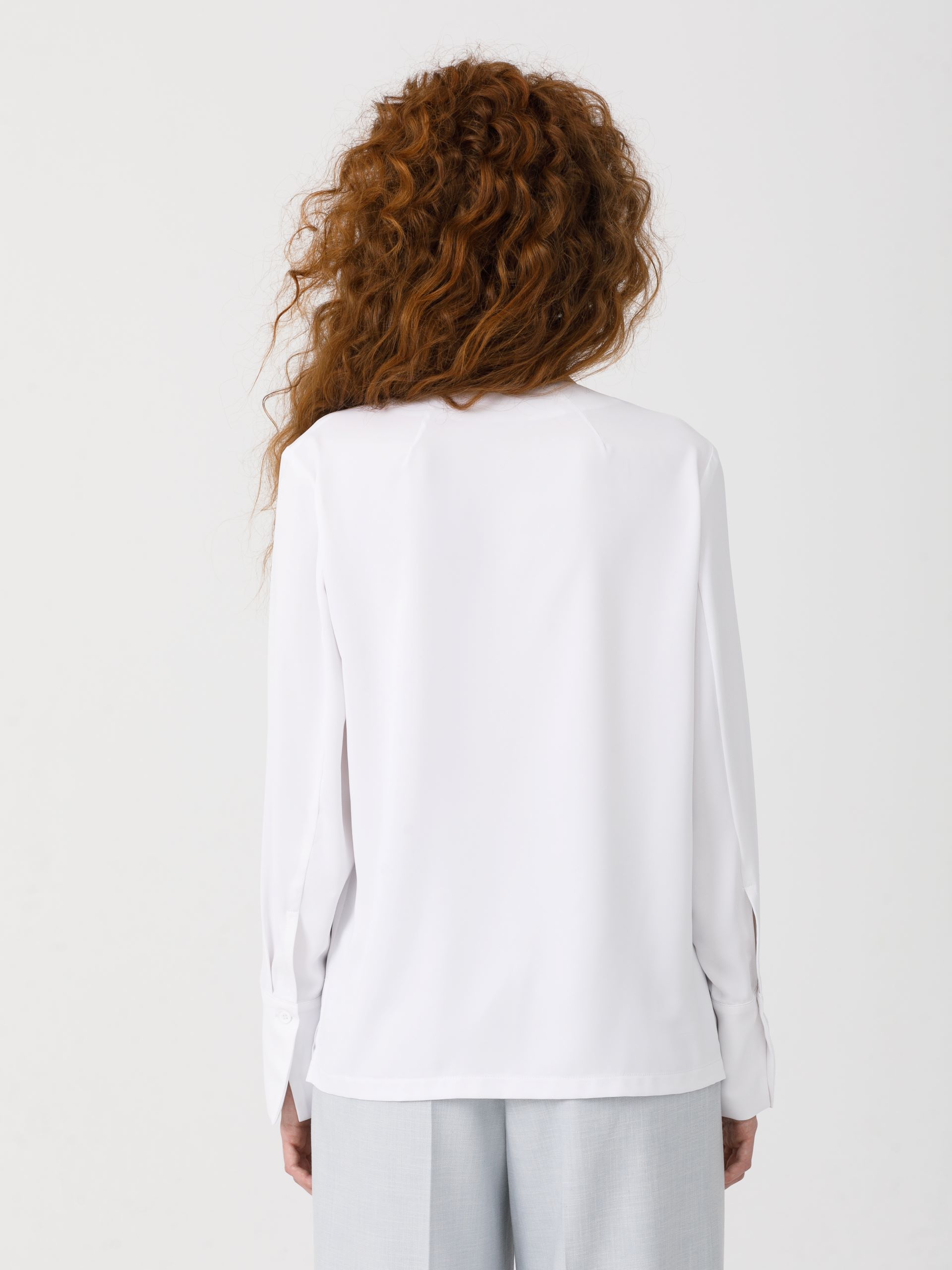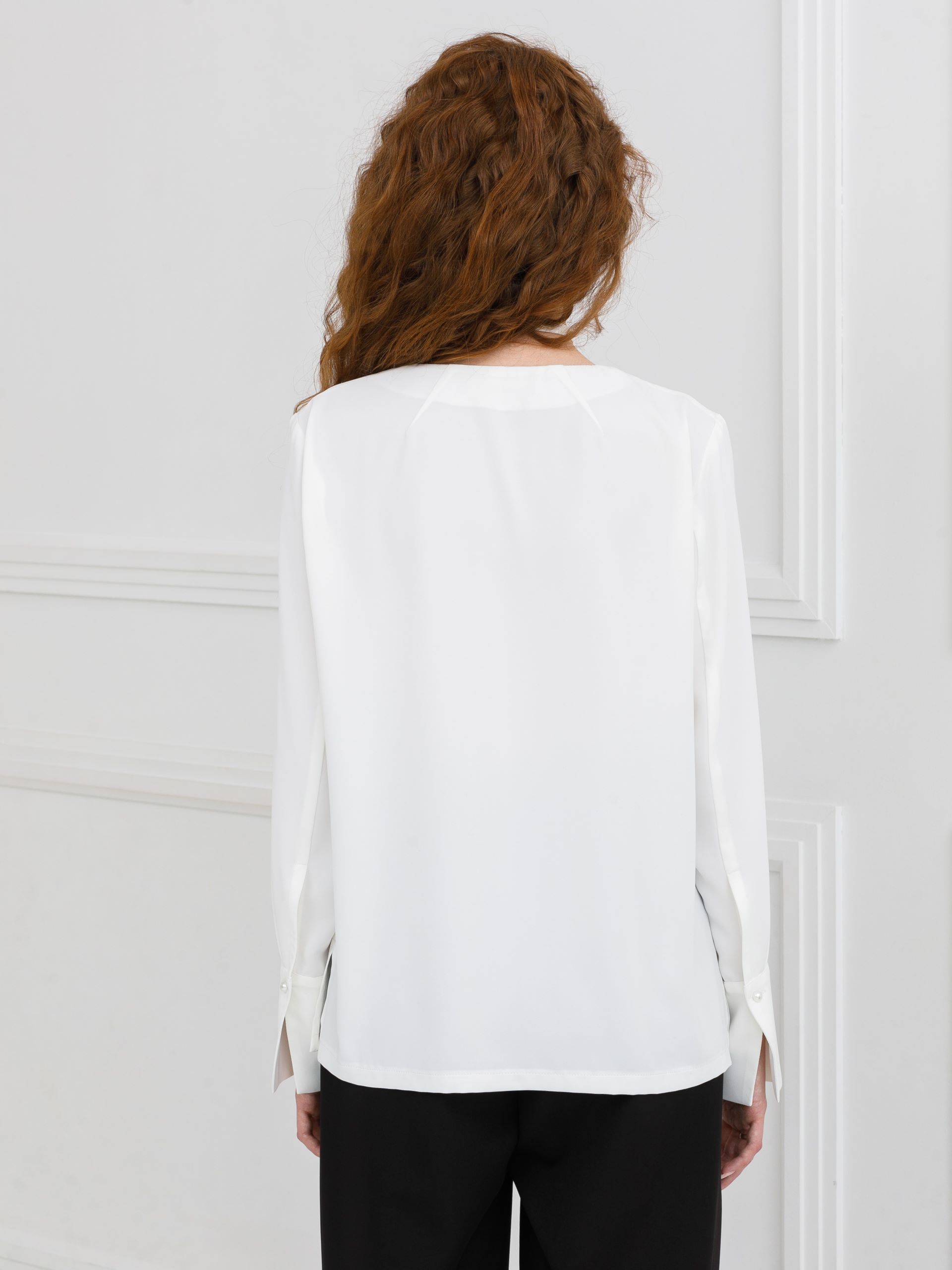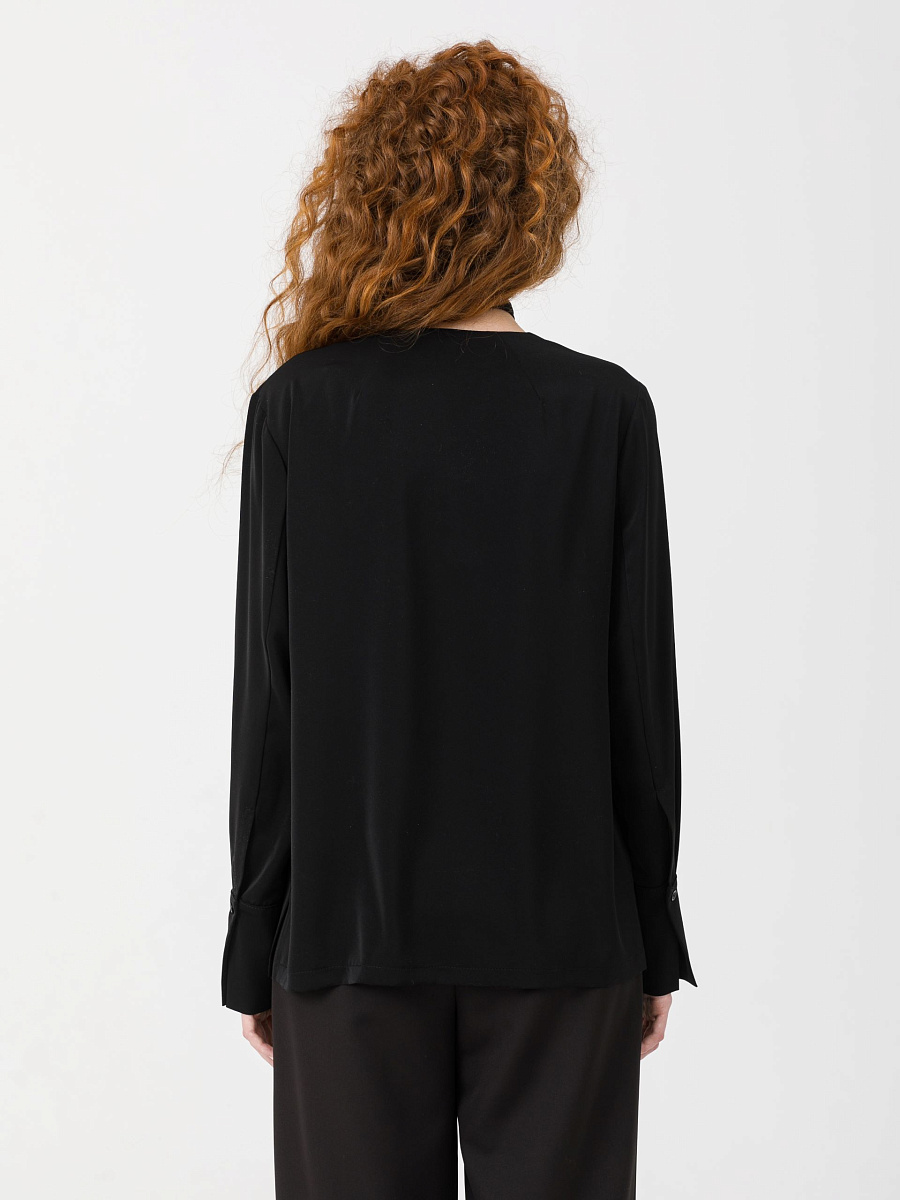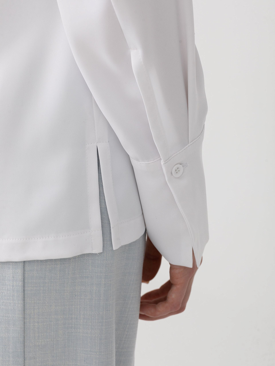 Модель прямого силуэта, с длинным рукавом, без застёжки. Перед со средним швом и застроченными складками по плечевым швам. Вырез горловины V-образный. По низу рукава разрез, защип и манжета с застёжкой на пуговицу. В боковых швах разрезы.