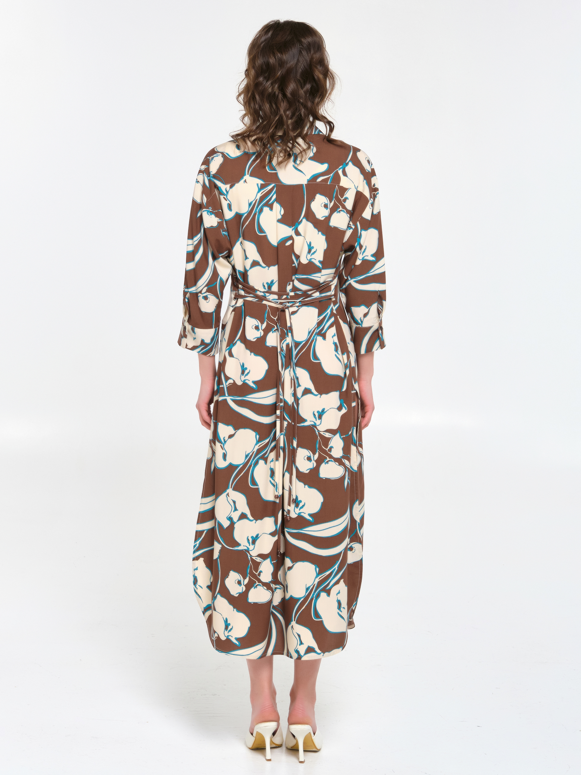 Модель прямого силуэта, со спущенным плечом. Спереди центральная застёжка на петли и пуговицы. Спинка с кокеткой, переходящей на перед. Под кокеткой складка. Воротник сорочечный. По низу рукава разрез, защипы и манжета с застёжкой на пуговицу. В боковых швах разрезы. Низ блузки закруглён. Талия подчёркнута двойным тонким завязывающимся поясом с наконечниками, вставленным в шлёвки.