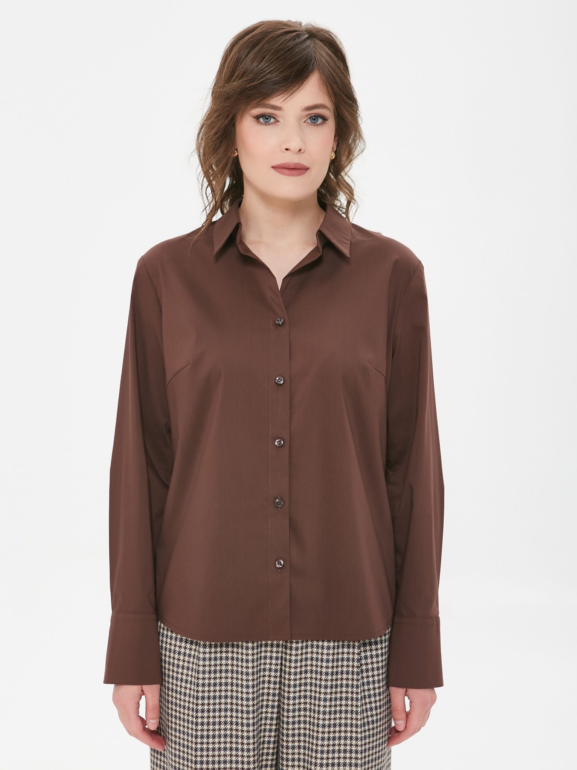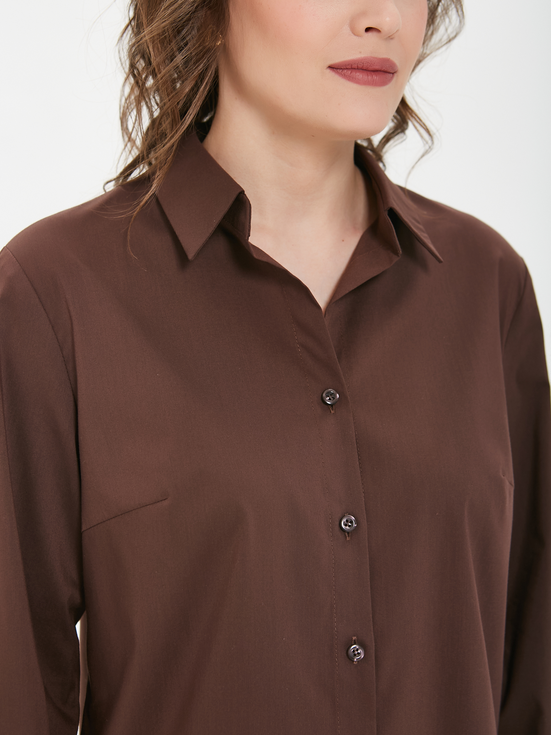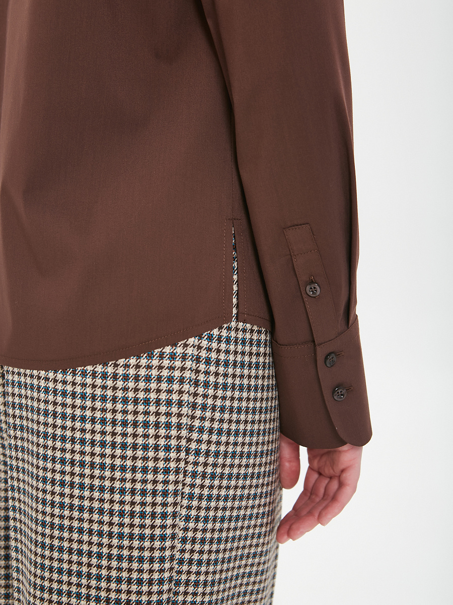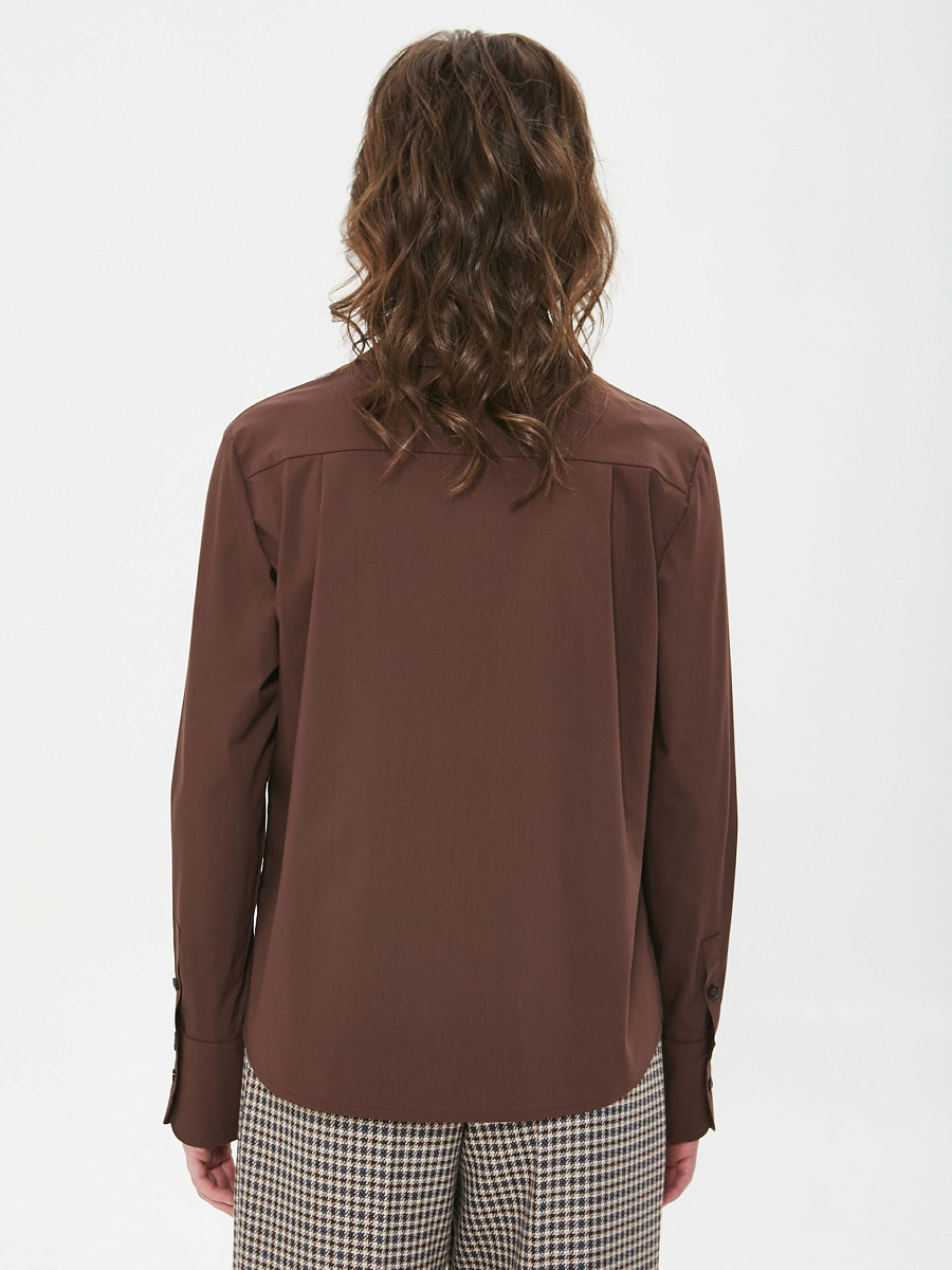Модель полуприлегающего силуэта. Спереди центральная застёжка на петли и пуговицы. Спинка с кокеткой, под кокеткой защипы. Воротник сорочечный. По низу рукава защип, планка и закруглённая манжета с застёжкой на пуговицы. В боковых швах небольние разрезы. Низ блузки фигурный.