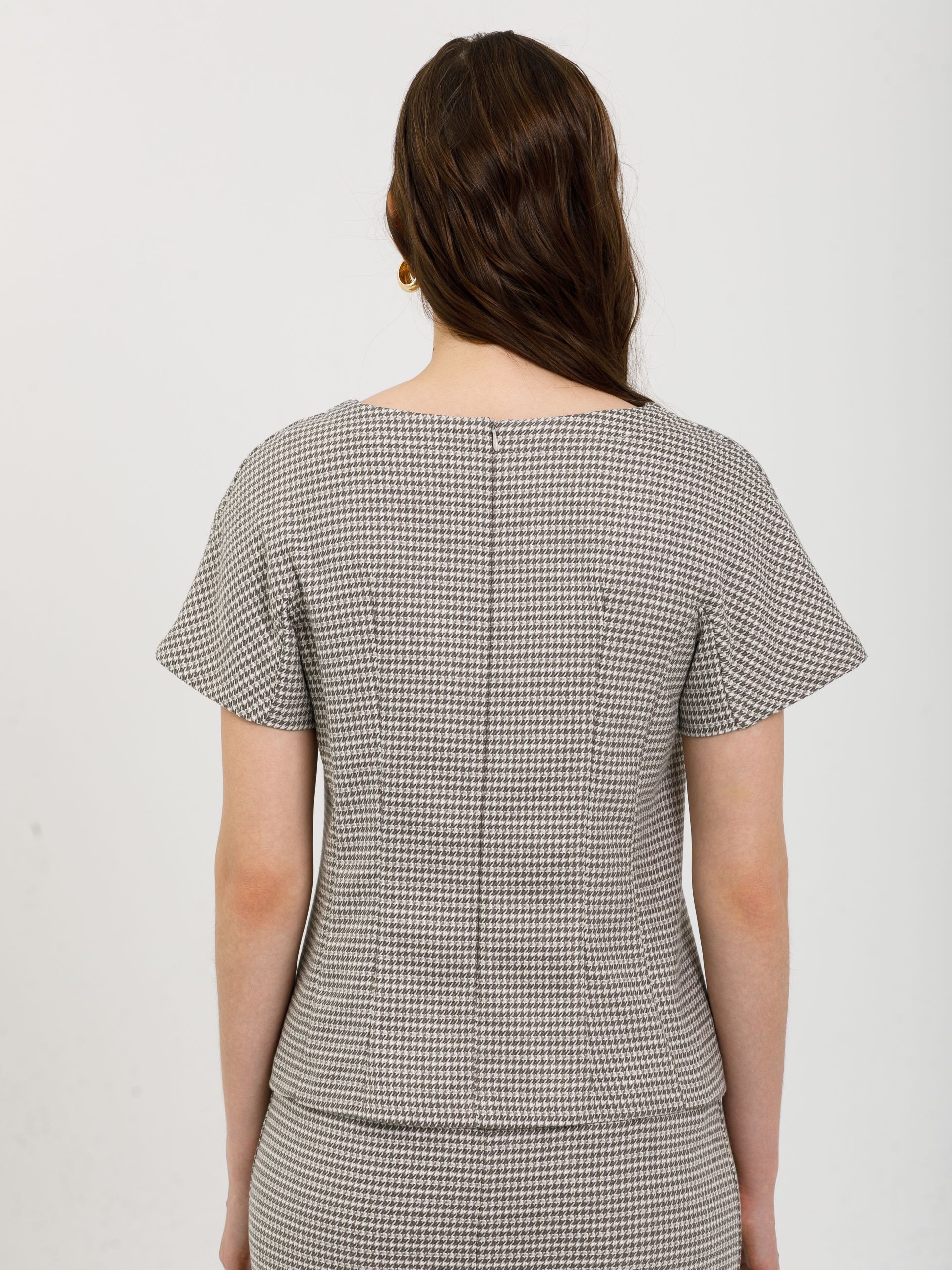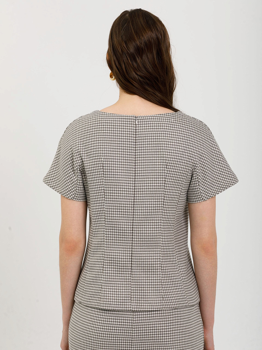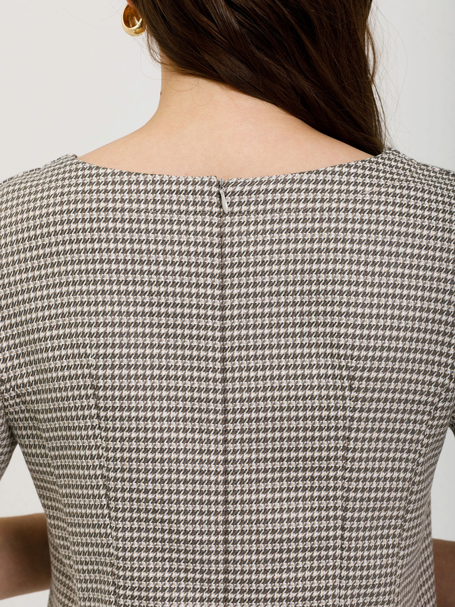 Модель полуприлегающего силуэта, с рельефами, без боковых швов. В среднем шве спинки потайная застёжка молния. Рукав короткий, с ластовицей.