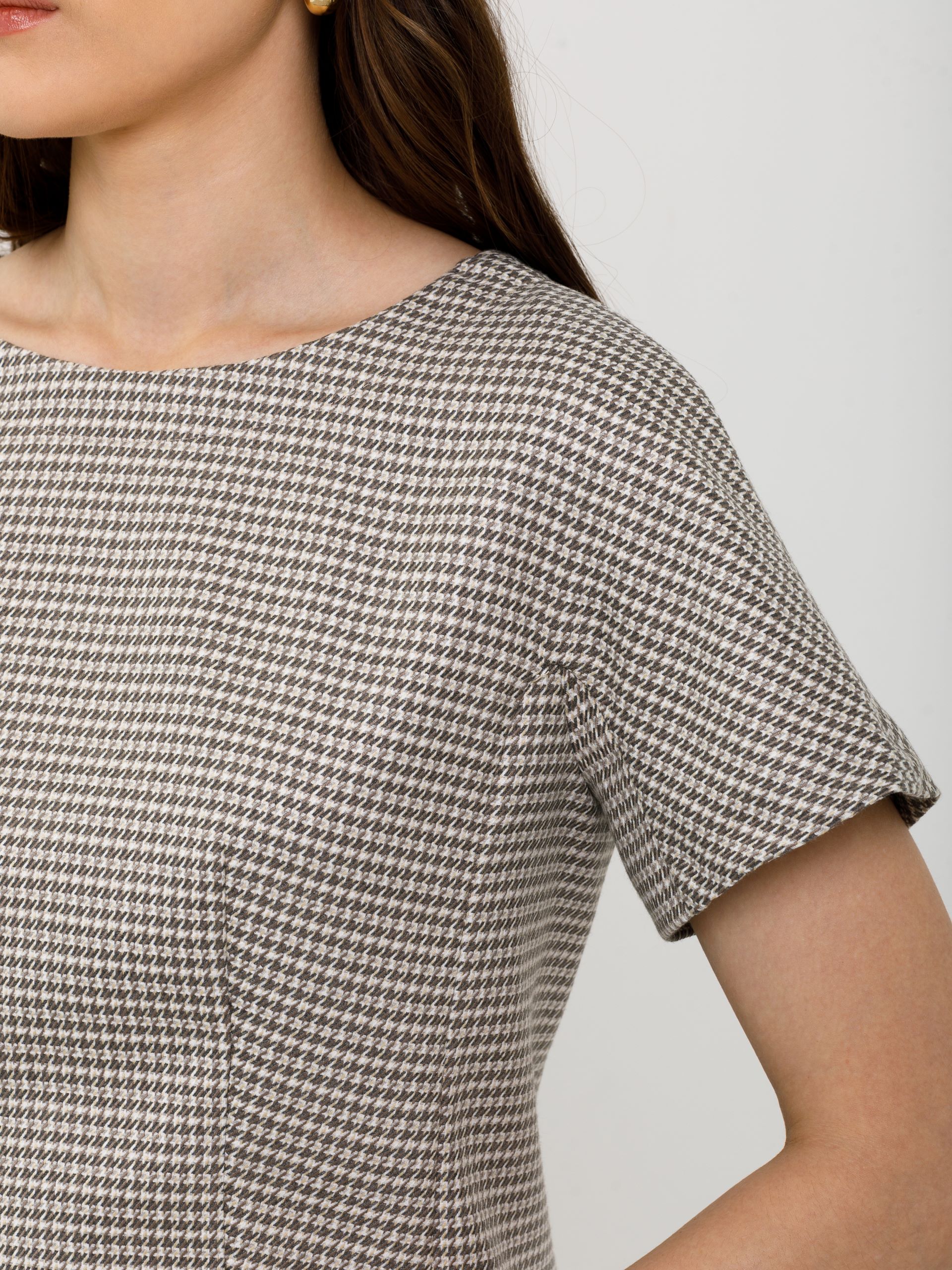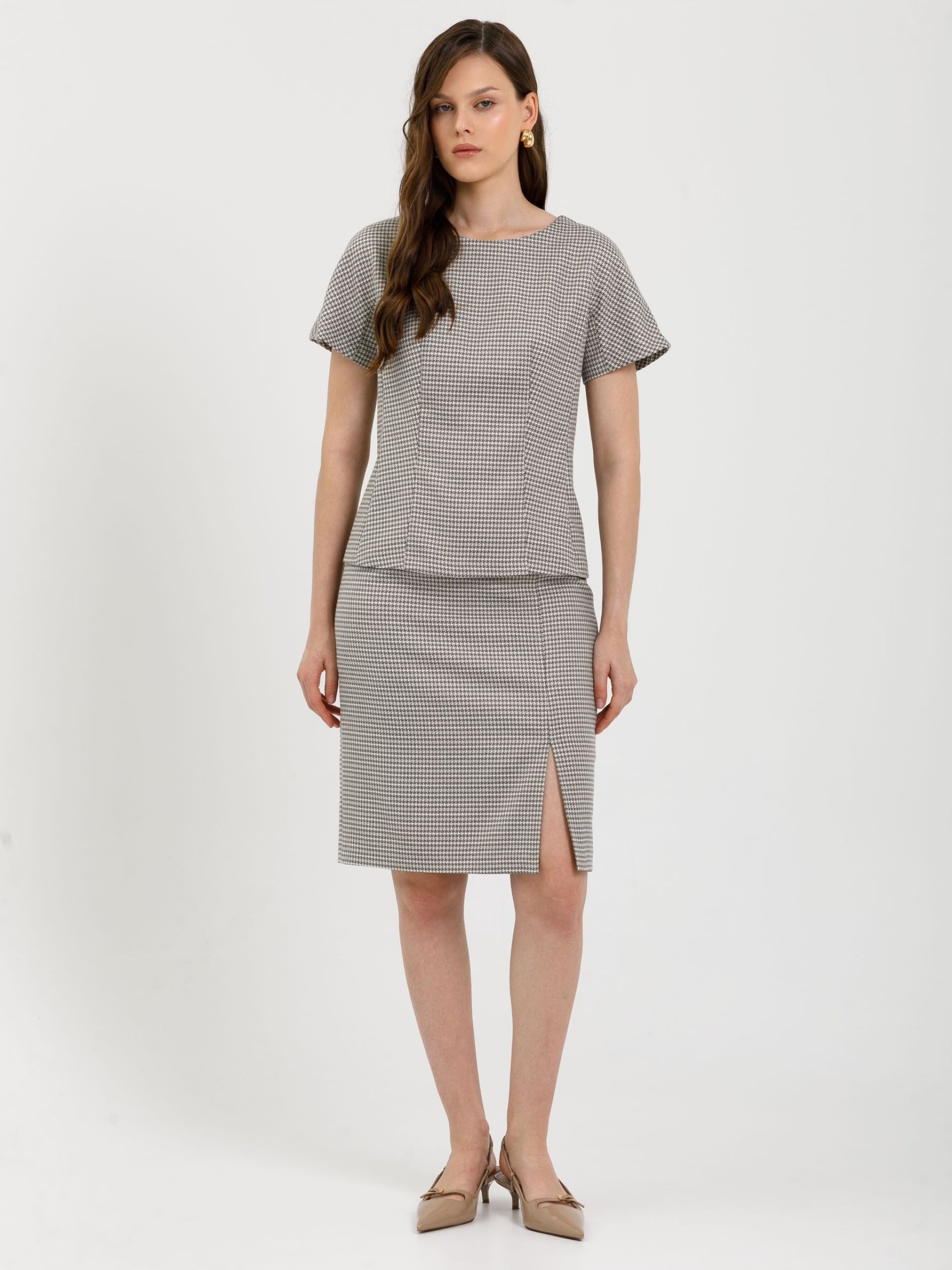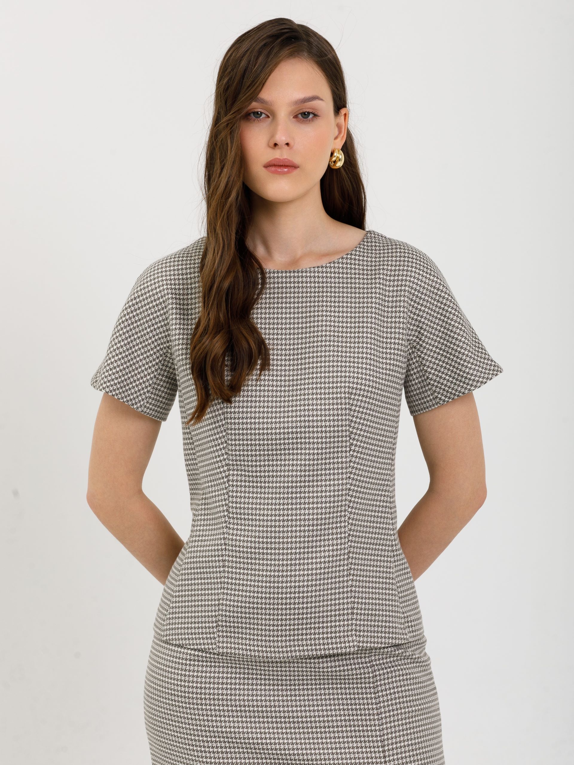 Модель полуприлегающего силуэта, с рельефами, без боковых швов. В среднем шве спинки потайная застёжка молния. Рукав короткий, с ластовицей.