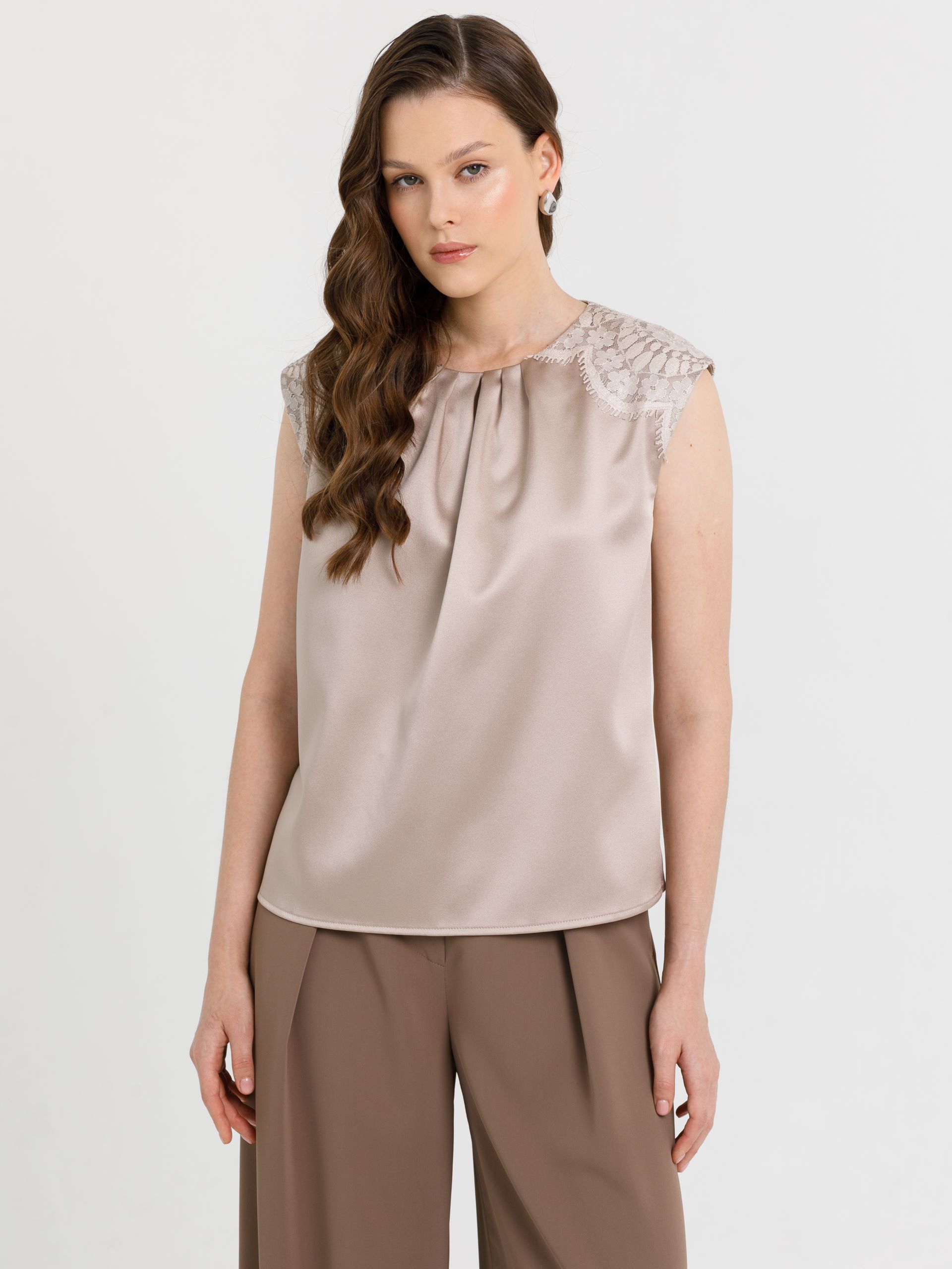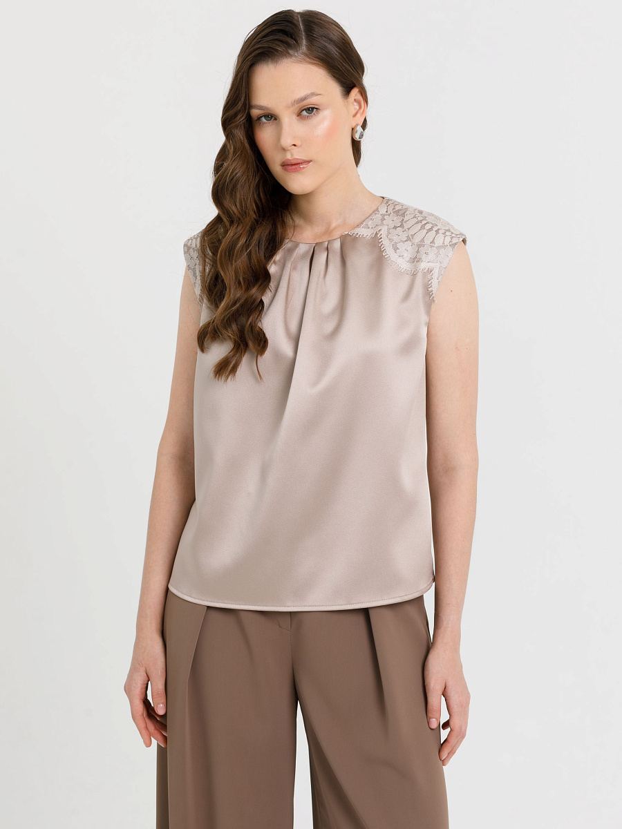 Модель полуприлегающего силуэта, со спущенным плечом и настроченными фигурными кокетками из кружева. Спереди по горловине заложена группа складок. Сзади вырез "капелька" и застёжка на пуговицу и воздушную петлю. В боковых швах небольшие разрезы.