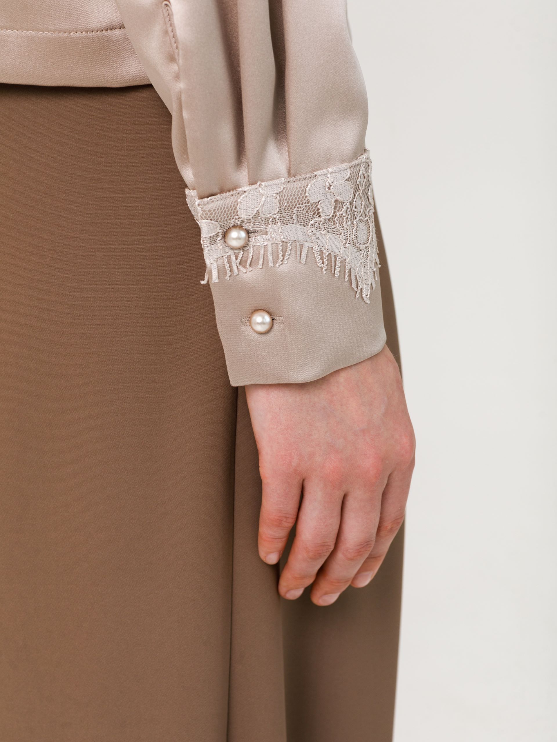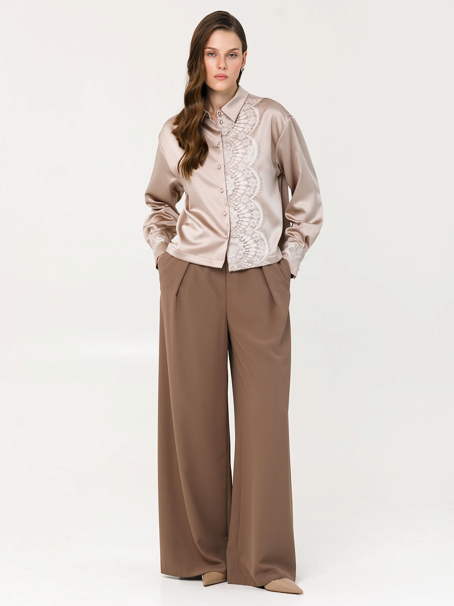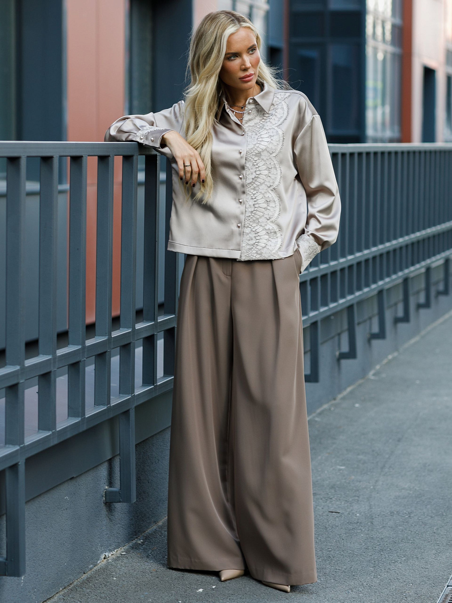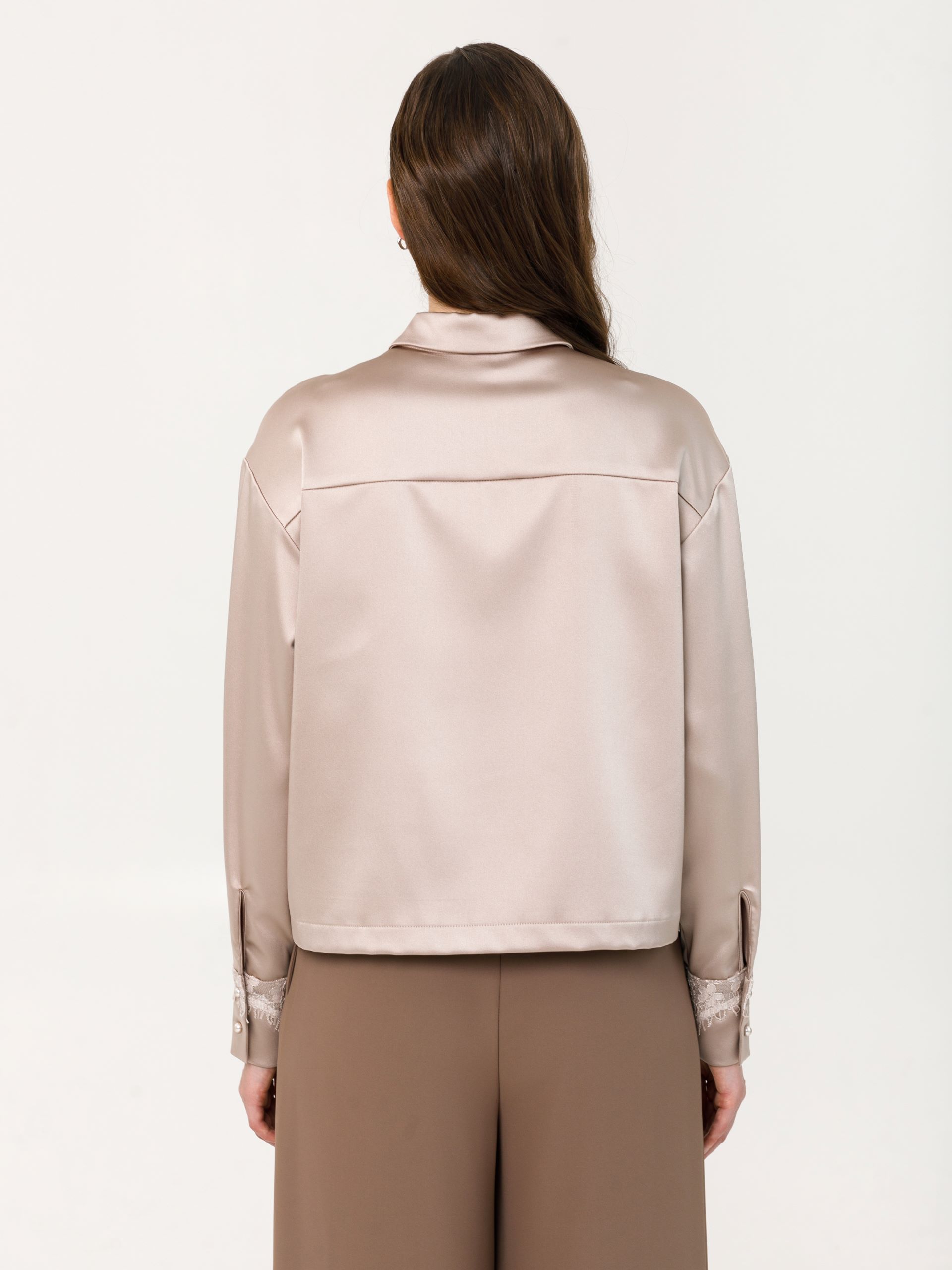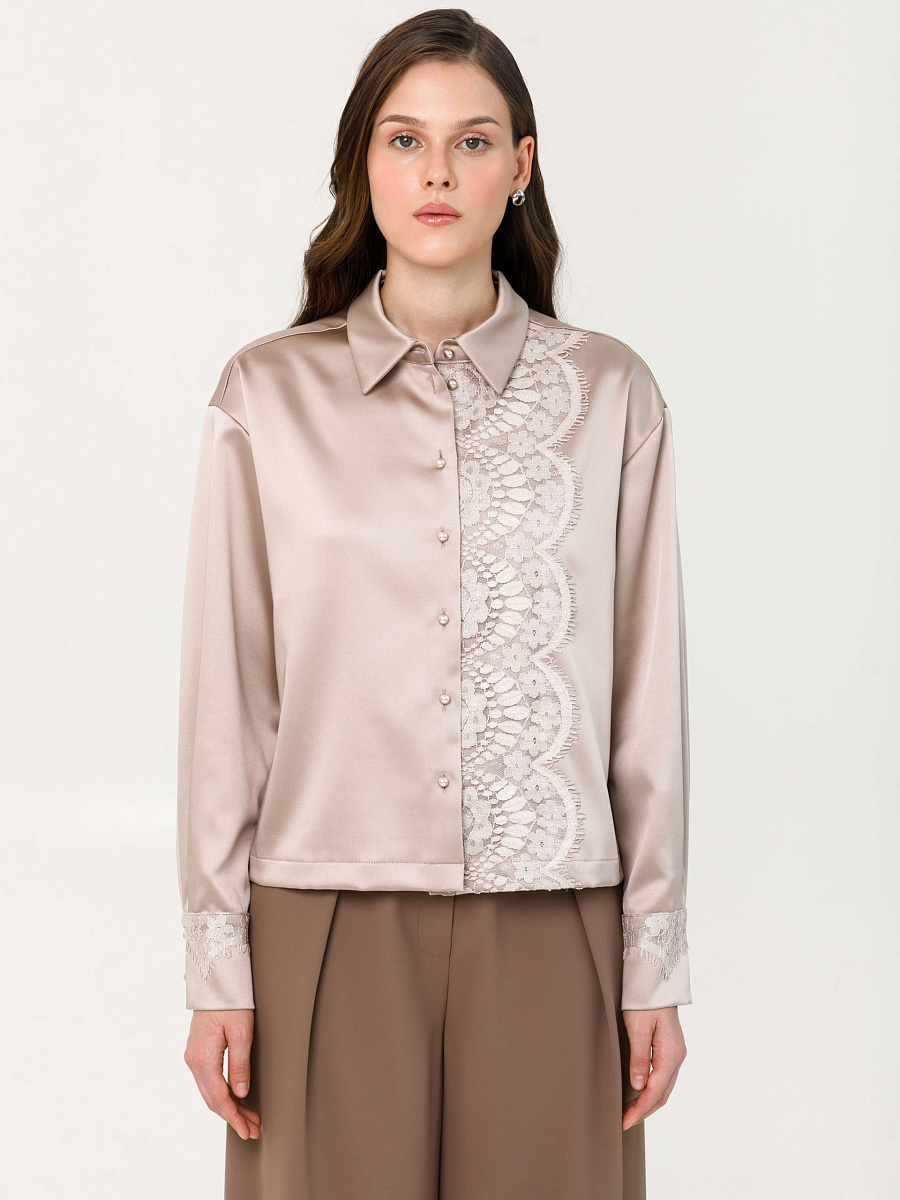 Модель прямого силуэта, со спущенным плечом. Спереди центральная застёжка на петли и пуговицы. Спинка с кокеткой. Воротник сорочечный. По низу рукава разрез, защипы и манжета с застёжкой на пуговицы. Слева по переду и на манжетах настрочено декоративное кружево.