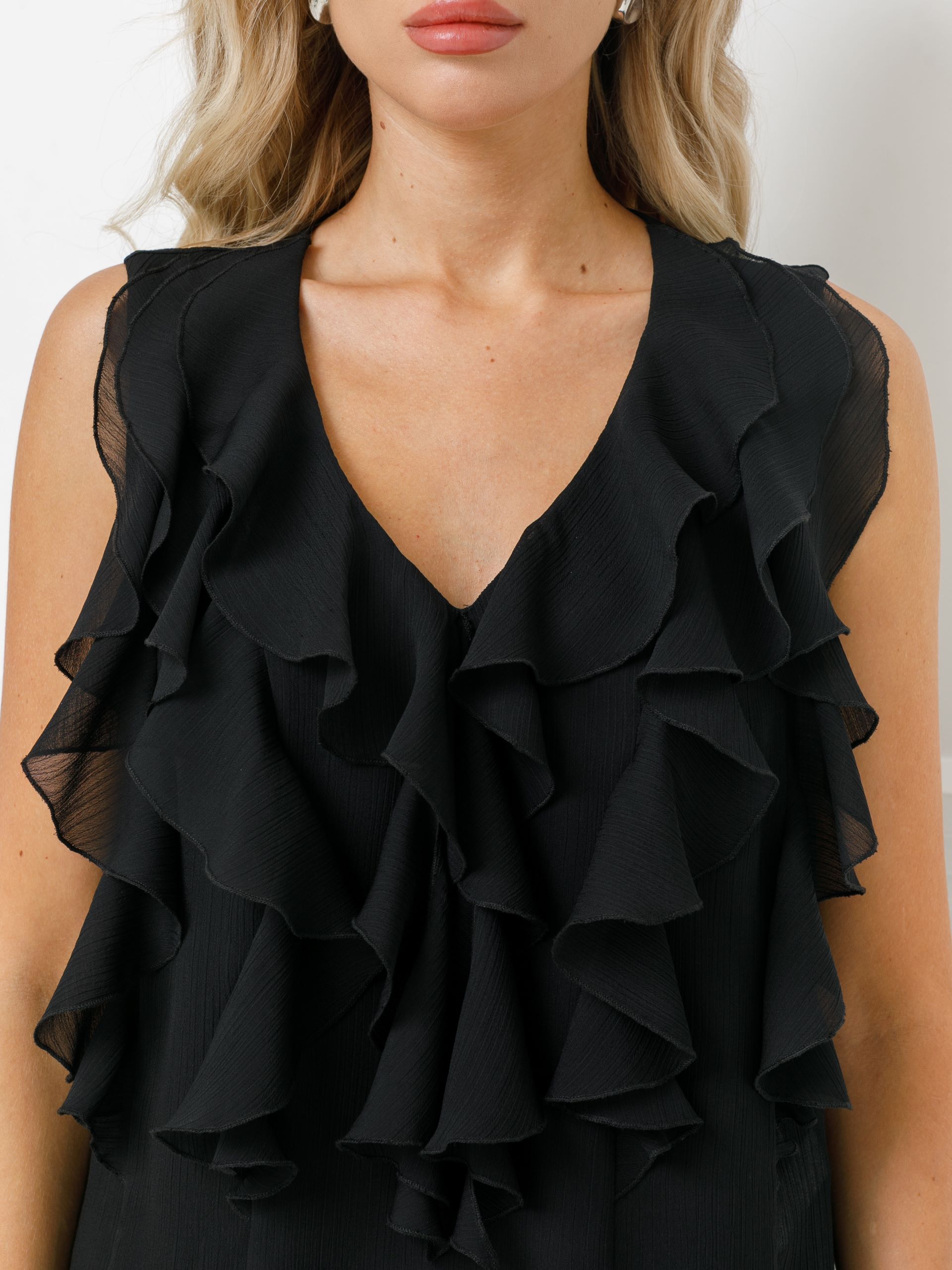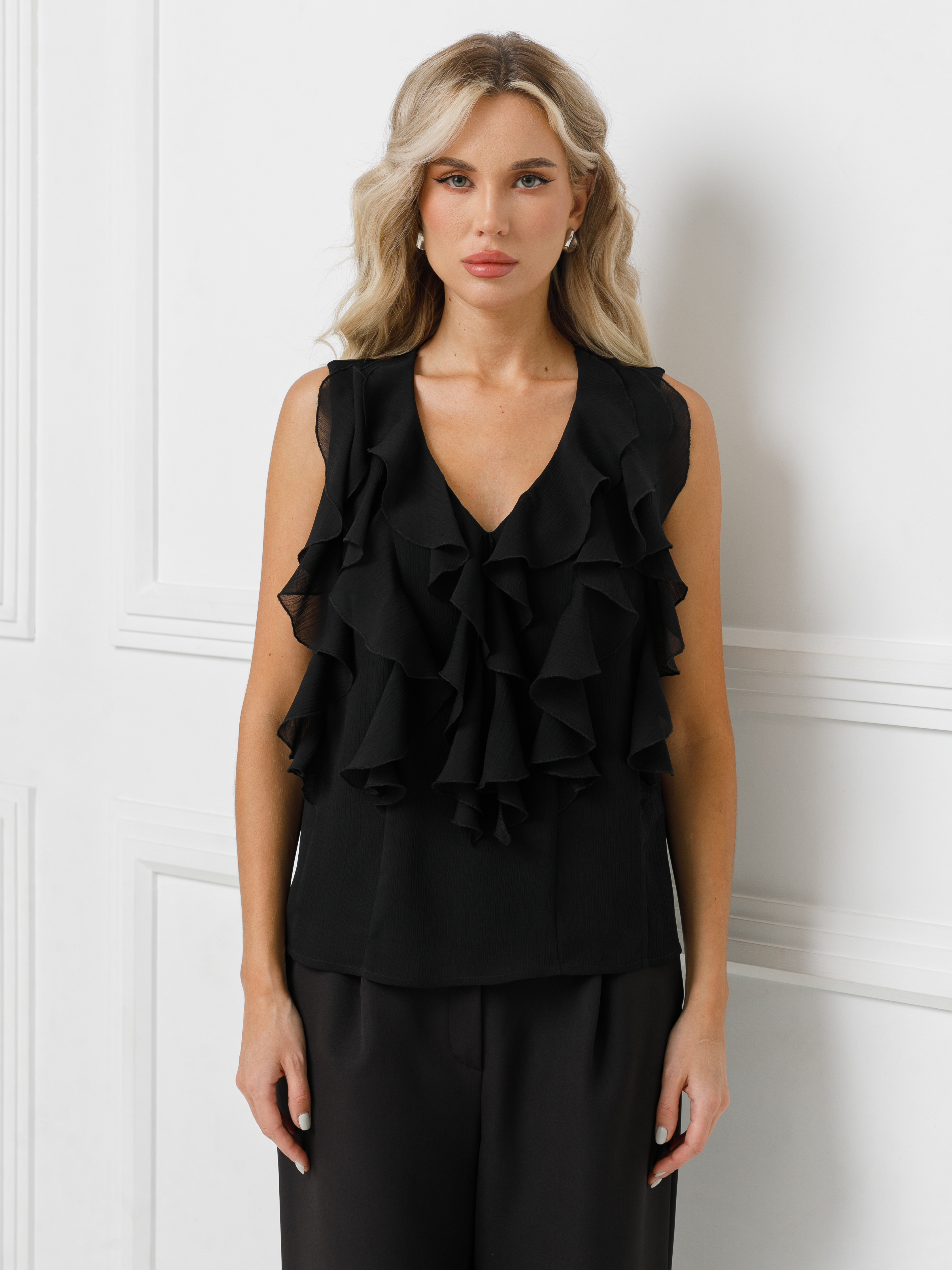 Модель прямого силуэта, на подкладе, без застёжки. Перед с рельефами и средним швом. Блузка декорирована воланами.