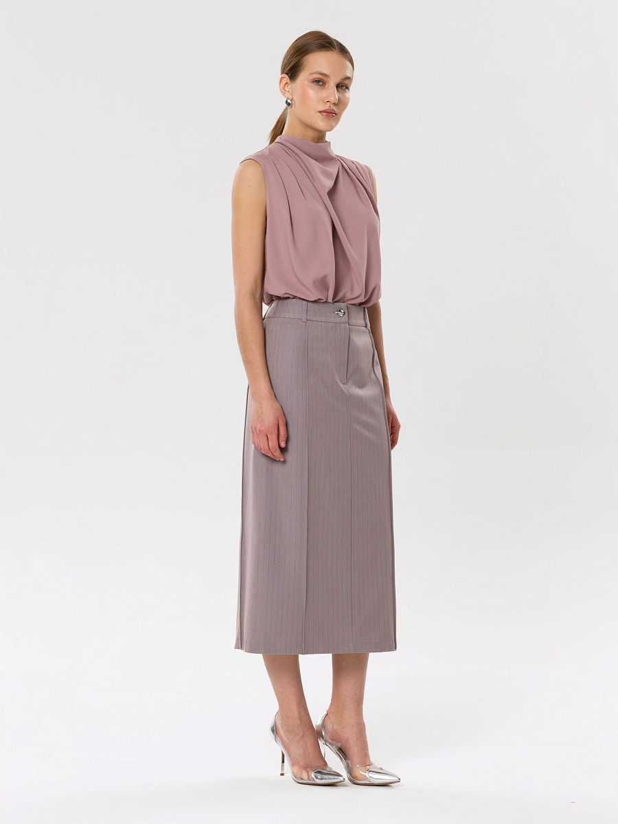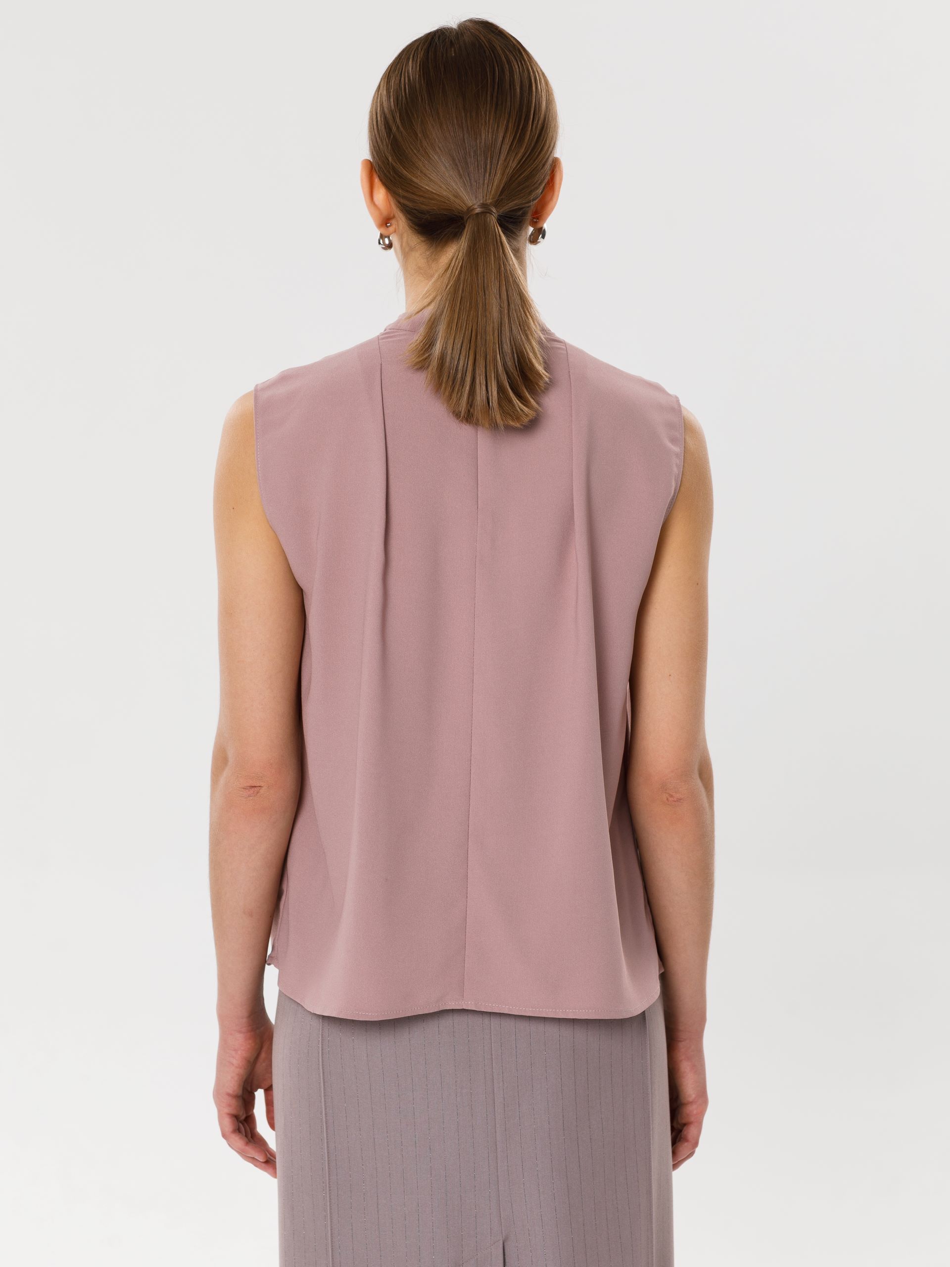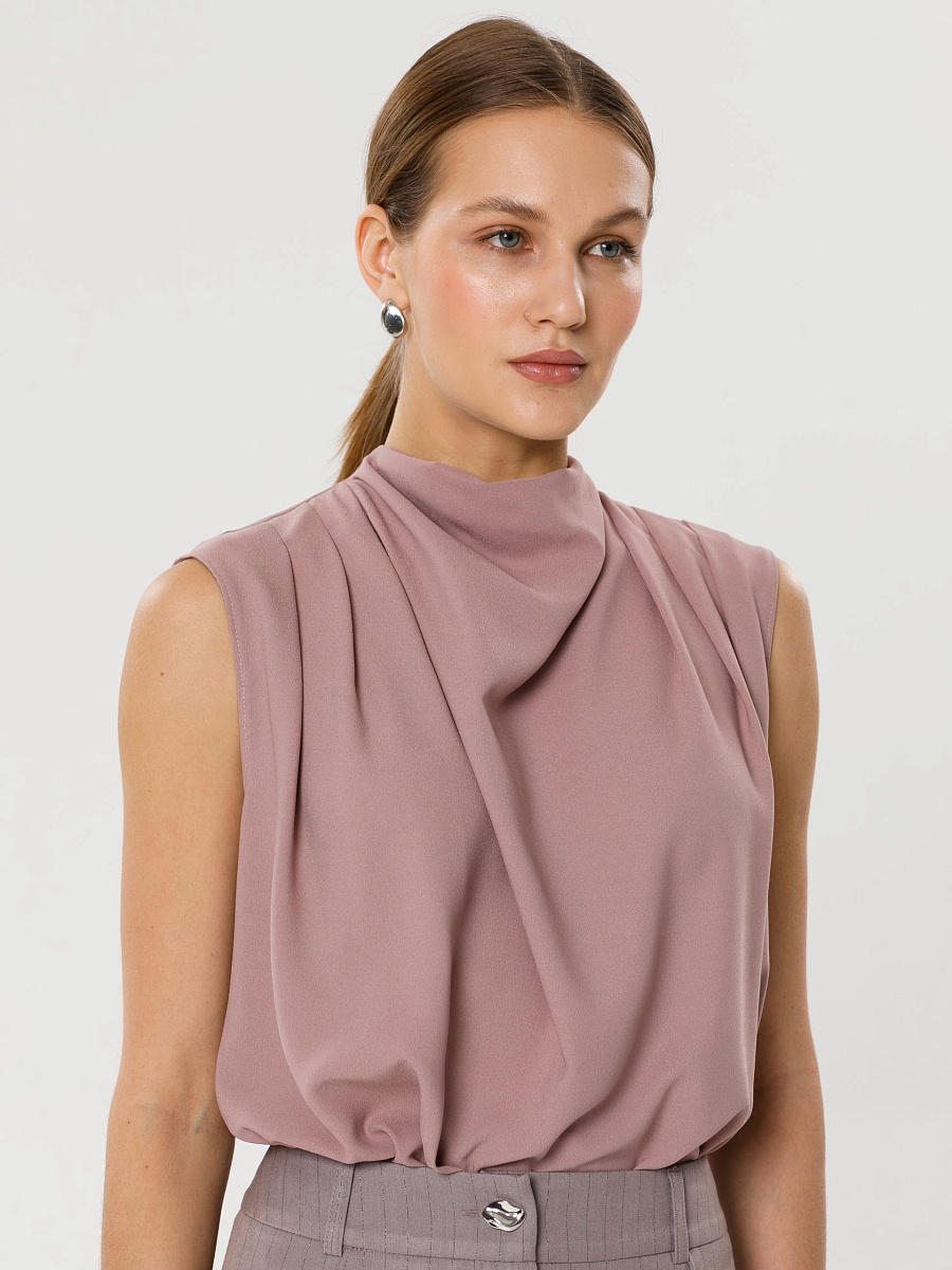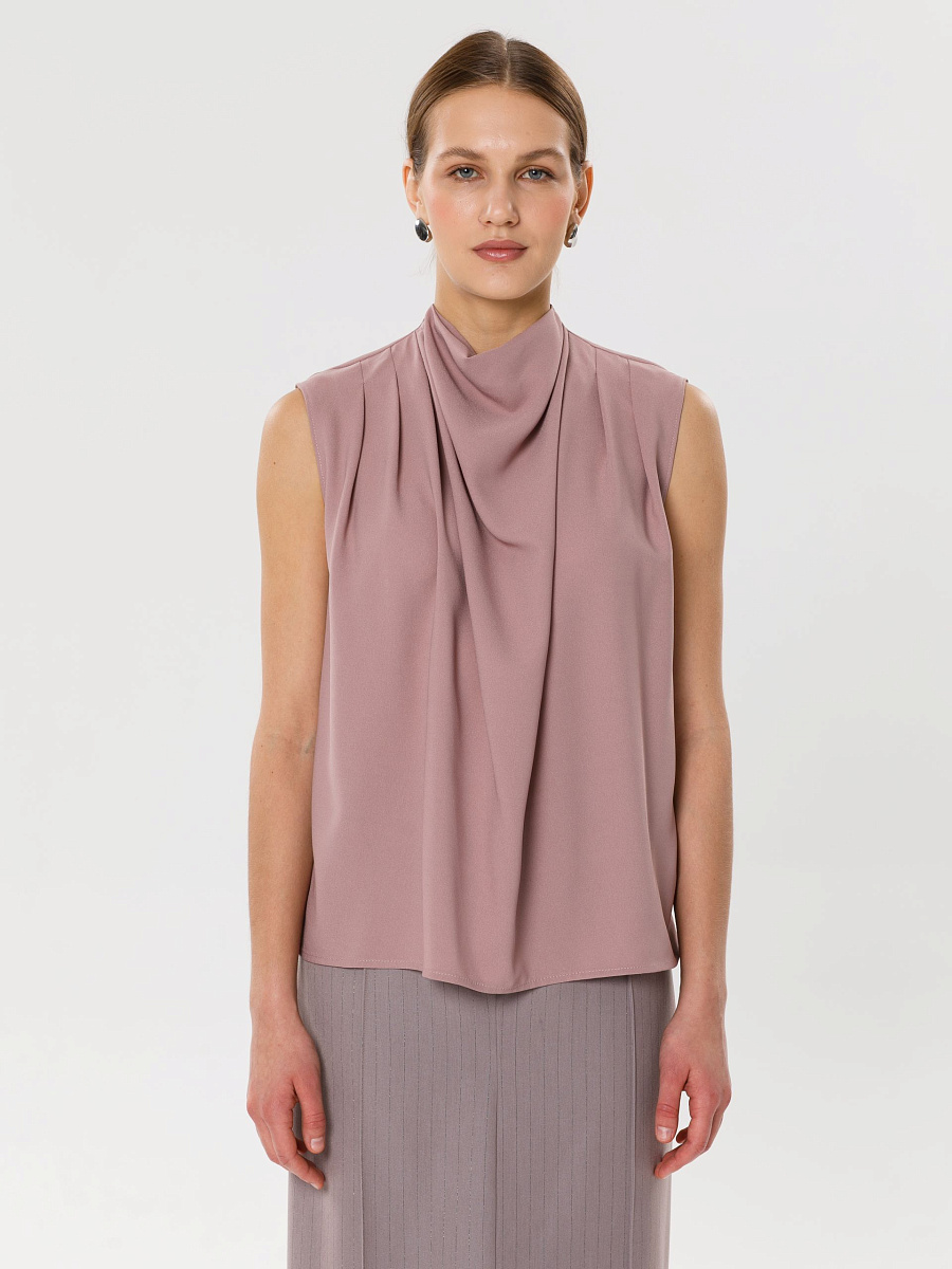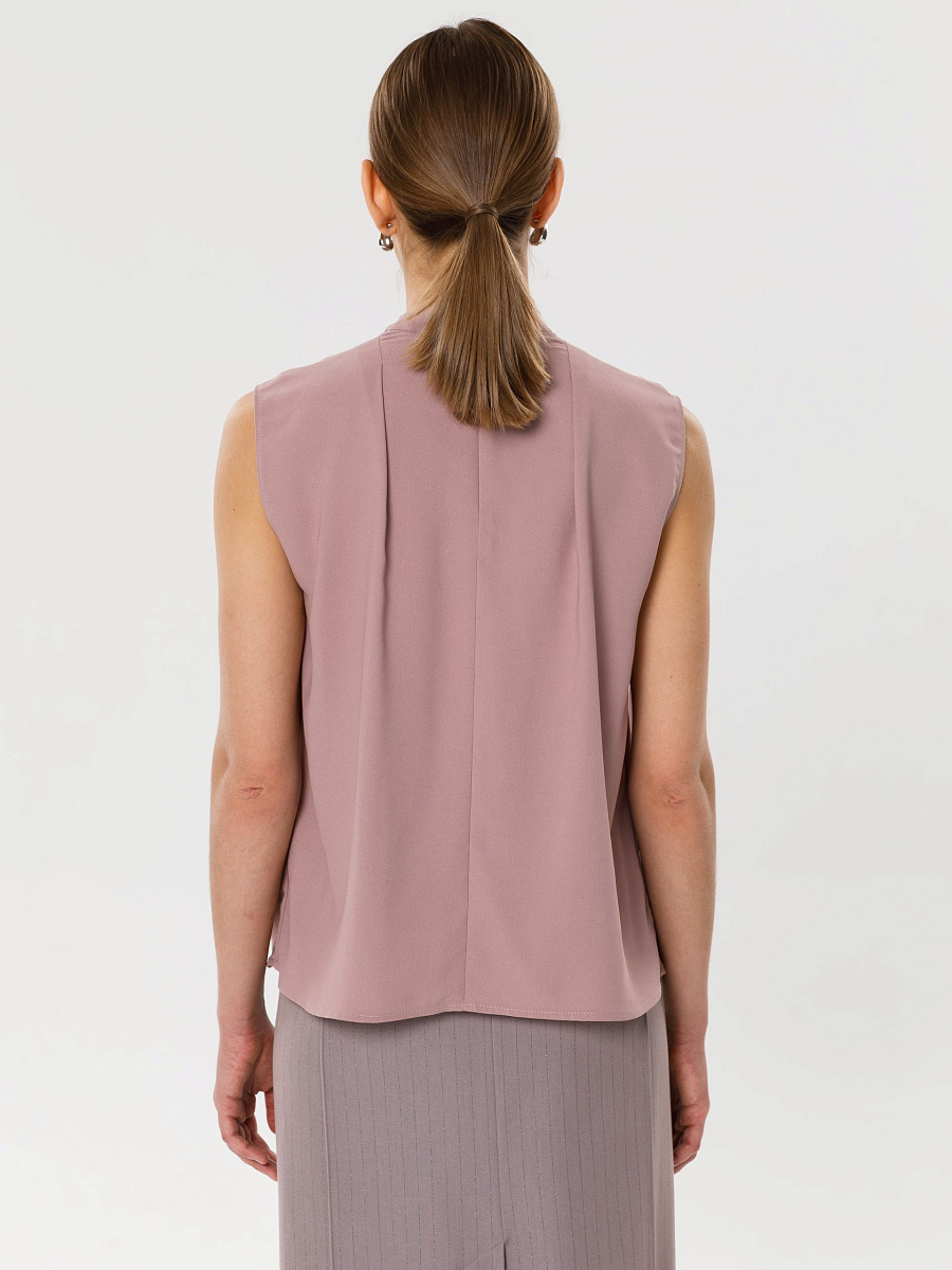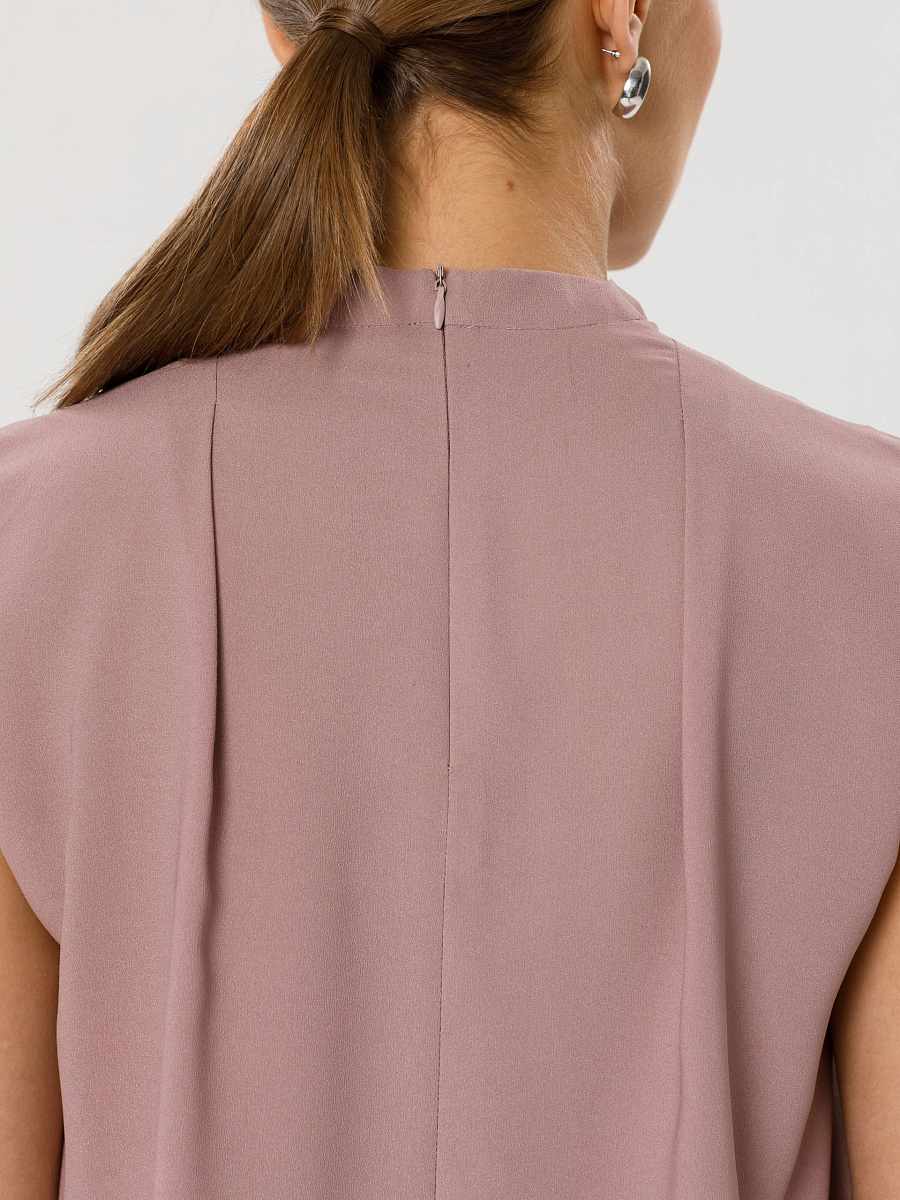 Модель прямого силуэта, без рукавов. В среднем шве спинки потайная застёжка молния. По плечевым швам спереди и сзади заложены складки. Воротник комбинированный, сзади стойка, спереди качели.