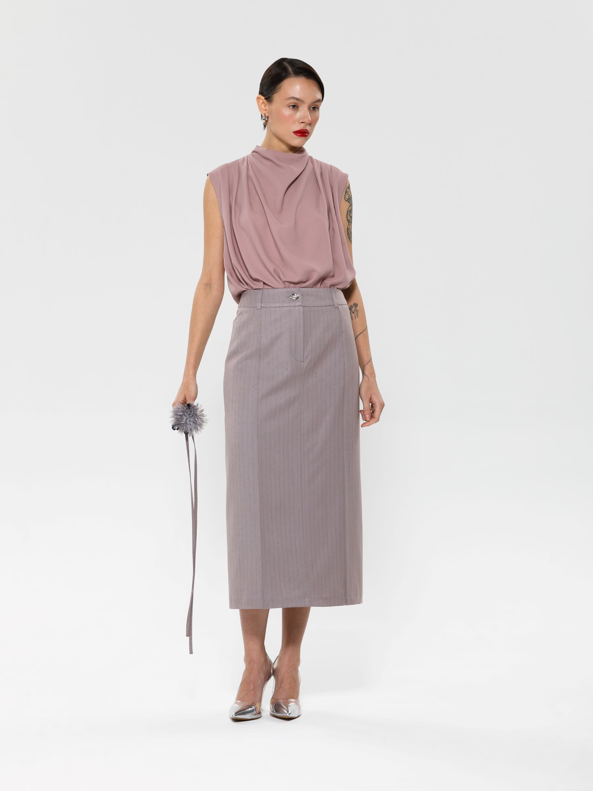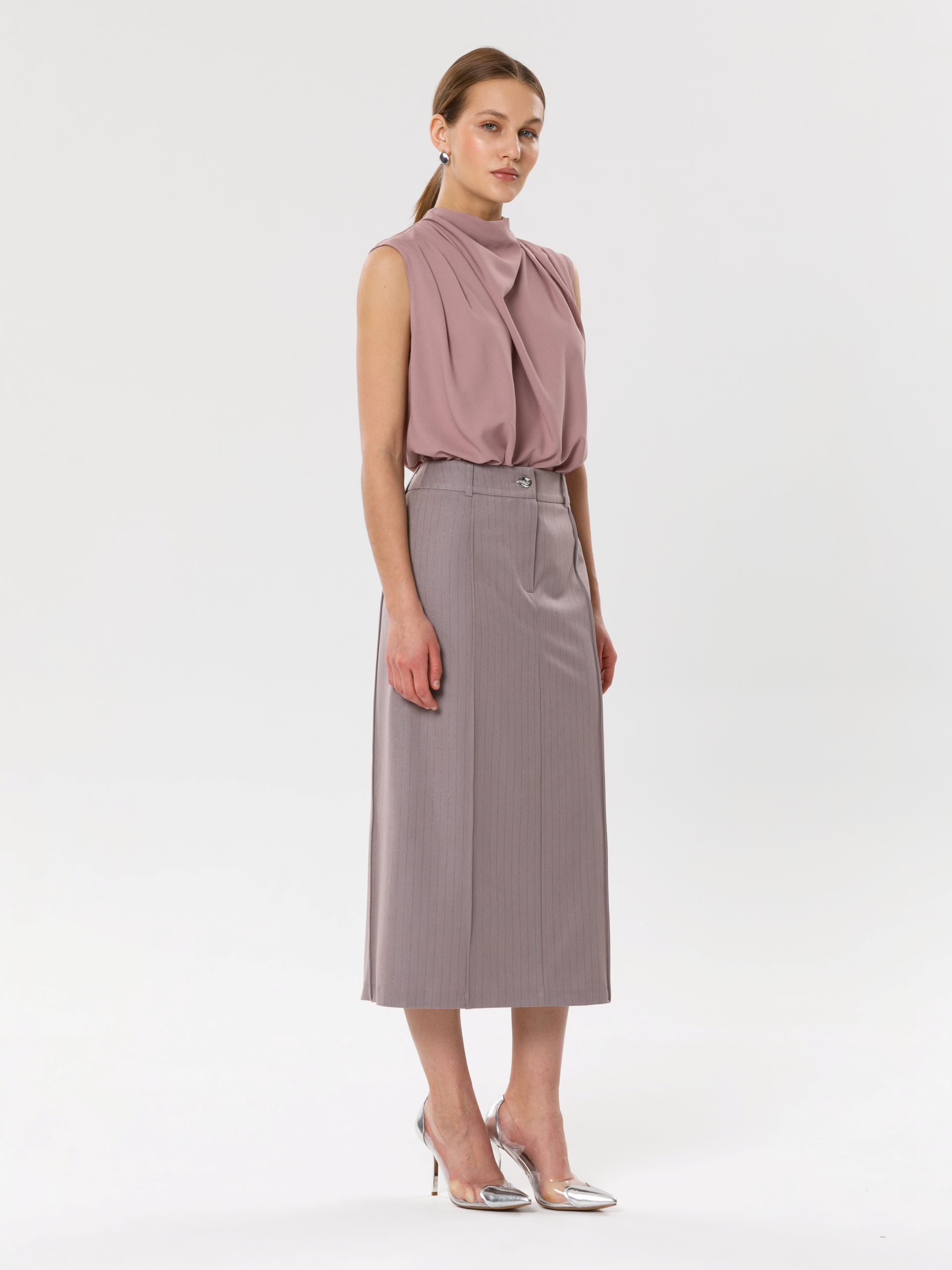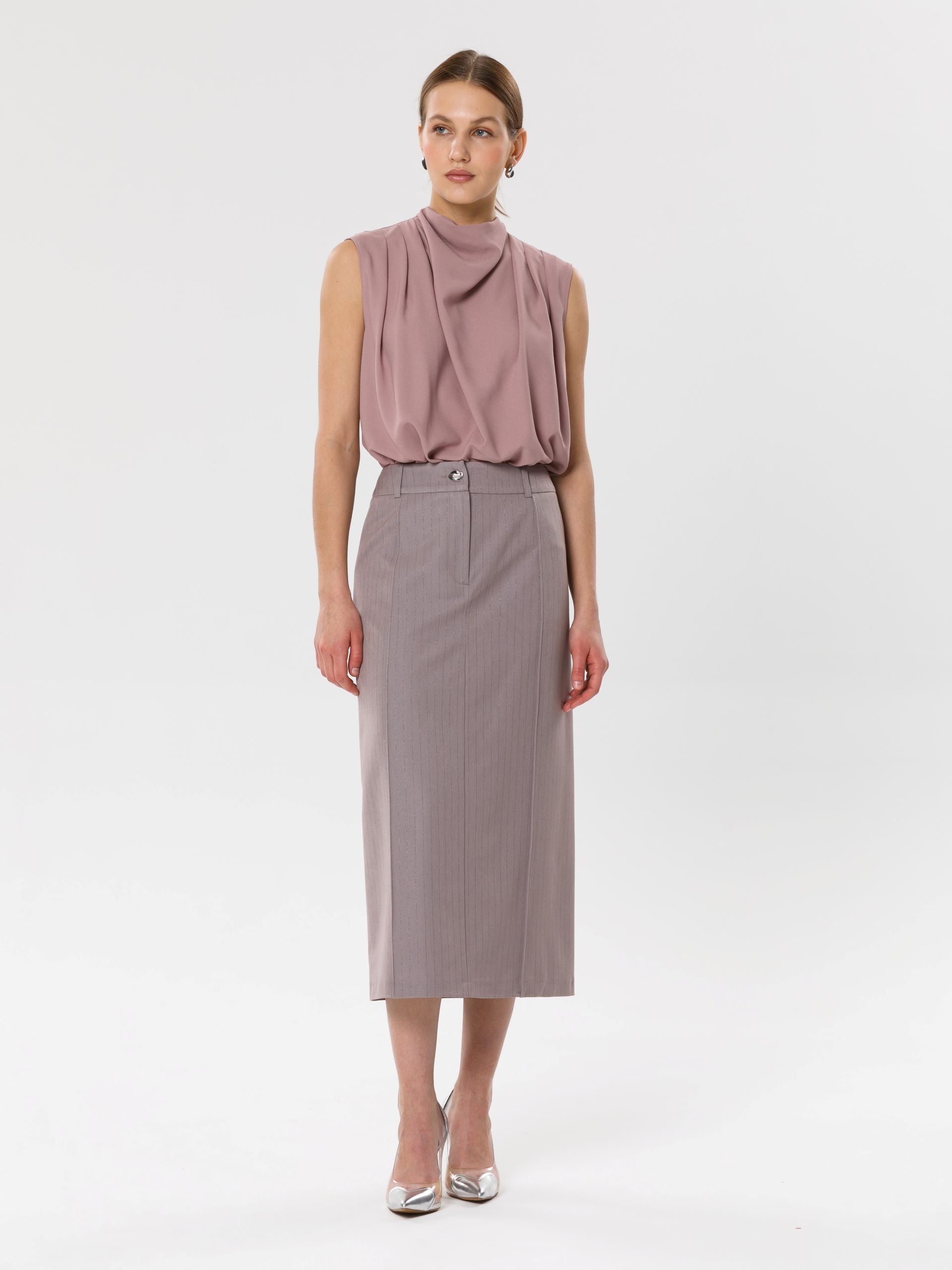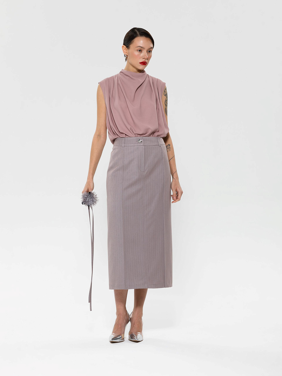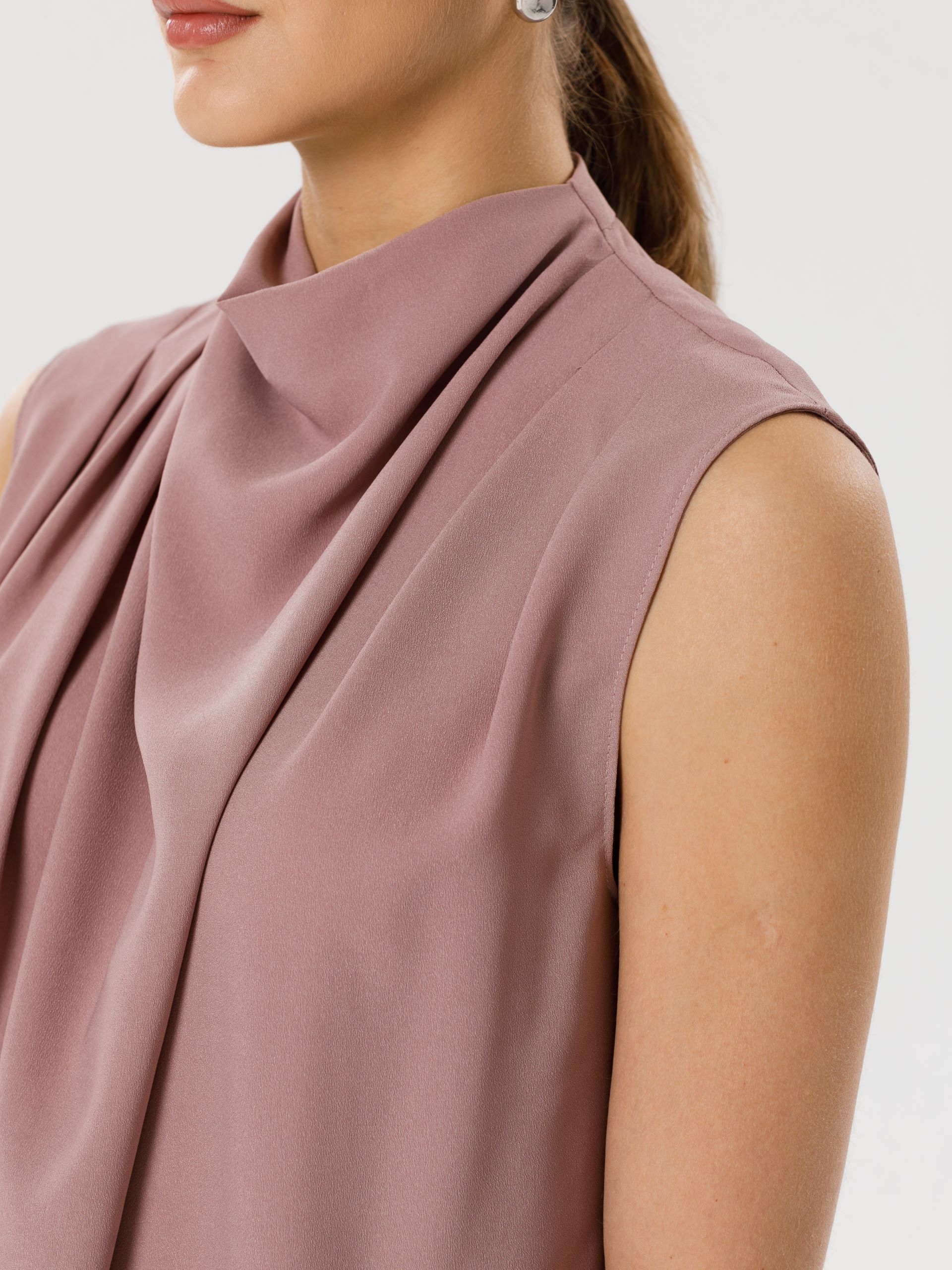 Модель прямого силуэта, без рукавов. В среднем шве спинки потайная застёжка молния. По плечевым швам спереди и сзади заложены складки. Воротник комбинированный, сзади стойка, спереди качели.