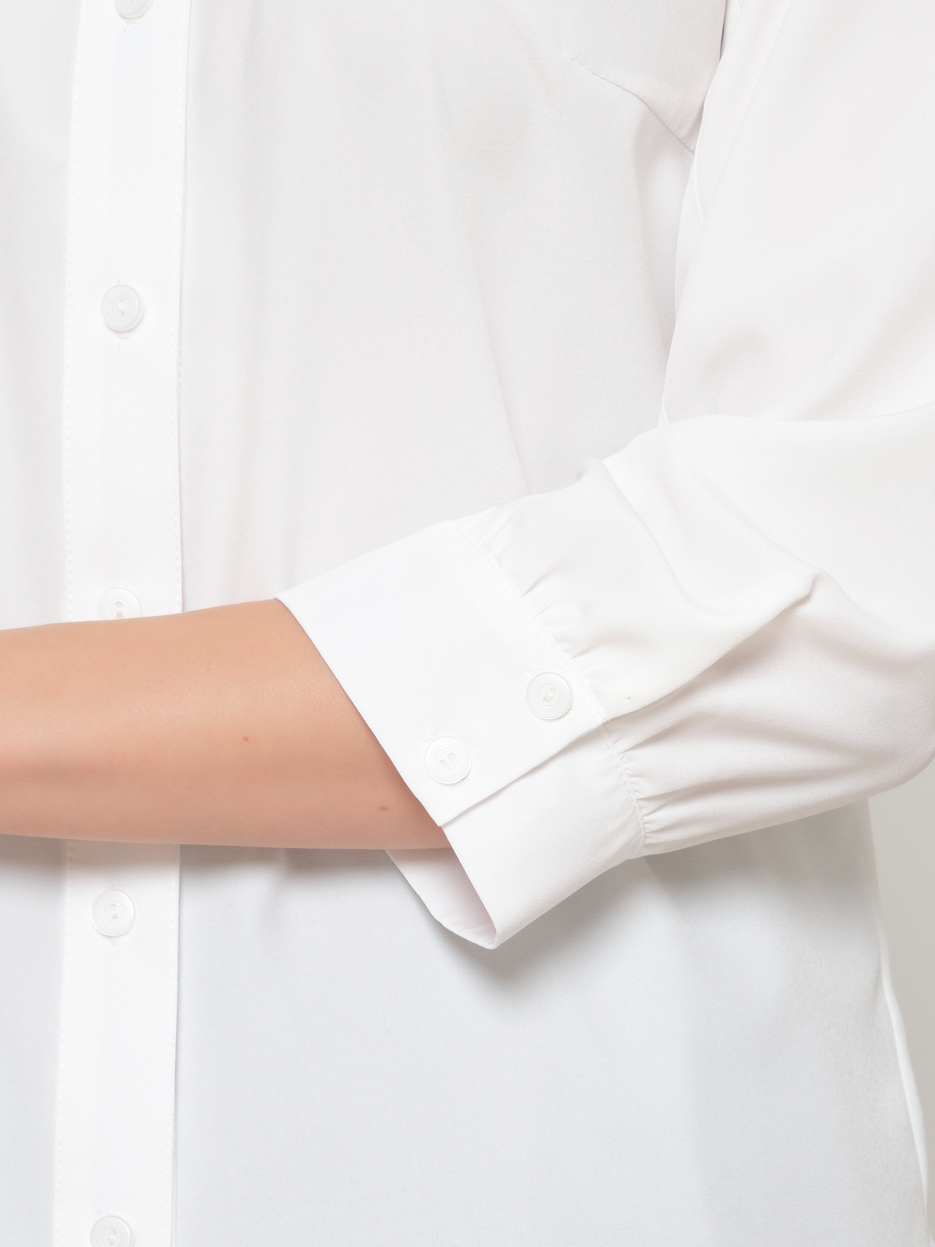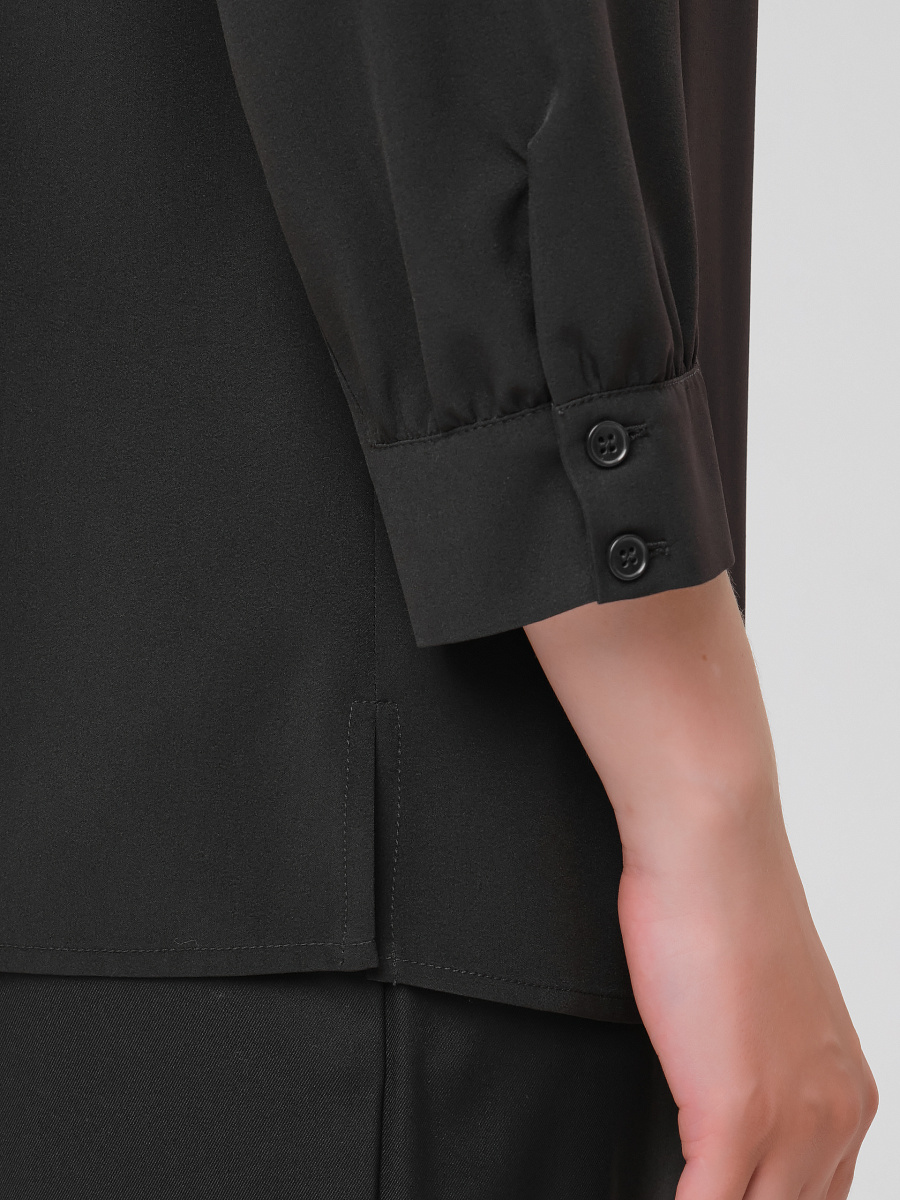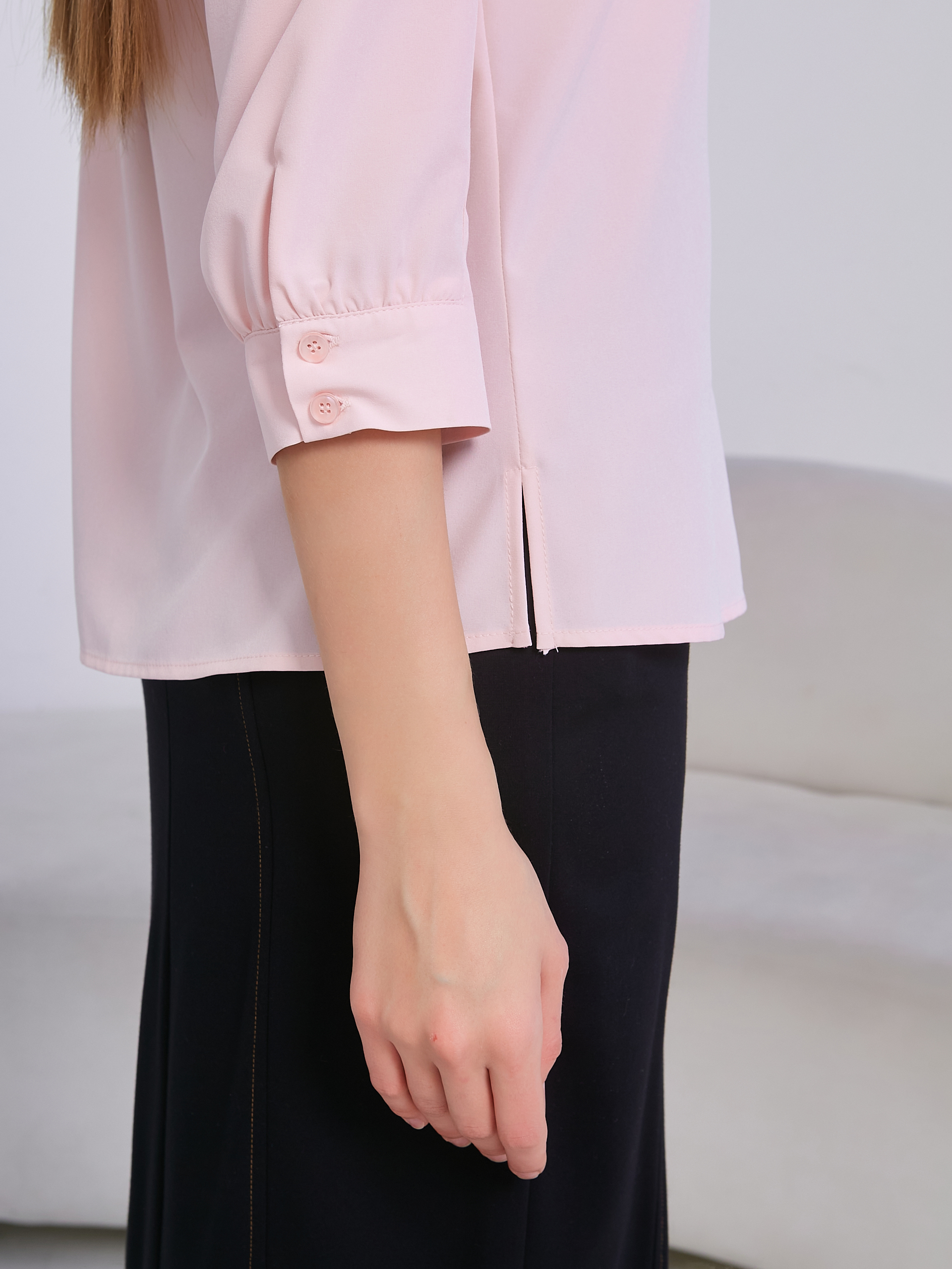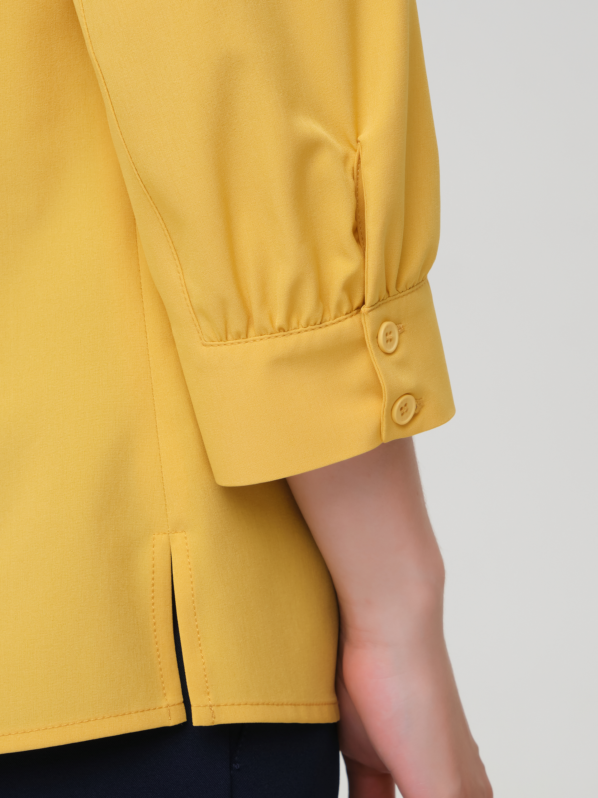 Рукав с небольшой сборкой по верху и низу, застегивается на 2 петли и пуговицы.