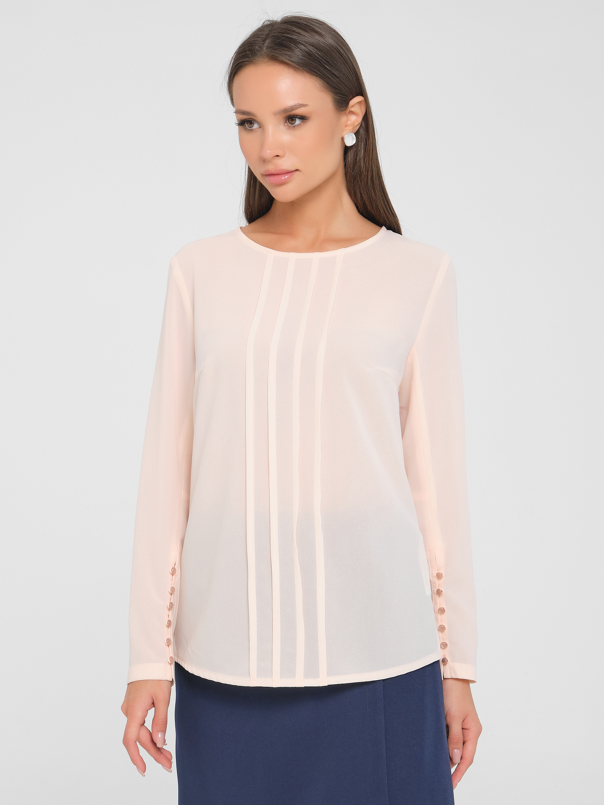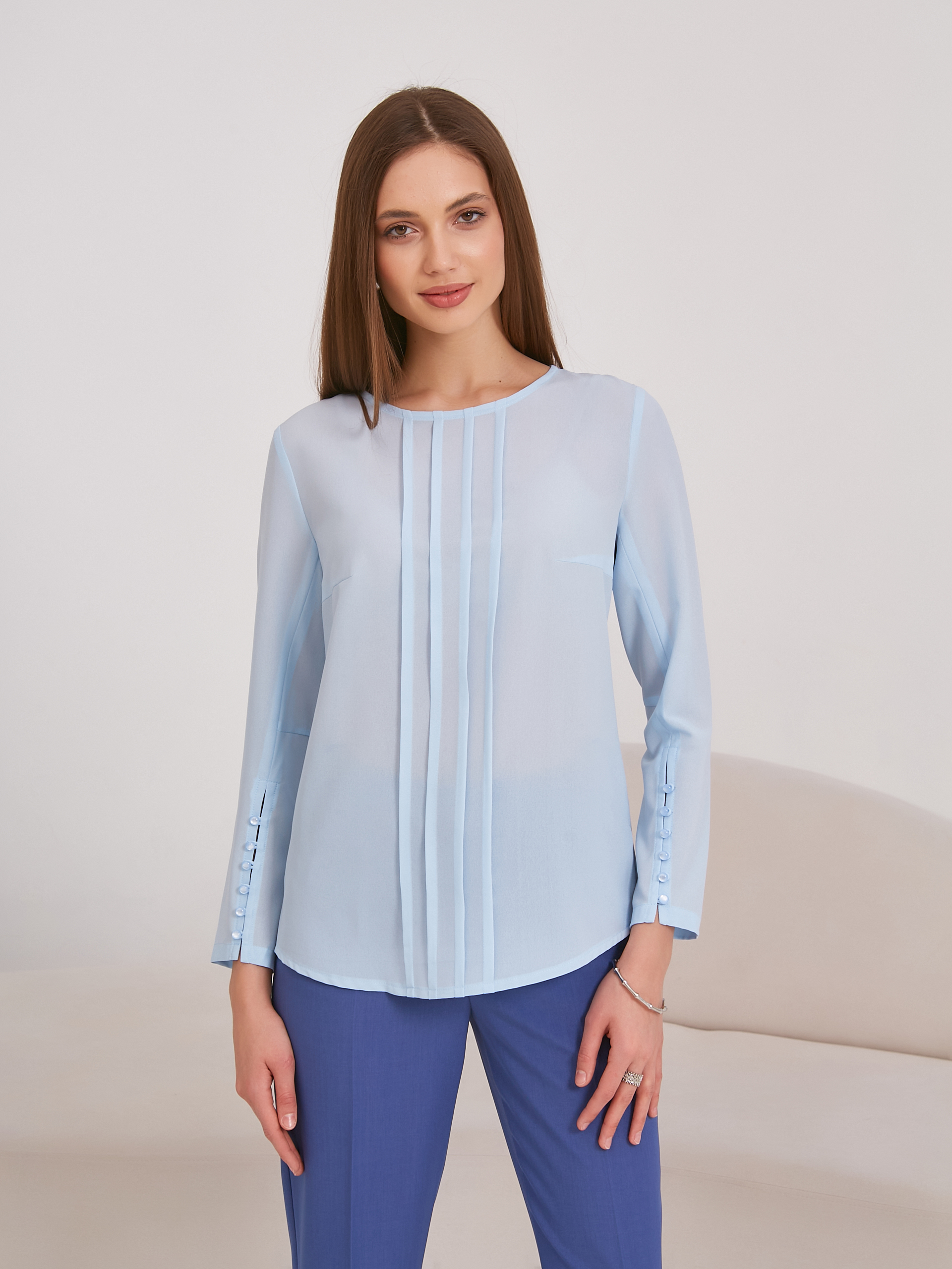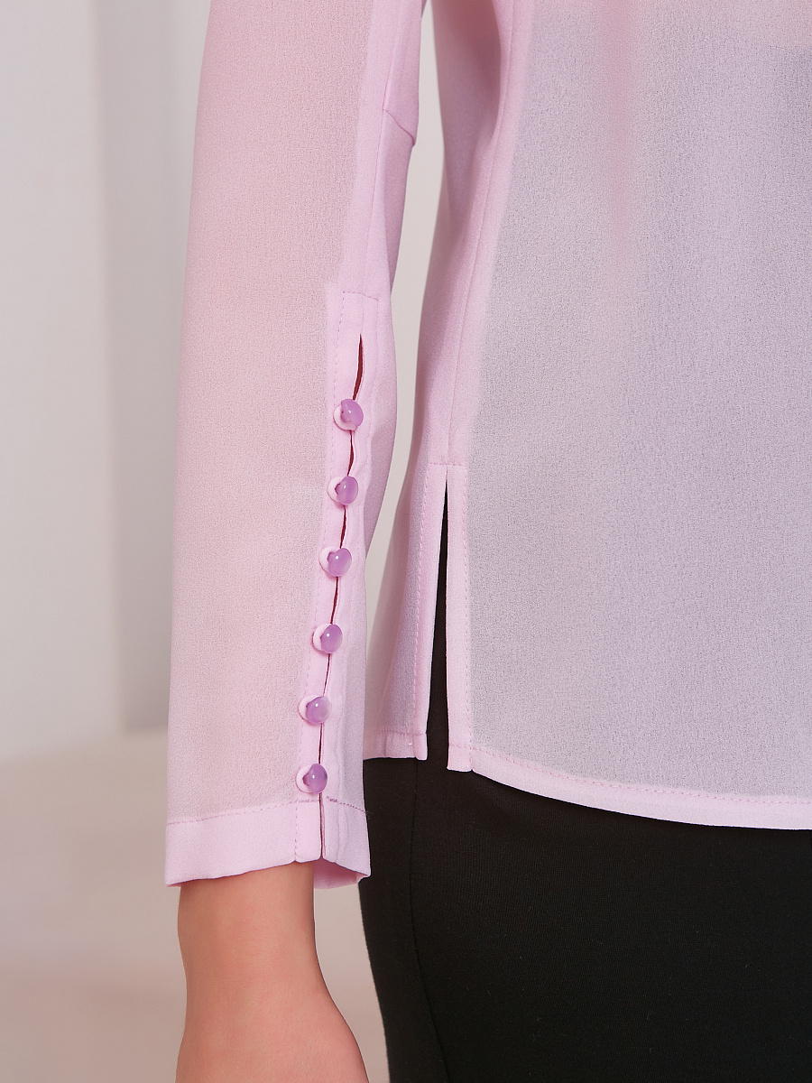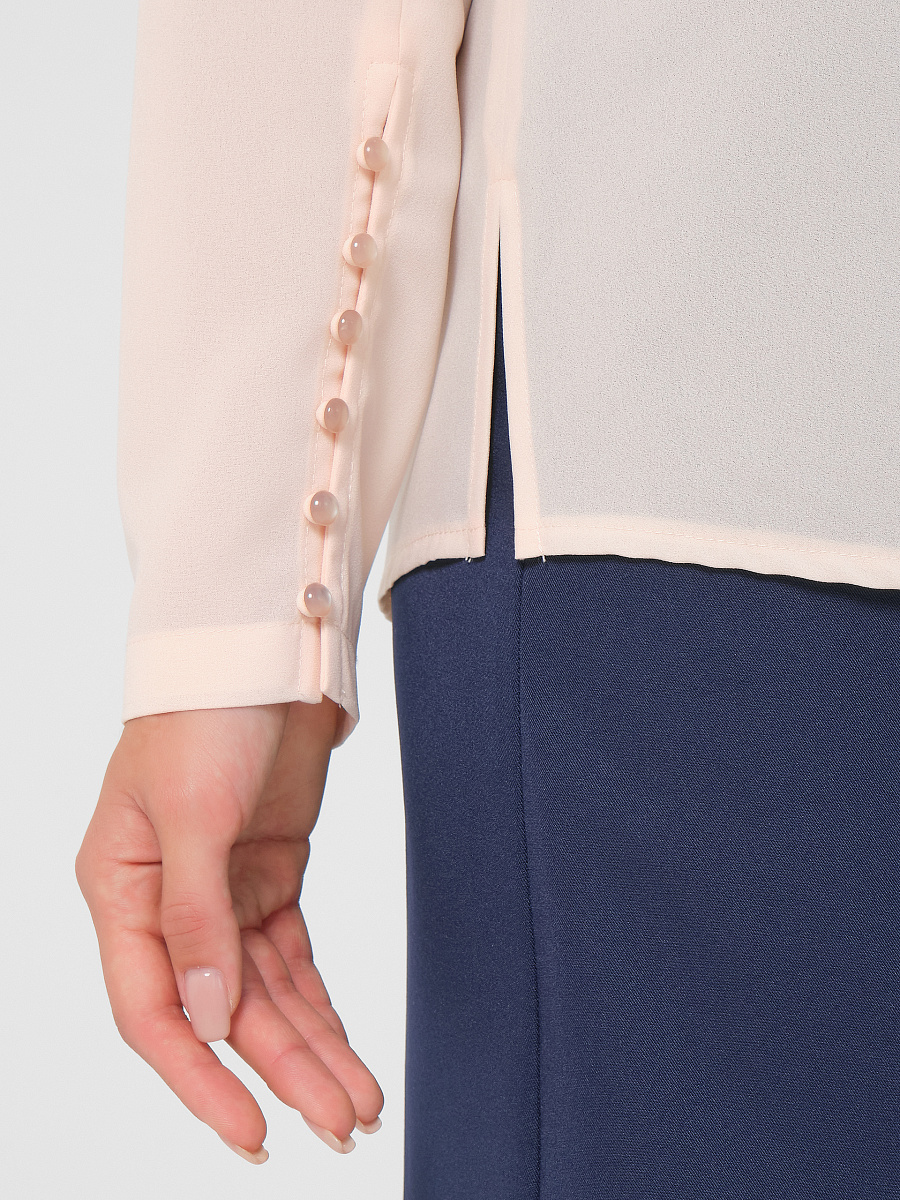 Рукав с декоративной застежкой на навесные петли и жемчужные пуговицы. Вырез горловины округлой формы. Застежка сзади на навесную петлю и пуговицу. Спинка со средним швом. По центру переда застрочена группа вертикальных складок. Низ изделия фигурный. В боковых швах разрезы.