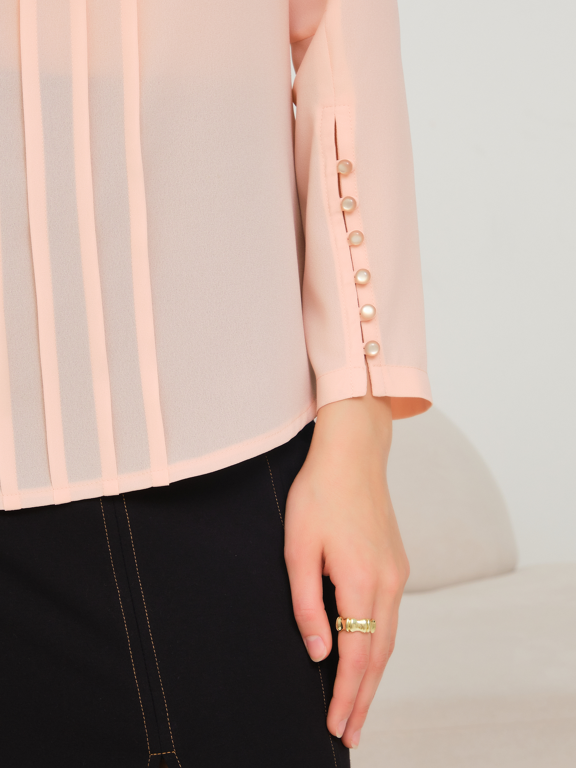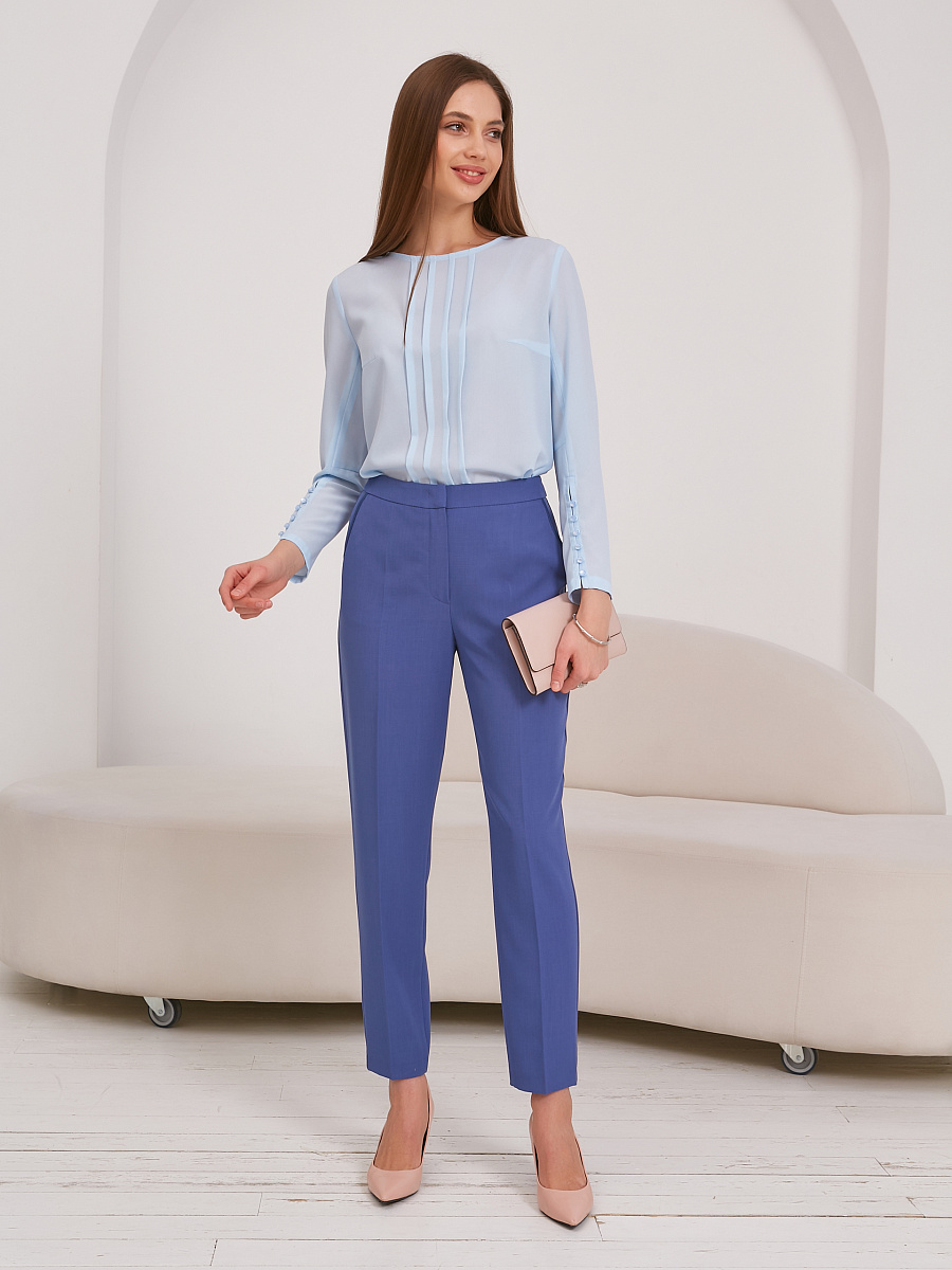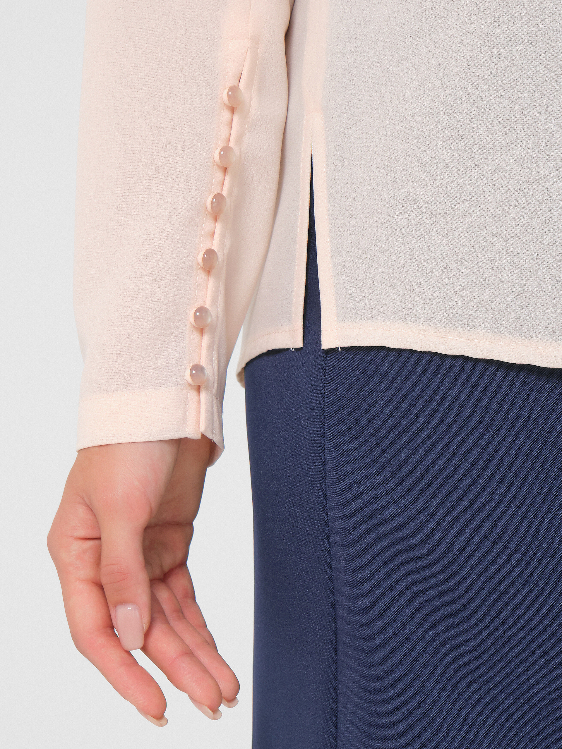Рукав с декоративной застежкой на навесные петли и жемчужные пуговицы. Вырез горловины округлой формы. Застежка сзади на навесную петлю и пуговицу. Спинка со средним швом. По центру переда застрочена группа вертикальных складок. Низ изделия фигурный. В боковых швах разрезы.