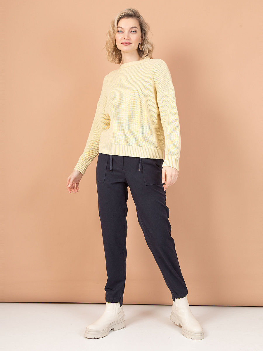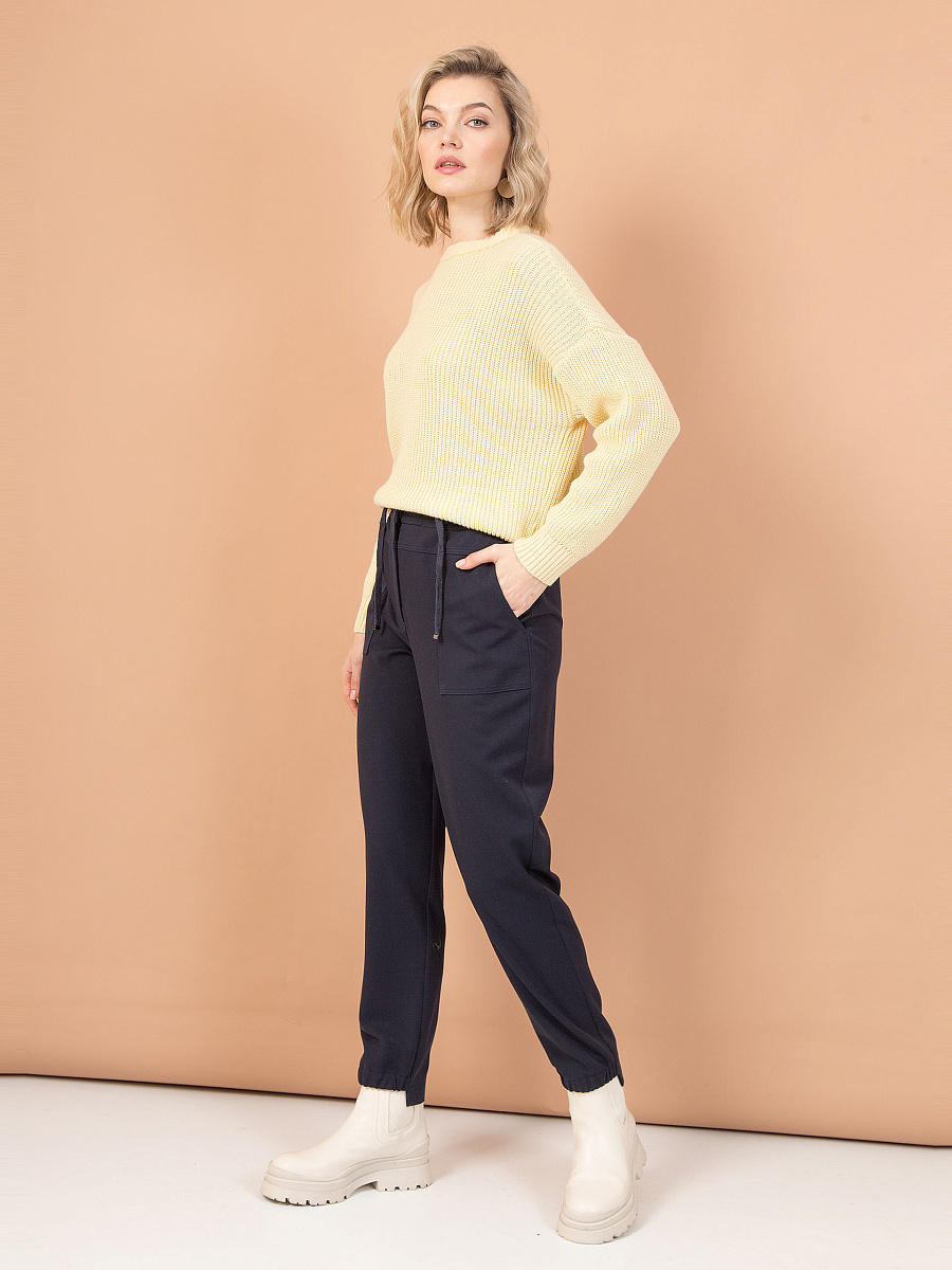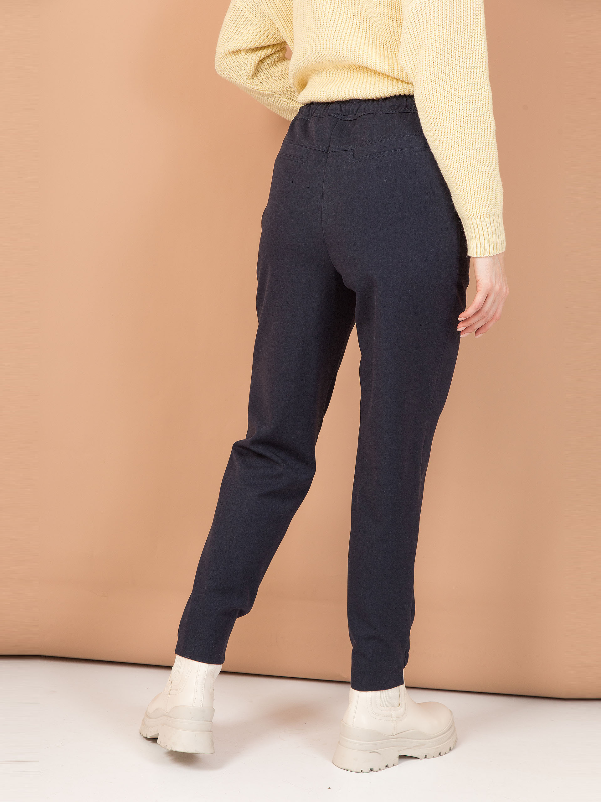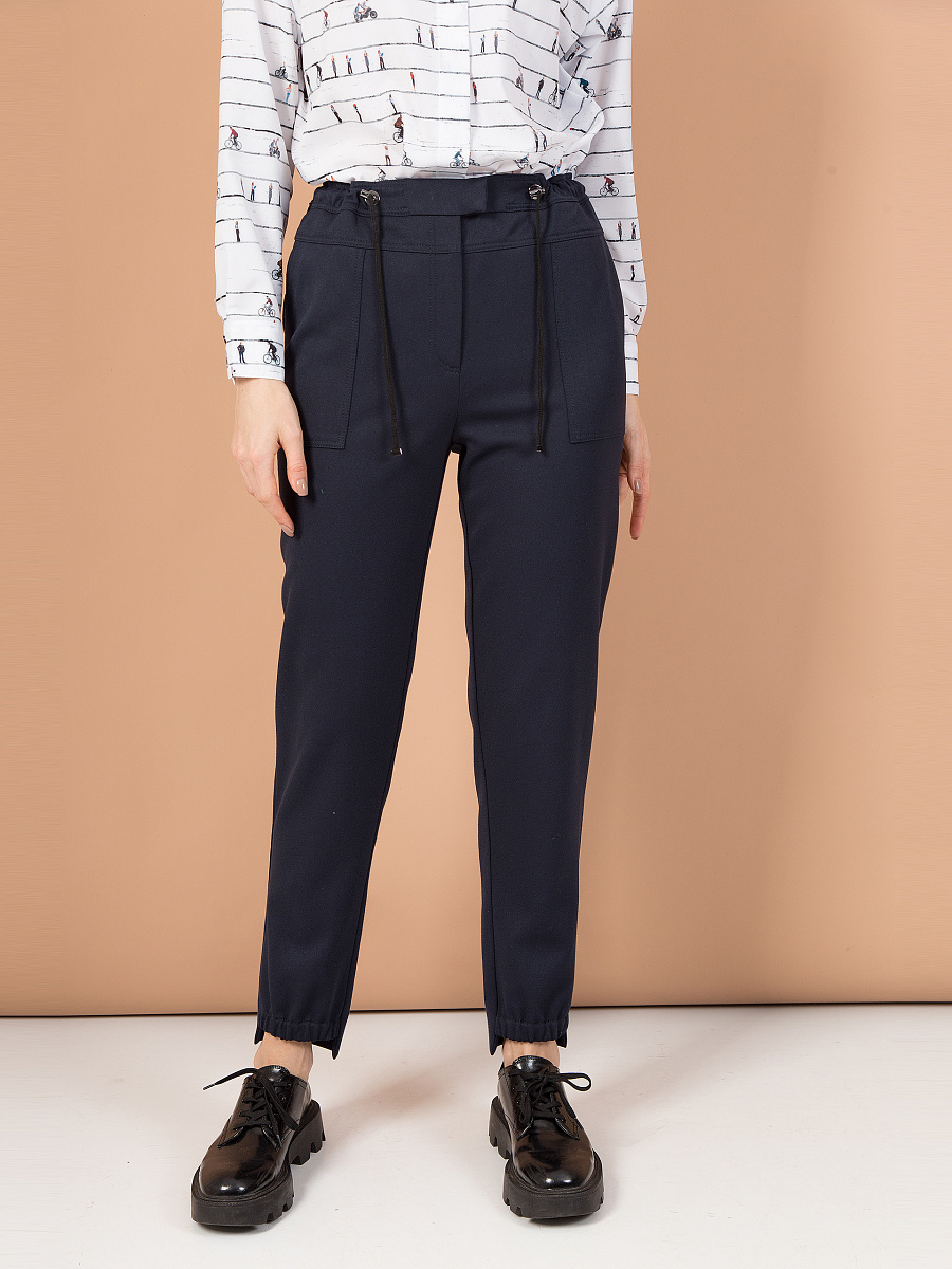 Спереди фигурные накладные карманы. Сзади имитация прорезных карманов с листочкой. Низ брюк разноуровневый, сзади длиннее, спереди собран на резину. Брюки декорированы отделочными строчками.