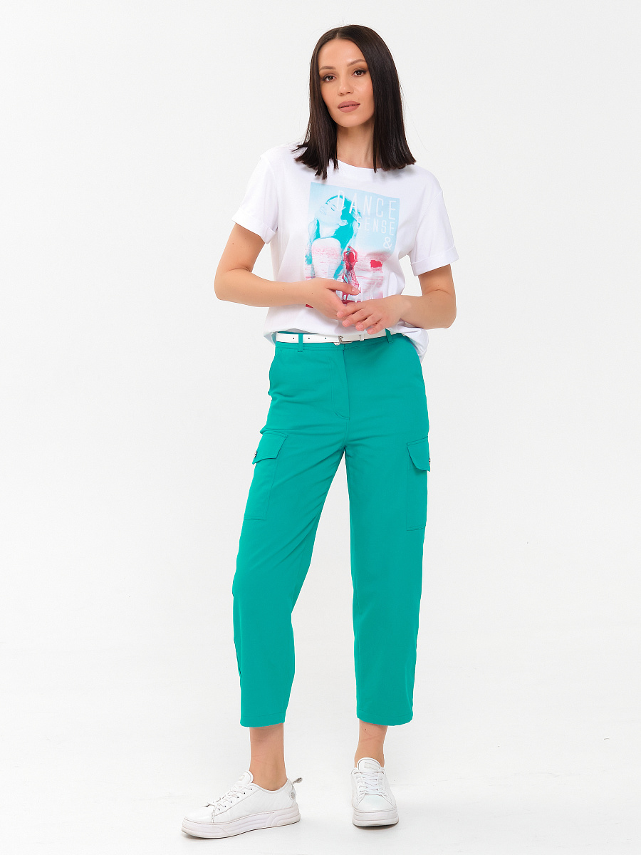 Спереди карманы в подрезных бочках. Сзади кокетки, рельефы и декоративные клапаны с застёжкой на пуговицу. По бокам накладные карманы с клапаном и застёжкой на пуговицу. Брюки декорированы отделочными строчками. Ремень в комплект не входит.