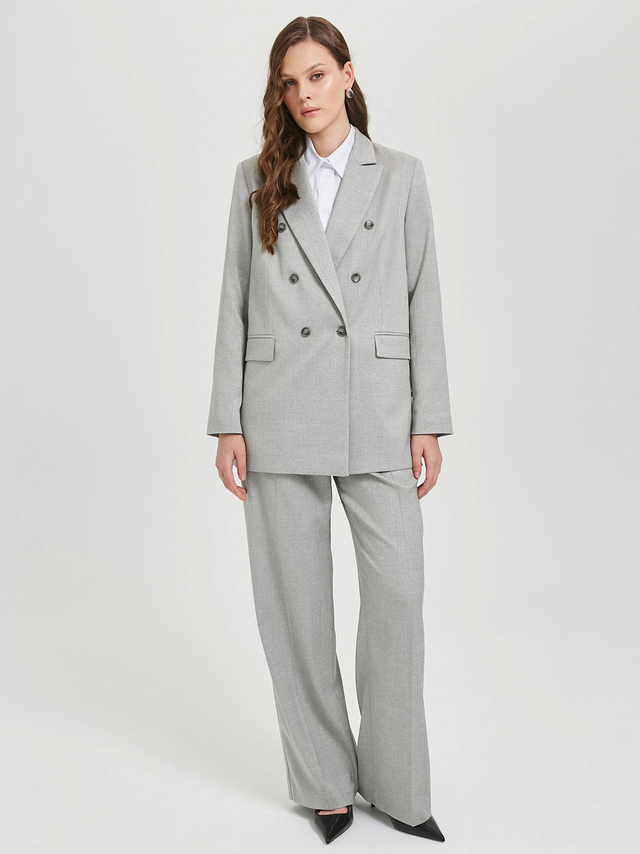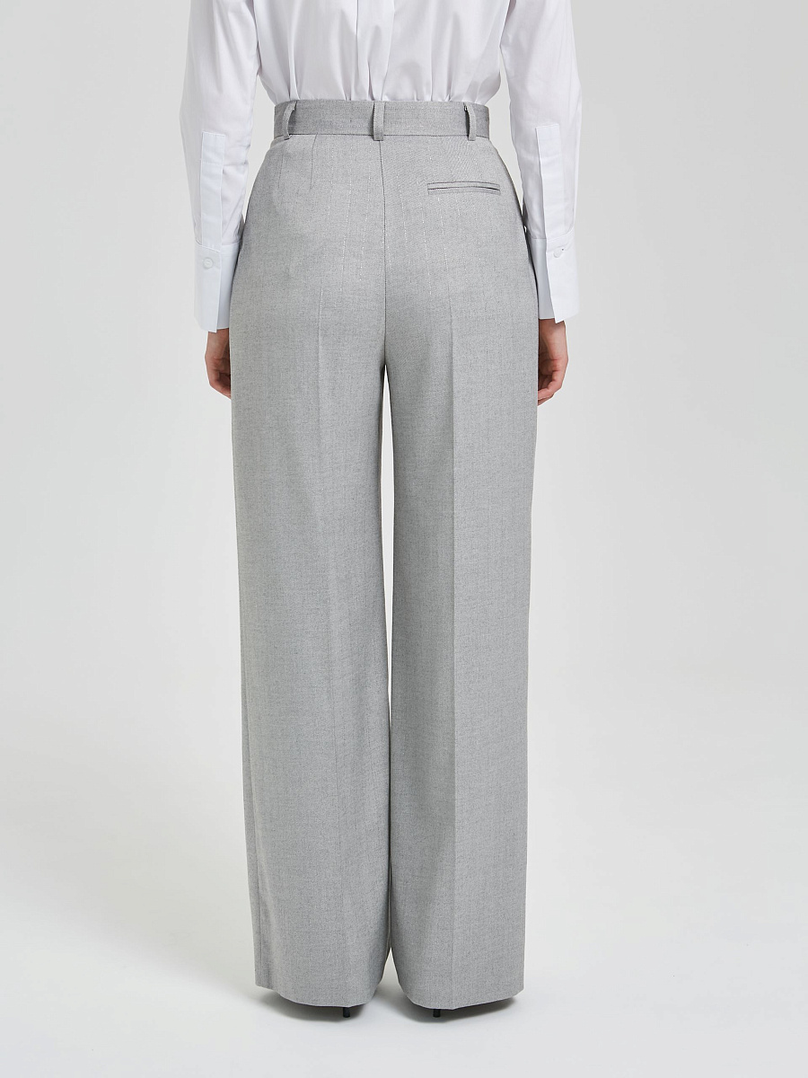 Спереди защипы, карманы в подрезных бочках и фигурные шлёвки на поясе. Сзади прорезной карман в рамку. Ремень в комплект не входит.