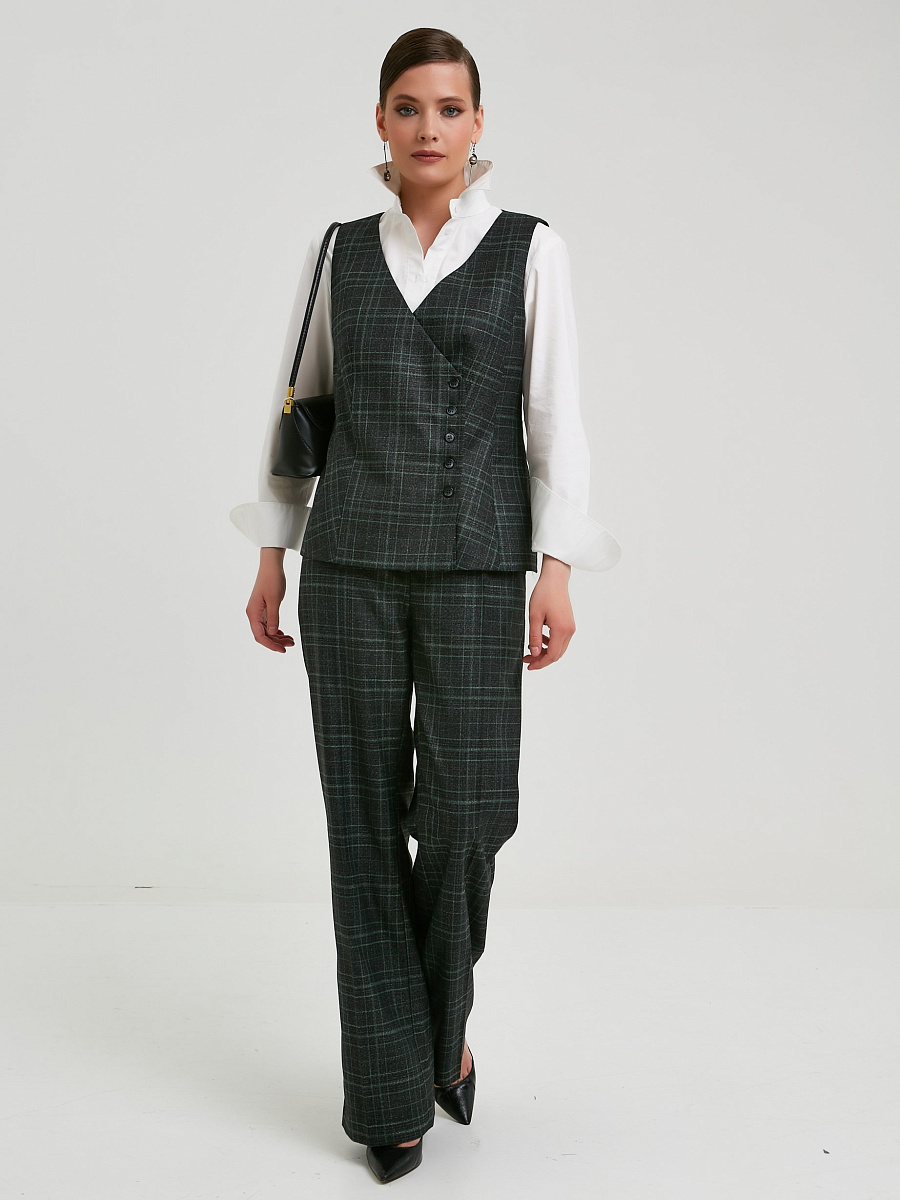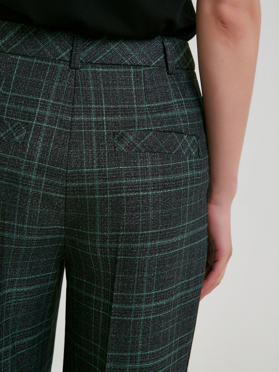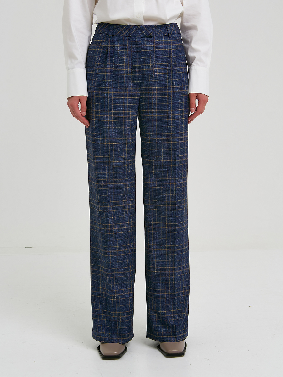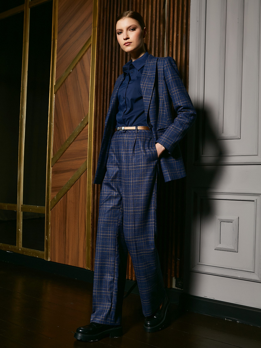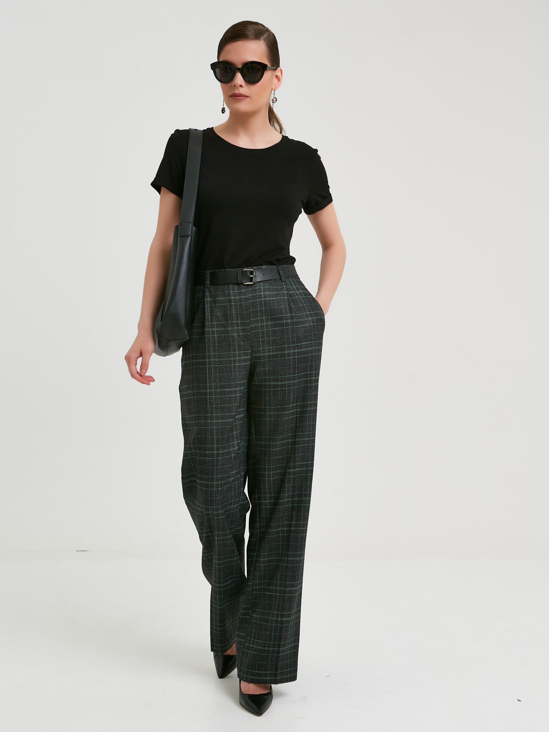 Модель прямого силуэта, на подккройном поясе со шлёвками. Спереди защипы. Застёжка на молнию и крючки на поясе. В боковых швах карманы. Сзади прорезные карманы с листочкой. Ремень в комплект не входит.