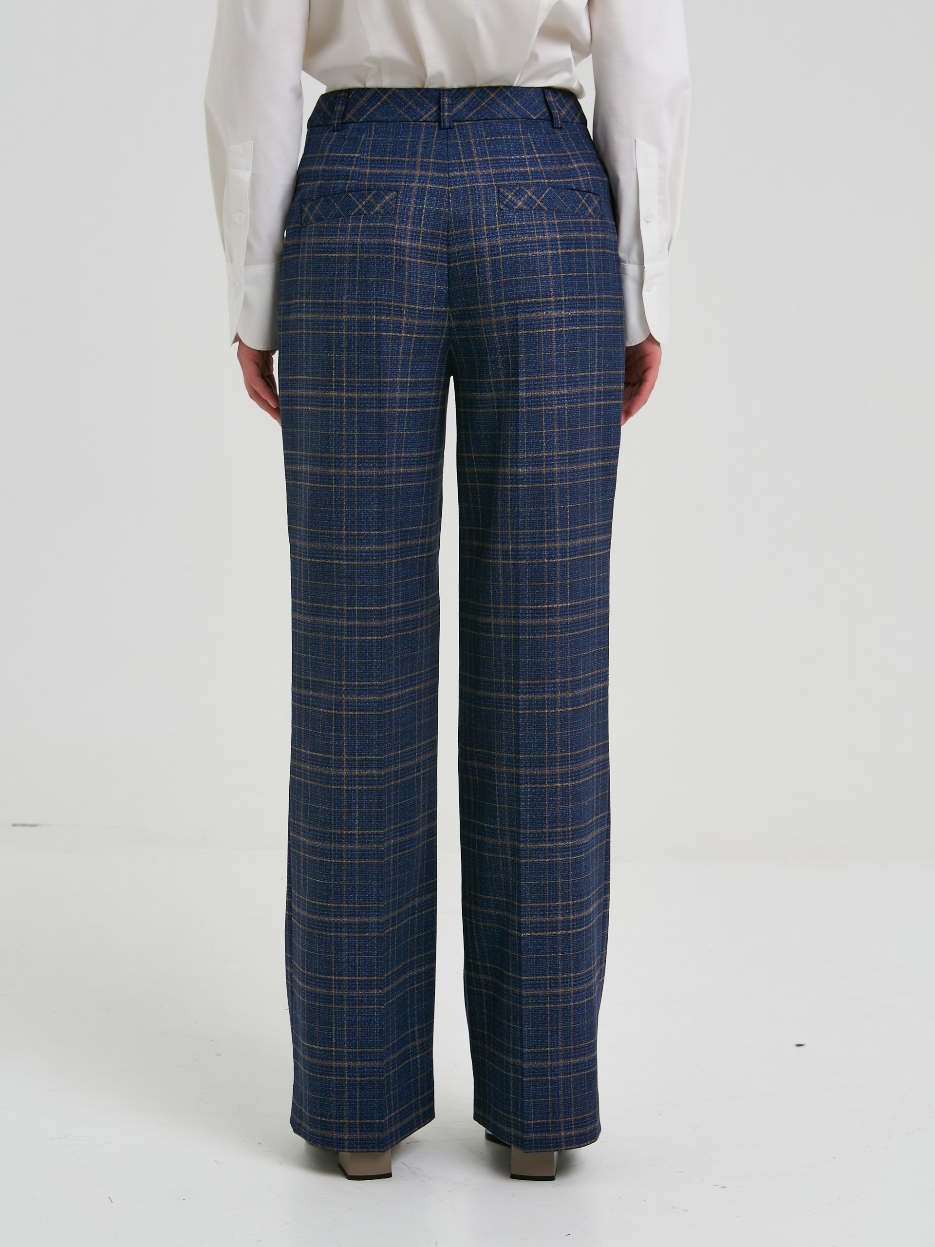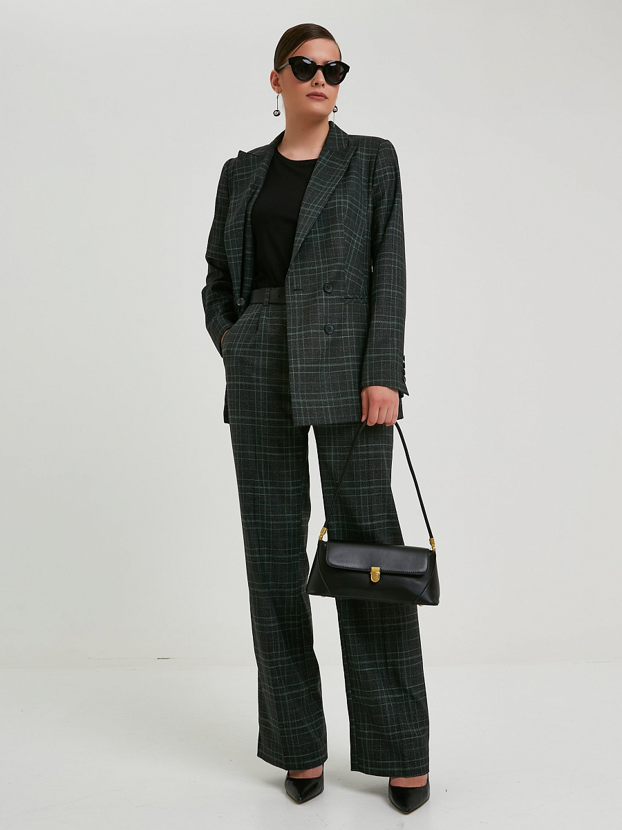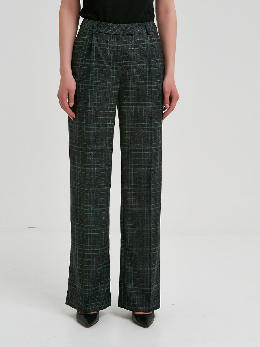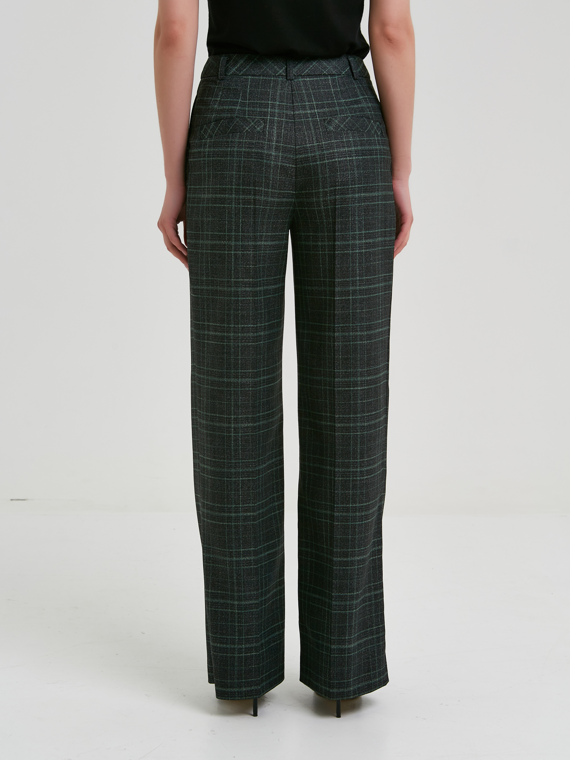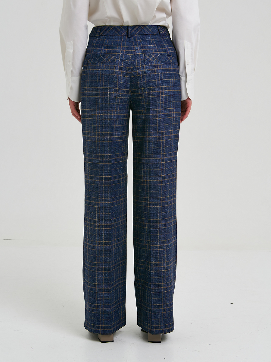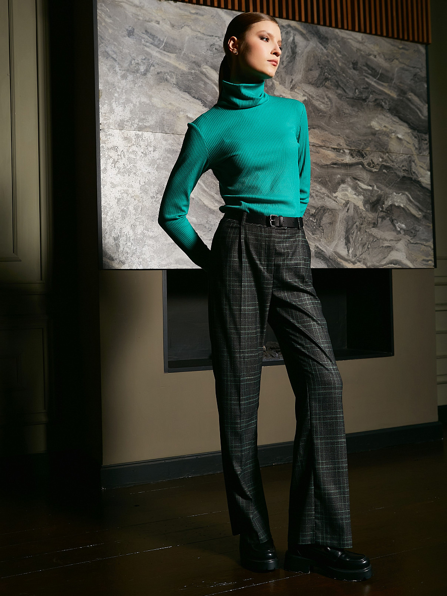 Модель прямого силуэта, на подккройном поясе со шлёвками. Спереди защипы. Застёжка на молнию и крючки на поясе. В боковых швах карманы. Сзади прорезные карманы с листочкой. Ремень в комплект не входит.