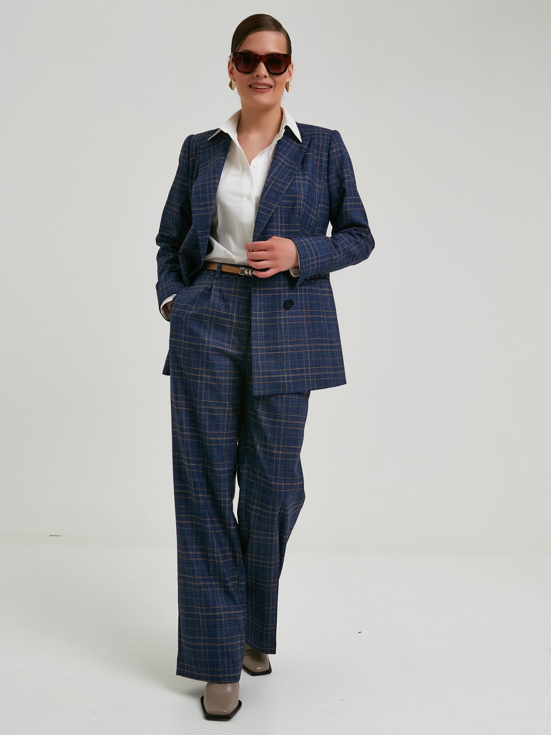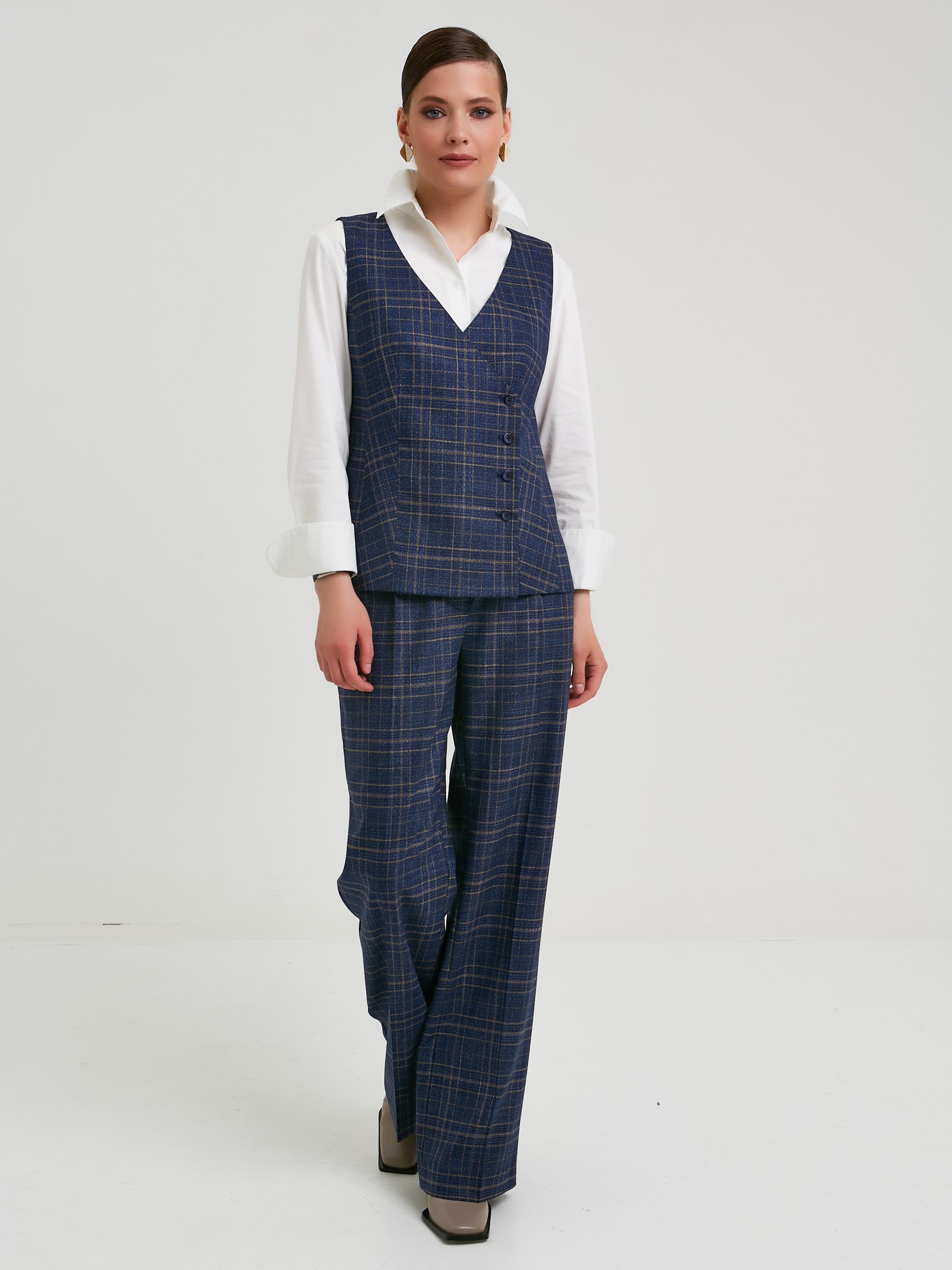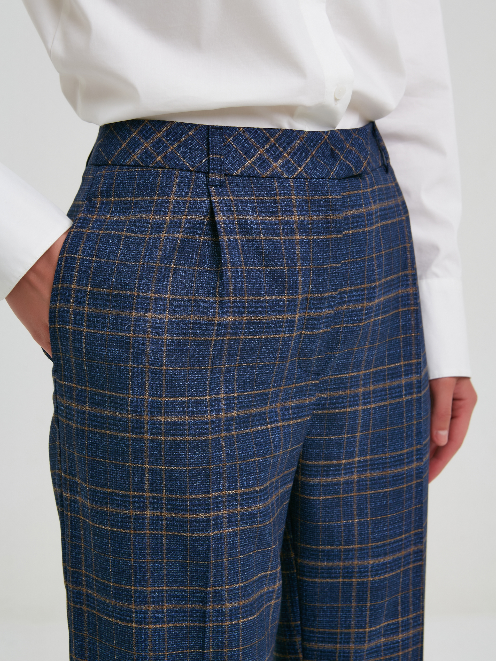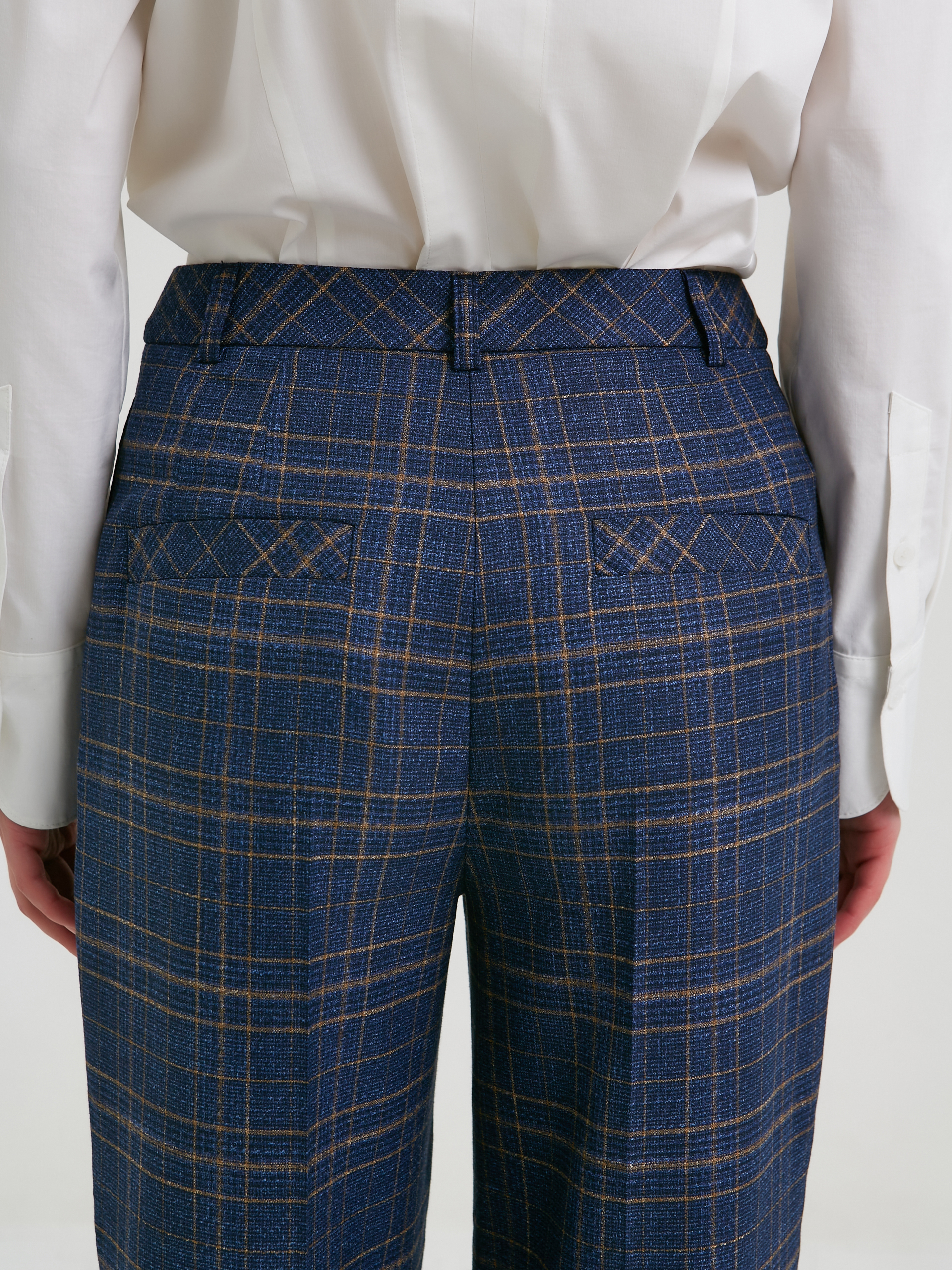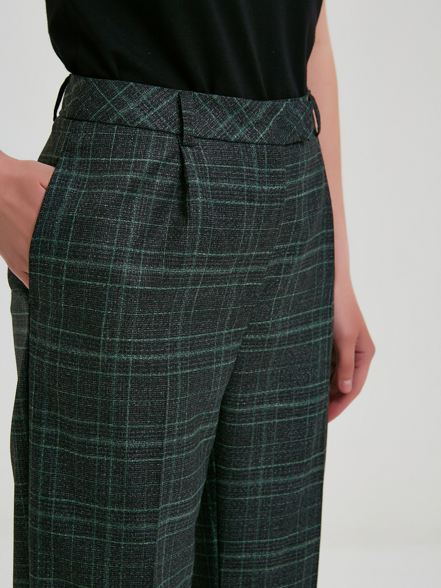 Модель прямого силуэта, на подккройном поясе со шлёвками. Спереди защипы. Застёжка на молнию и крючки на поясе. В боковых швах карманы. Сзади прорезные карманы с листочкой. Ремень в комплект не входит.