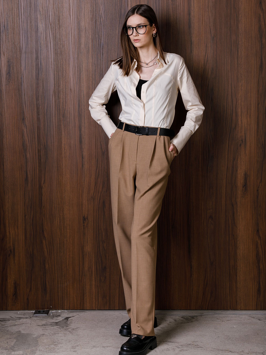 Модель зауженная к низу, на притачном поясе, со шлёвками. Спереди карманы в подрезных бочках и защипы по талии. Сзади имитация прорезных карманов с листочкой. Ремень в комплект не входит.