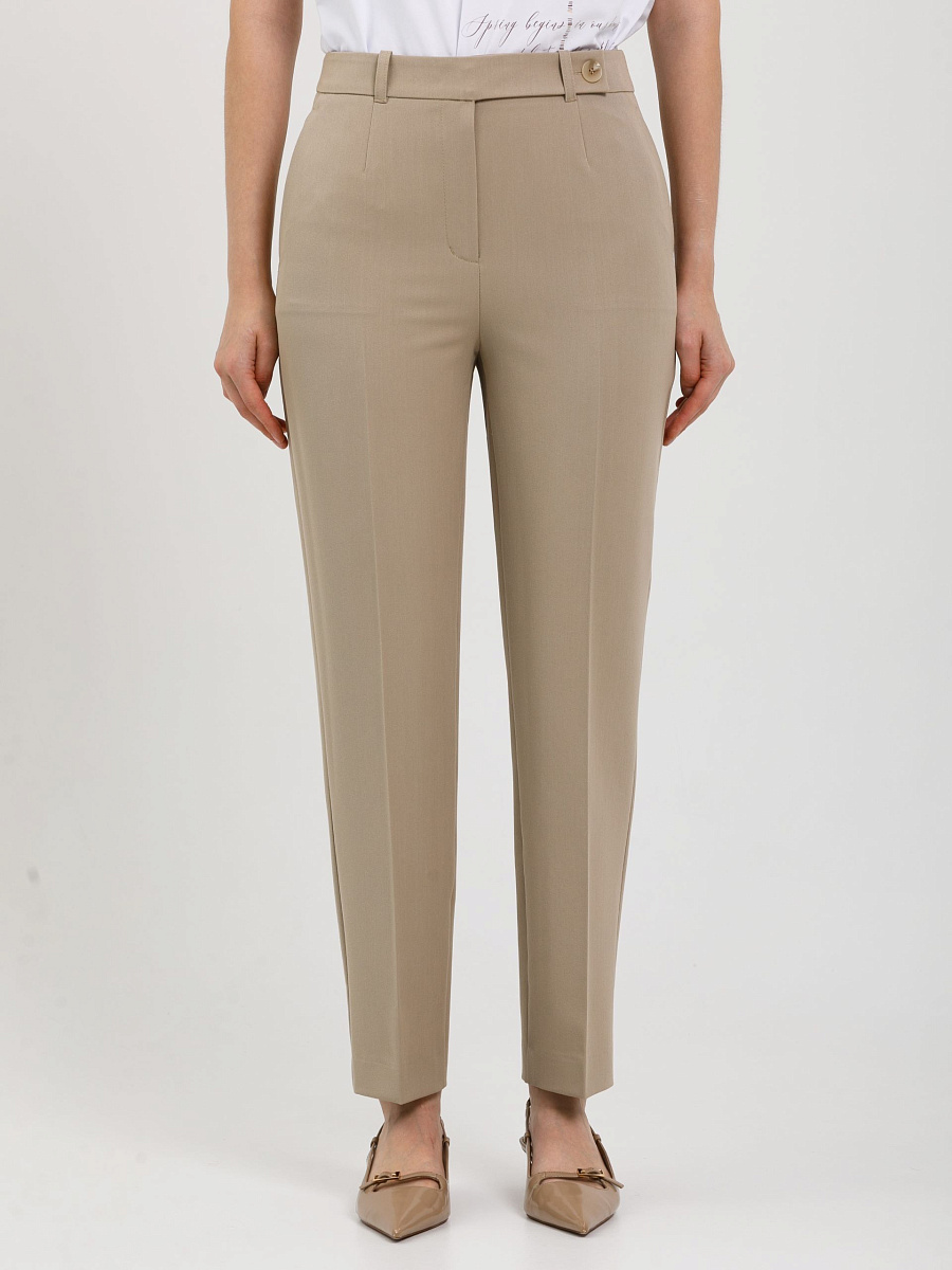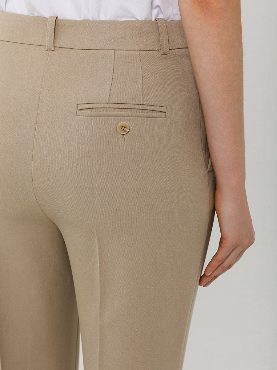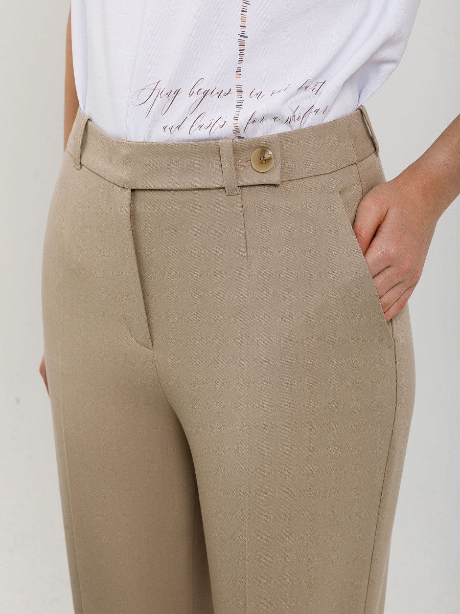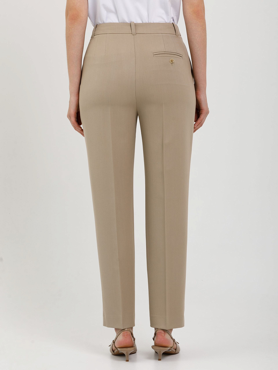 Модель зауженная к низу, со стрелками, на подкройном поясе. Пояс со шлёвками и хлястиком. Застёжка на молнию, крючки и пуговицу на поясе. Спереди карманы в подрезных. Сзади прорезной карман в рамку, застёгивающийся на пуговицу.