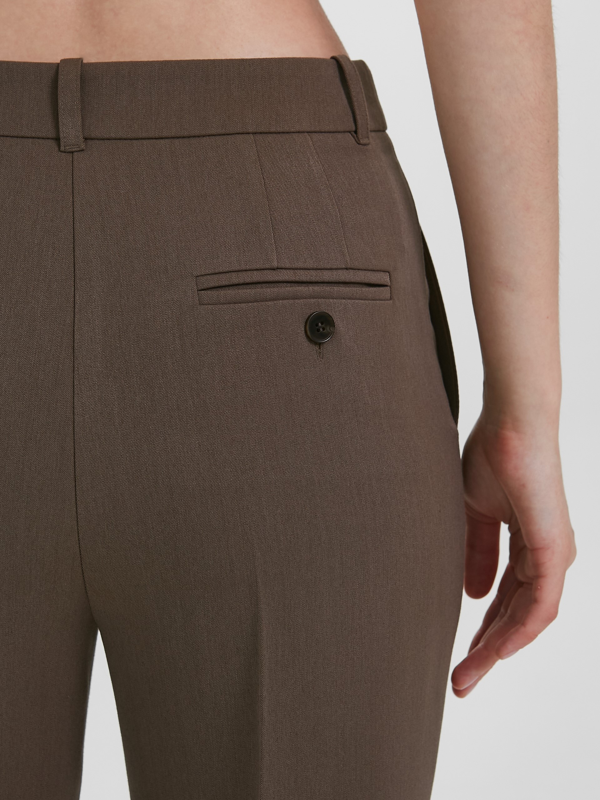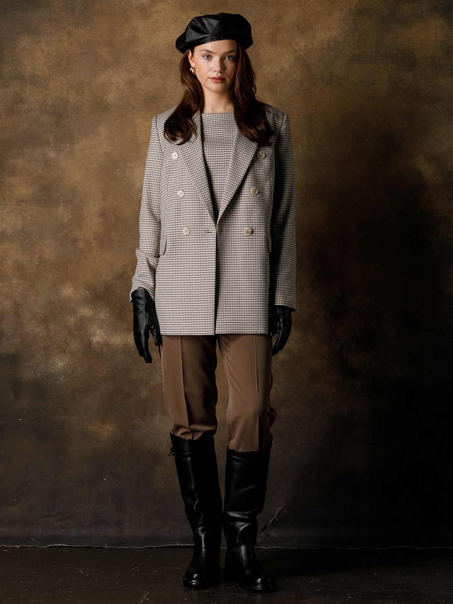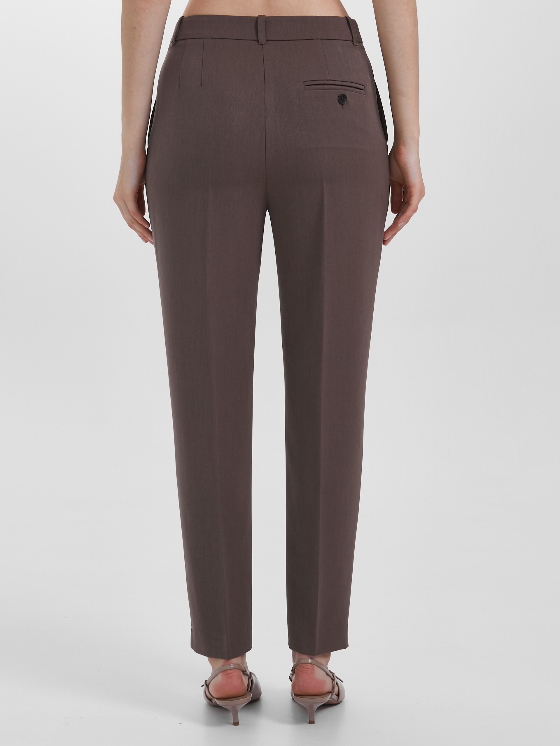 Модель зауженная к низу, со стрелками, на подкройном поясе. Пояс со шлёвками и хлястиком. Застёжка на молнию, крючки и пуговицу на поясе. Спереди карманы в подрезных. Сзади прорезной карман в рамку, застёгивающийся на пуговицу.