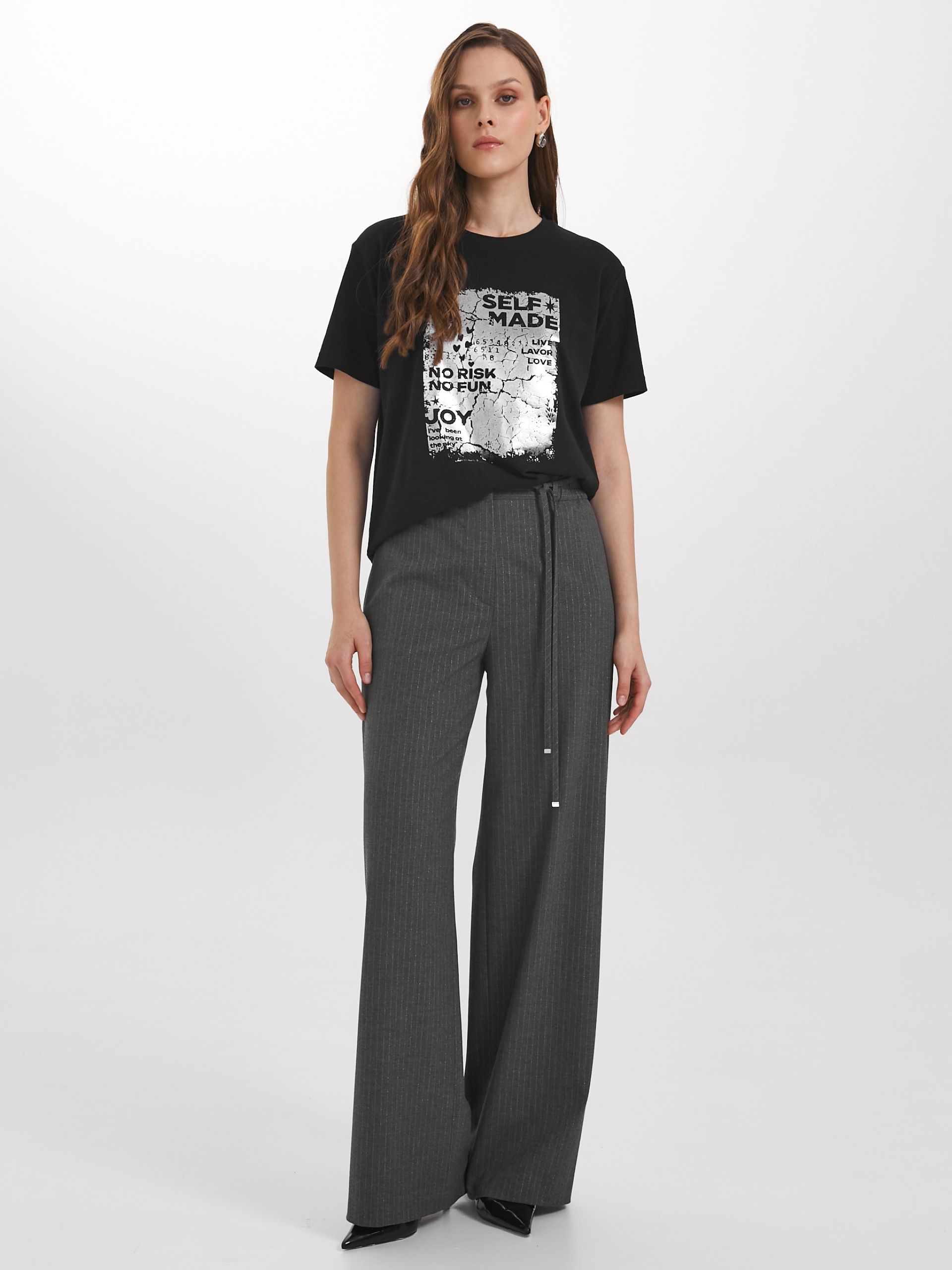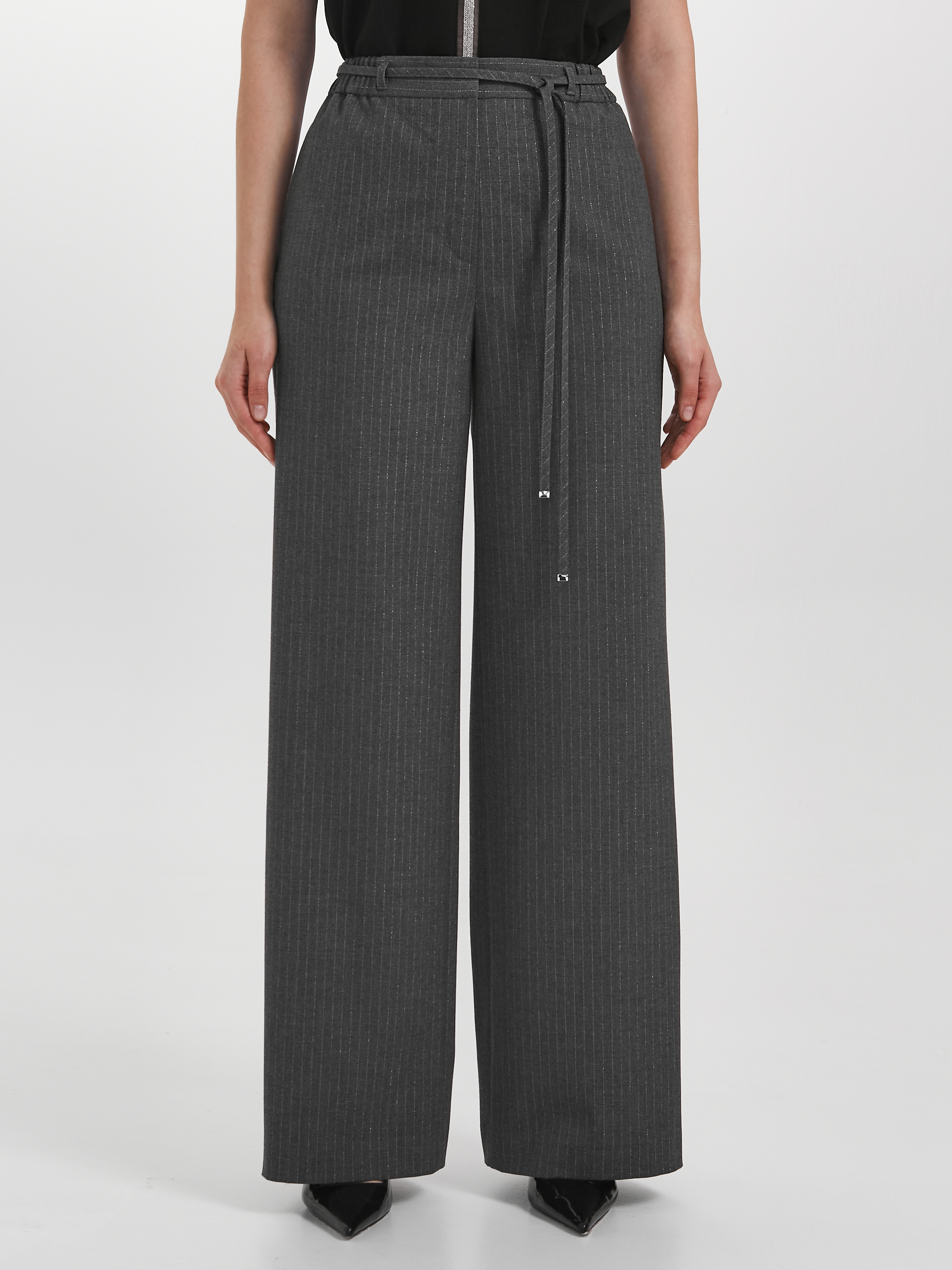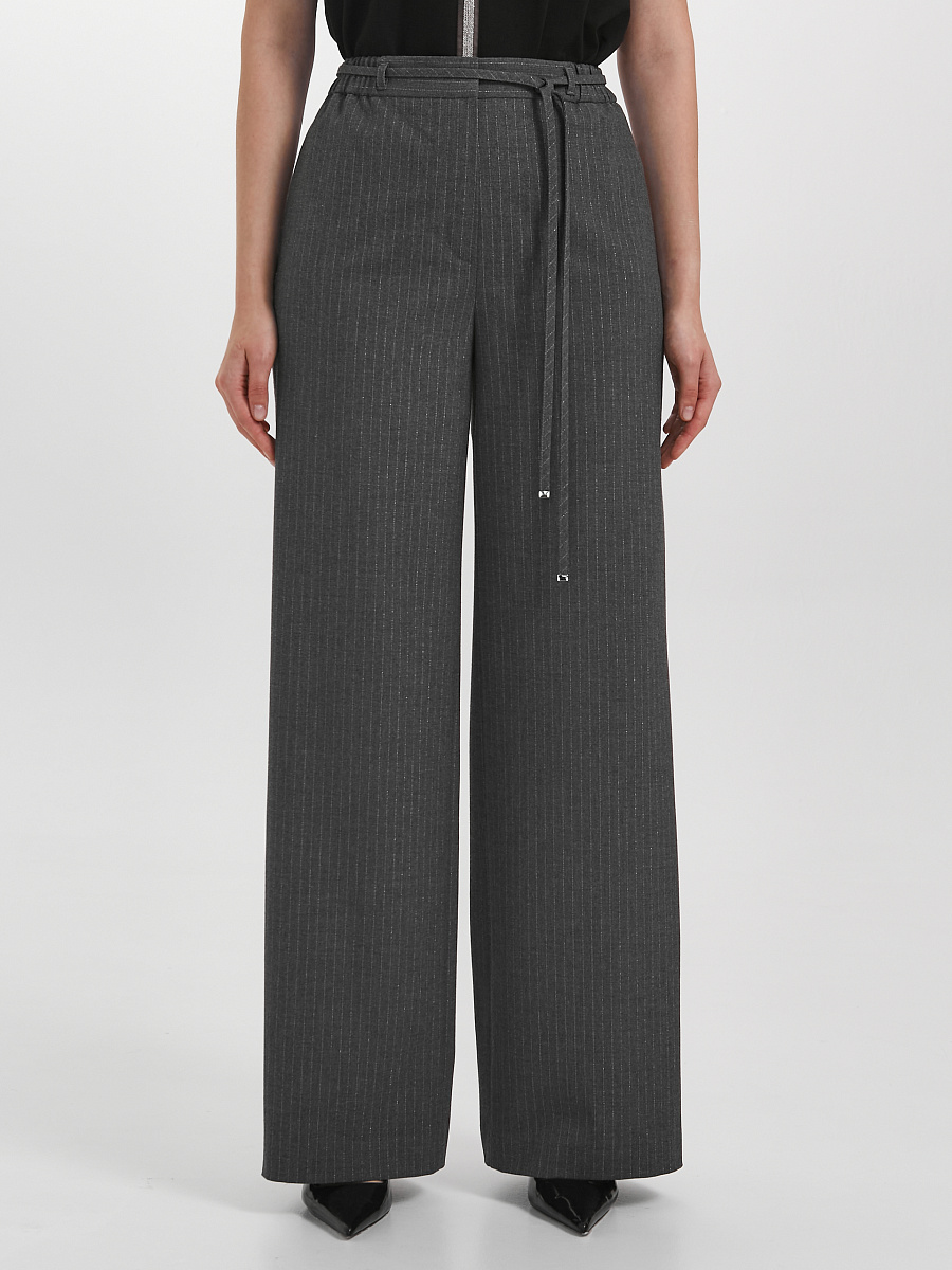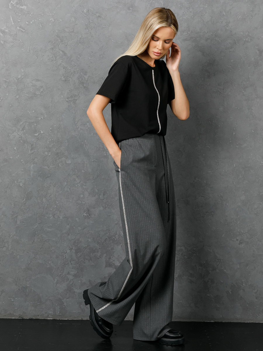 Модель прямого силуэта. Пояс притачной, с резиной и шлёвками. Застёжка на молнию и крючки с пуговицей на поясе. В боковых швах карманы и лампасы из декоративной тесьмы. Сзади прорезные карманы с листочкой. В шлёвки вставлен пояс-шнурок с наконечниками.