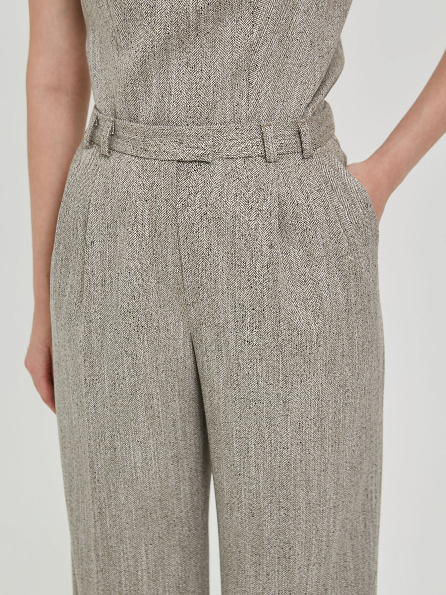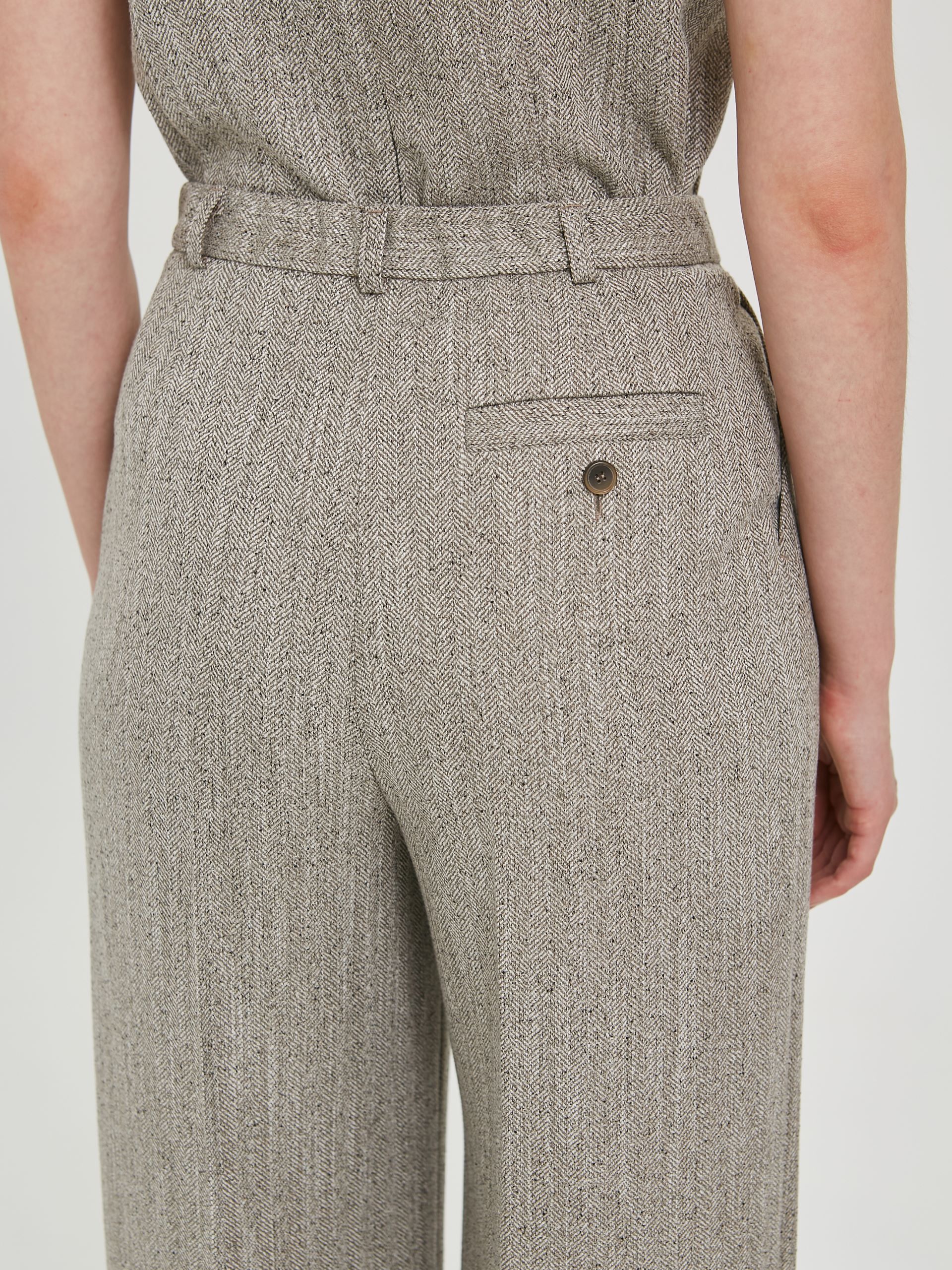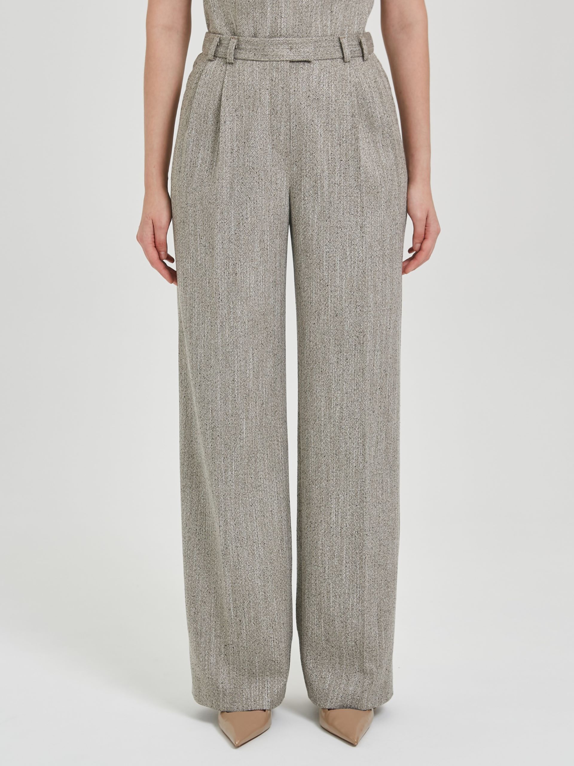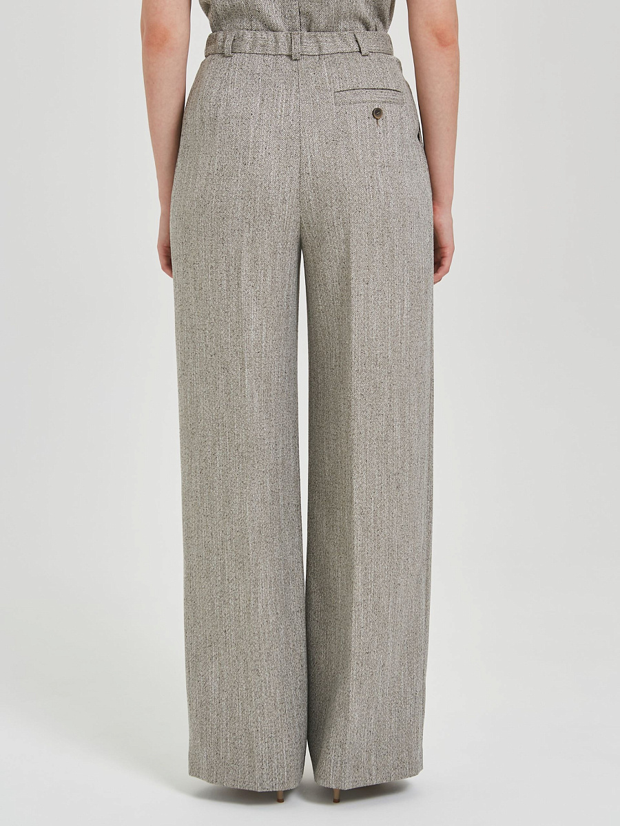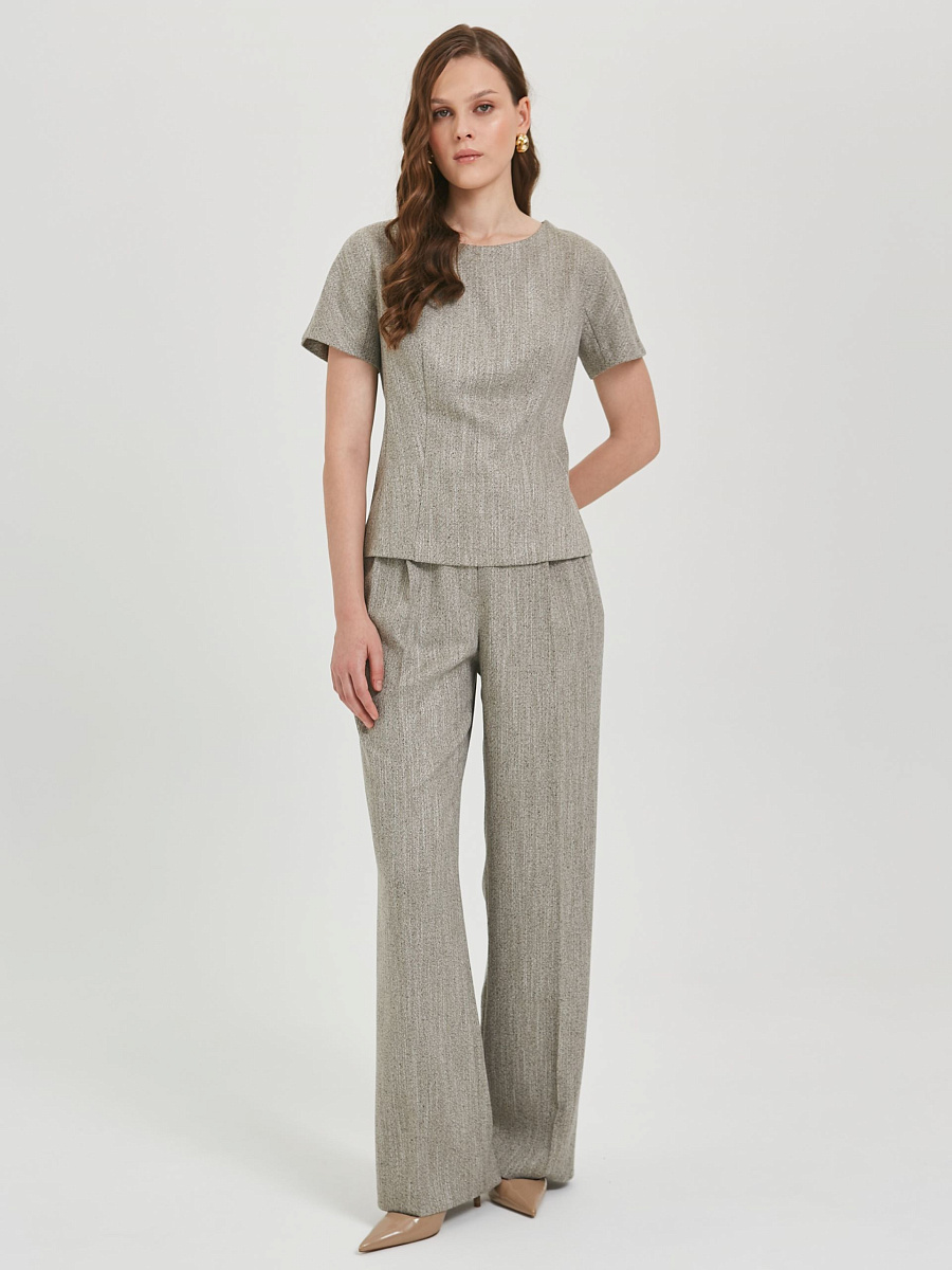 Модель прямого силуэта, на притачном поясе, со шлёвками. Сзади пояс присборен на резину. Спереди защипы и карманы в подрезных бочках. Застёжка на молнию и крючки на поясе. Сзади прорезной карман с листочкой и застёжкой на пуговицу. Ремень в комплект не входит.