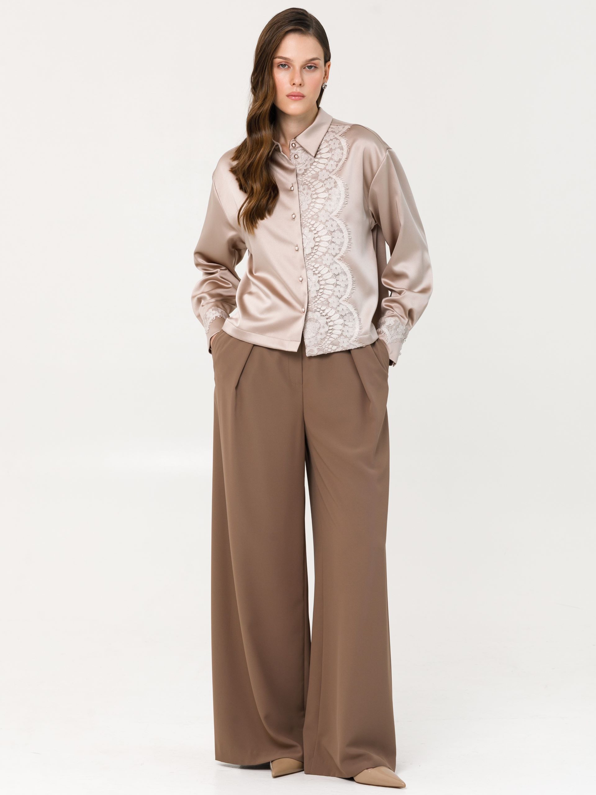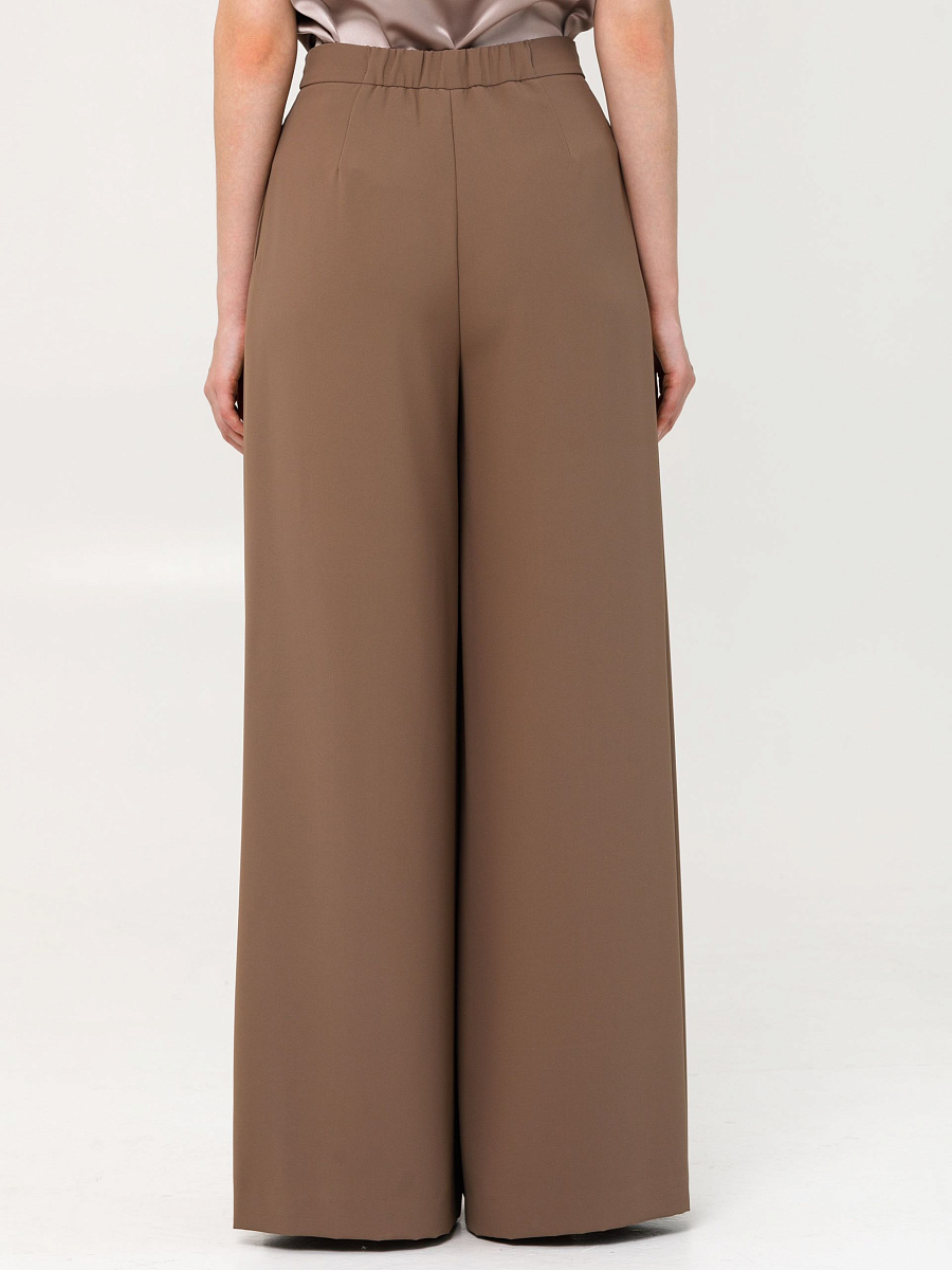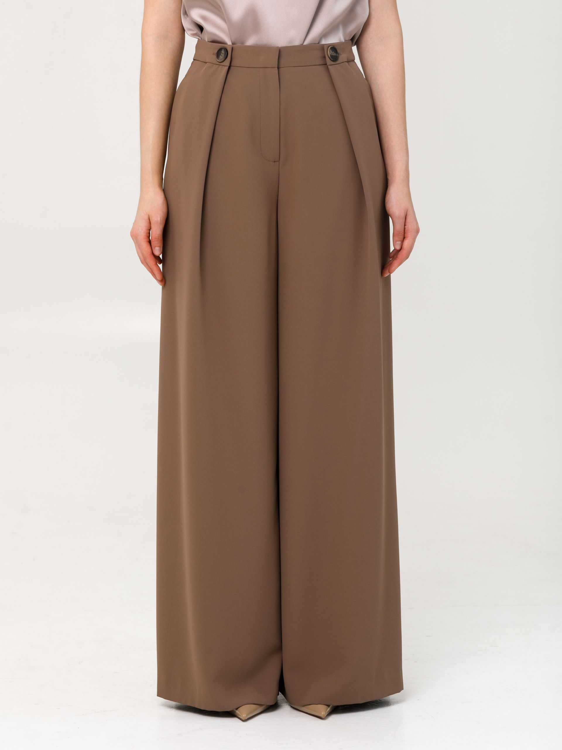 Модель свободного кроя. Пояс комбинированный, спереди - подкройной, сзади - притачной со сборкой на резину. Застёжка на молнию и крючки на поясе. В боковых швах карманы. Глубокие складки спереди застёгиваются на пуговицы.