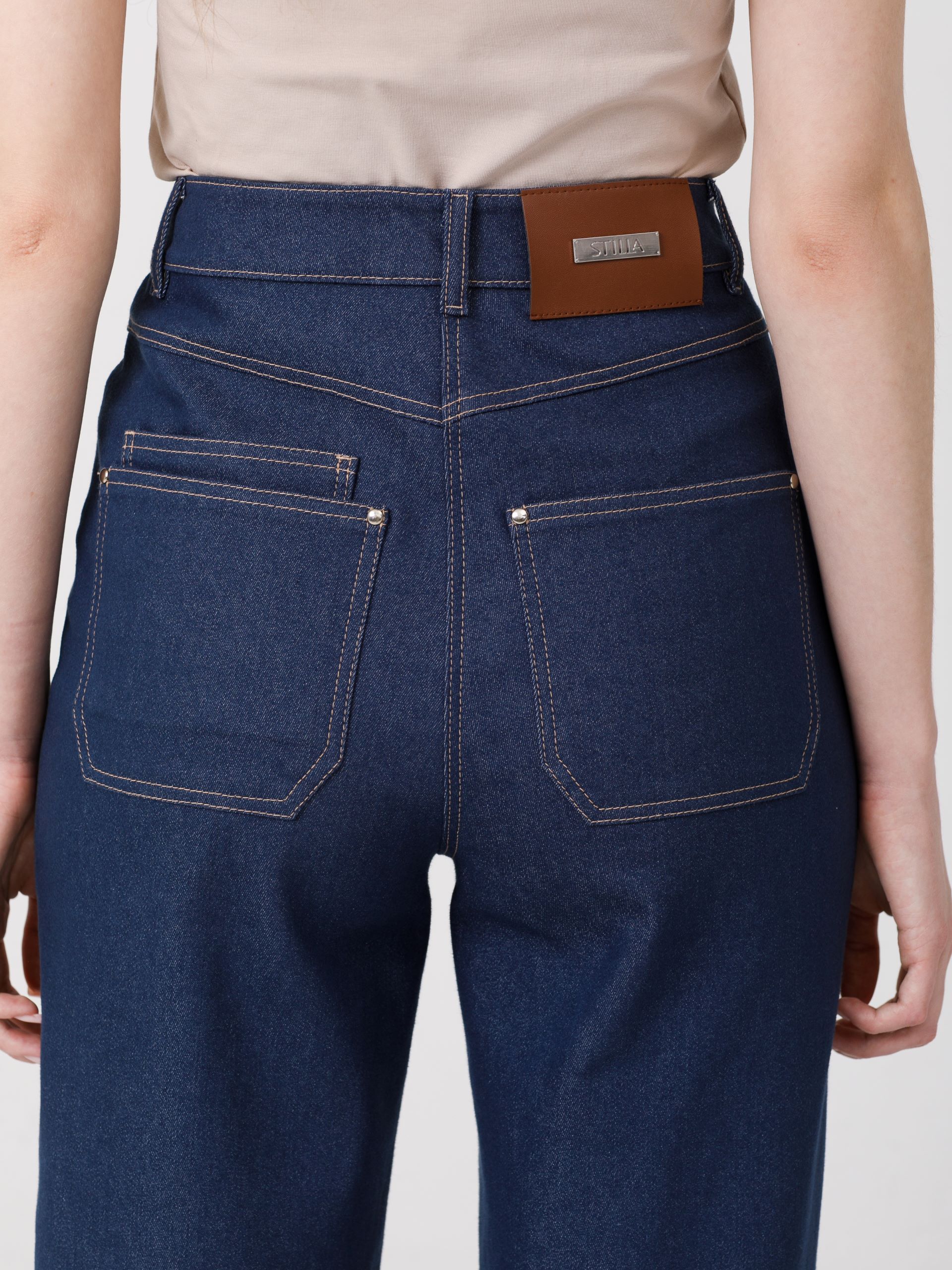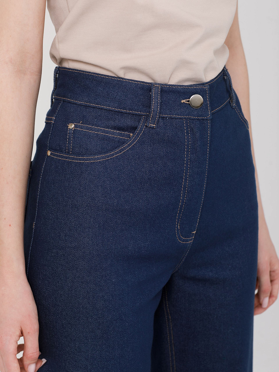 Модель прямого силуэта. Пояс подкройной, со шлёвками. Застёжка на молнию и пуговицу на поясе. Спереди карманы в подрезных бочках. Сзади кокетки и фигурные накладные карманы. Брюки декорированы хольнитенами и отделочными строчками.Ремень в комплект не входит.