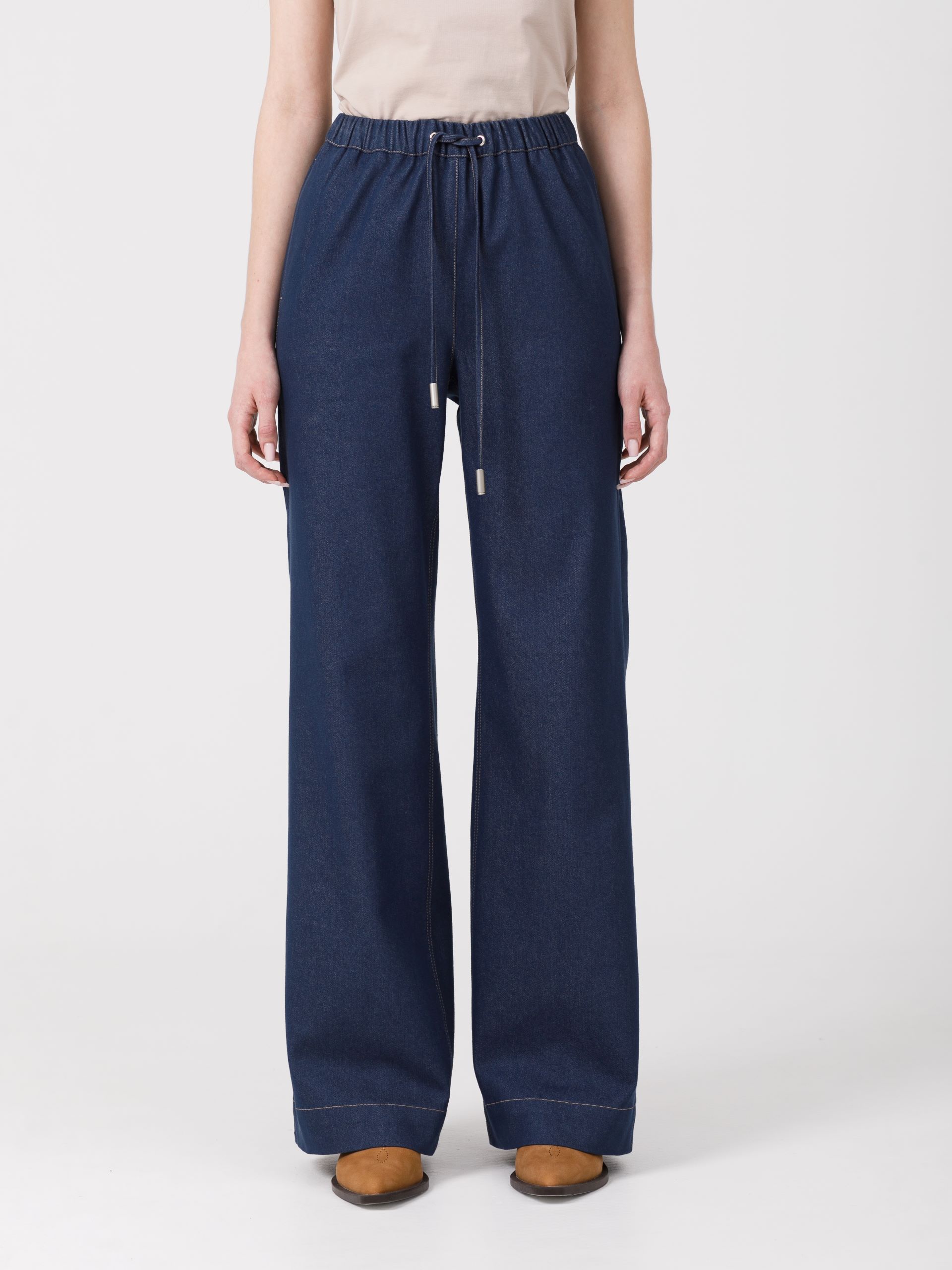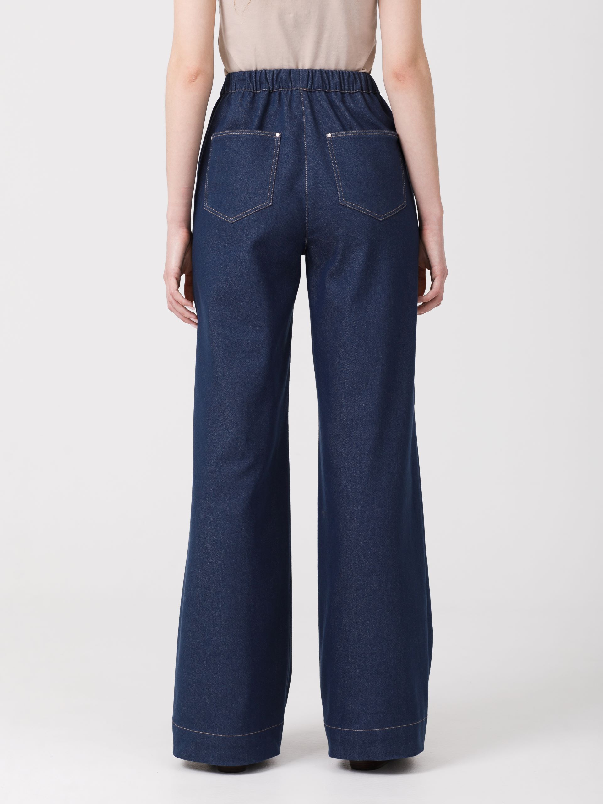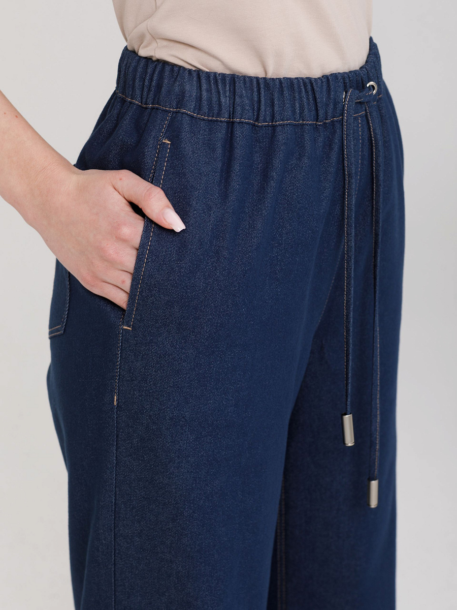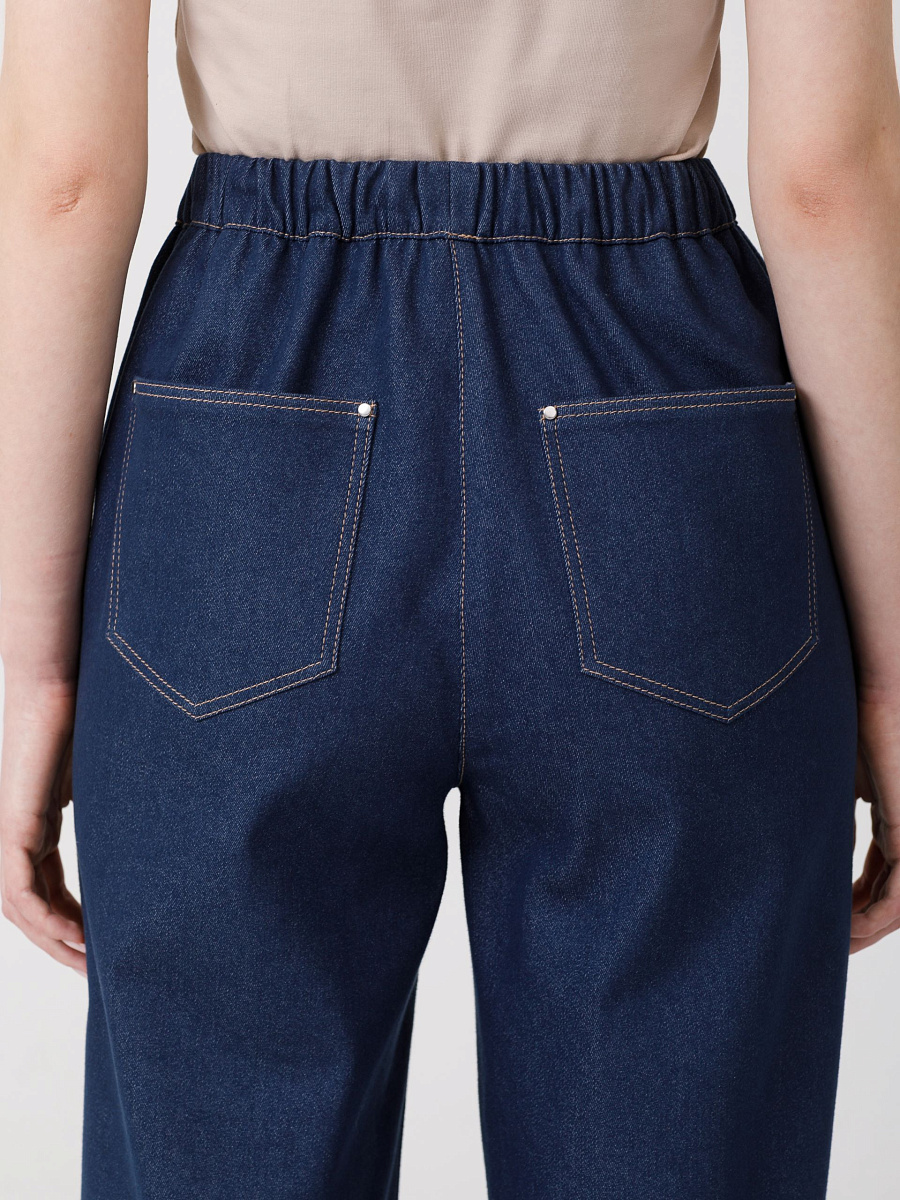 Модель прямого силуэта. В боковых швах карманы. Сзади фигурные накладные карманы с хольнитенами. Пояс притачной, с резиной и кулисой, в которую через люверсы вставлен шнурок из основной ткани с наконечниками. Джинсы декорированы отделочными строчками.