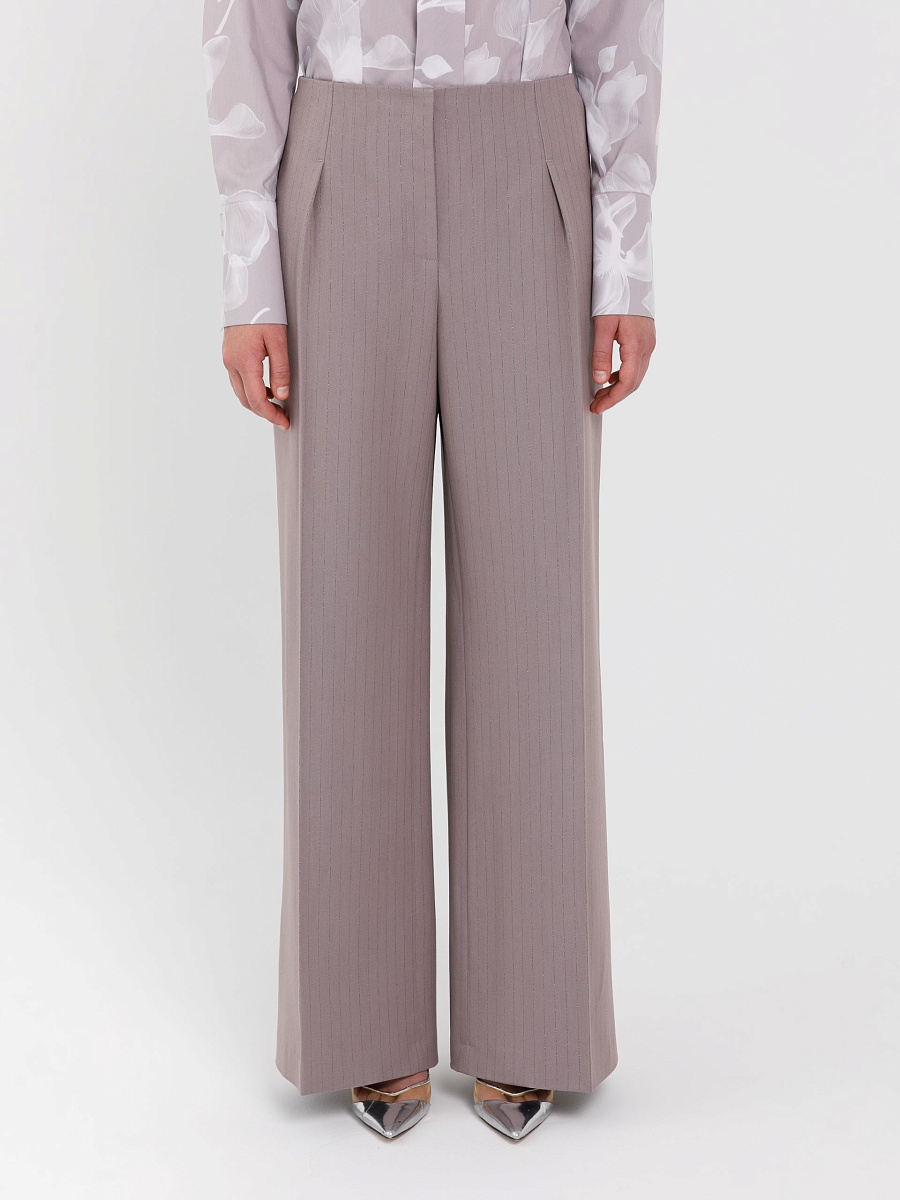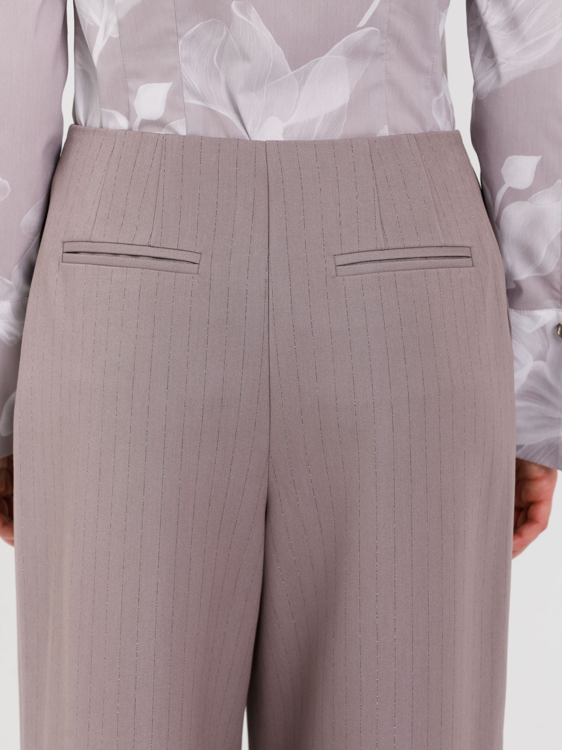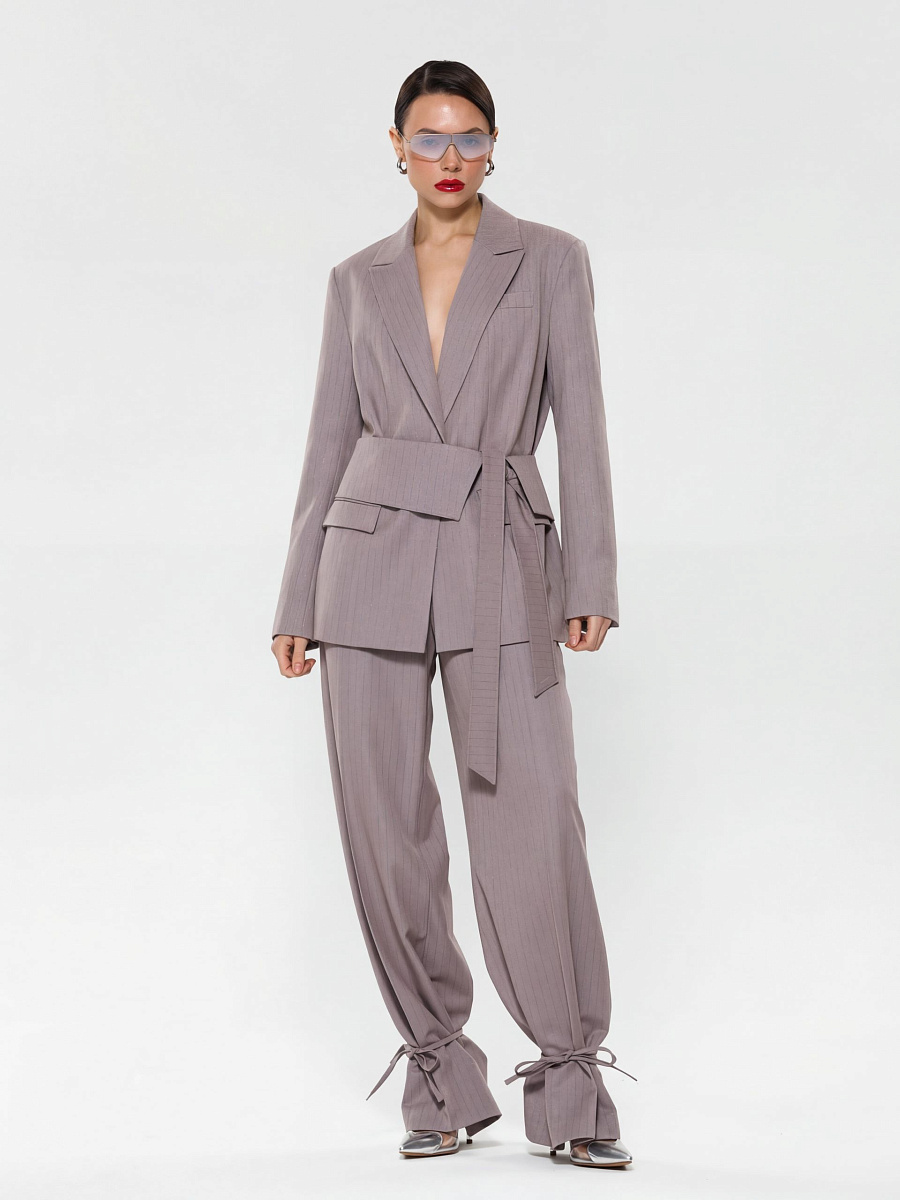 Модель прямого силуэта, низкой посадки, без пояса. Спереди по талии застрочены защипы, в подрезных бочках карманы. Застёжка на крючок и потайную пуговицу. Сзади прорезные карманы в рамку. По низу брюк в швы всталяются съёмные завязки.