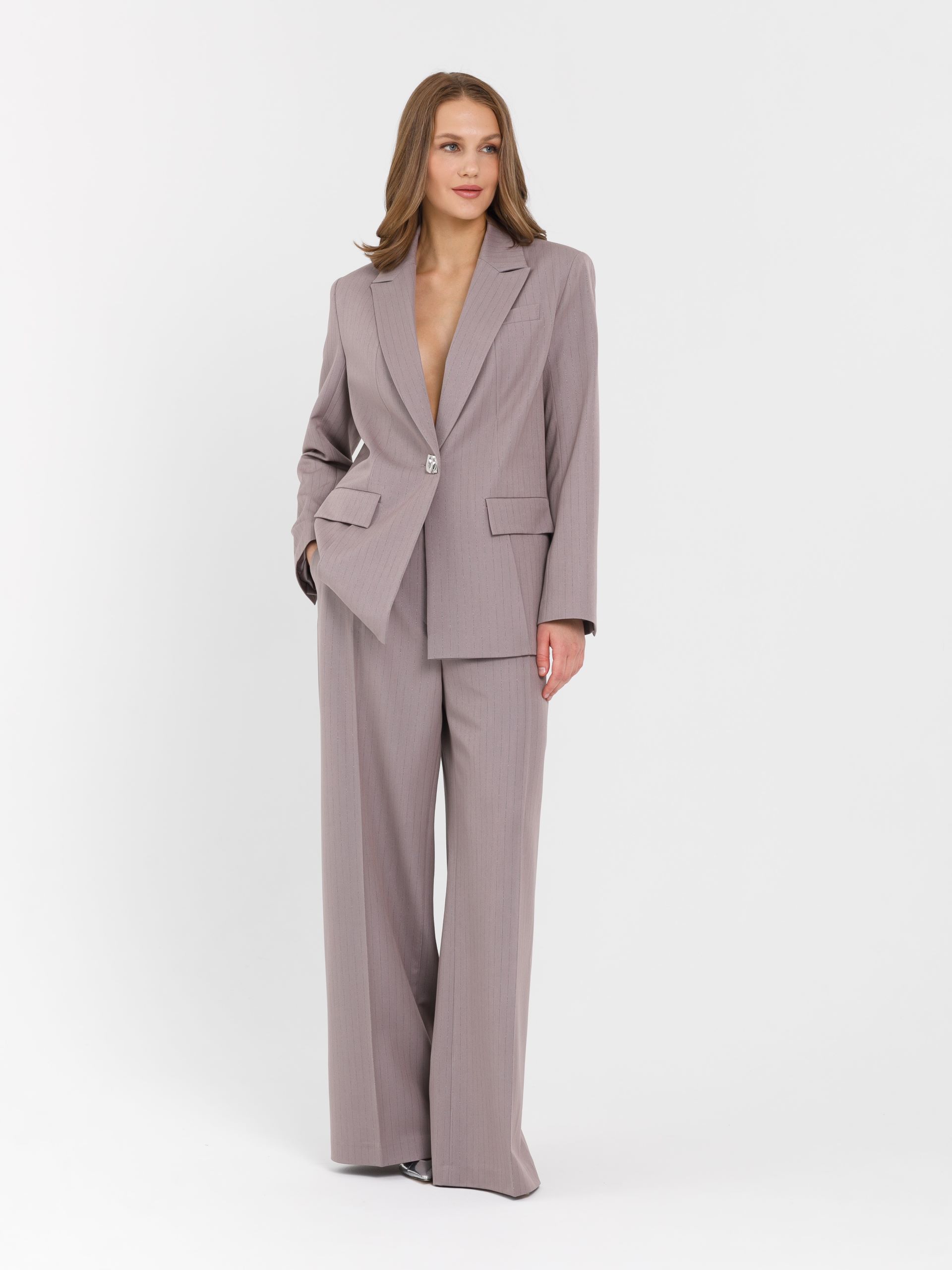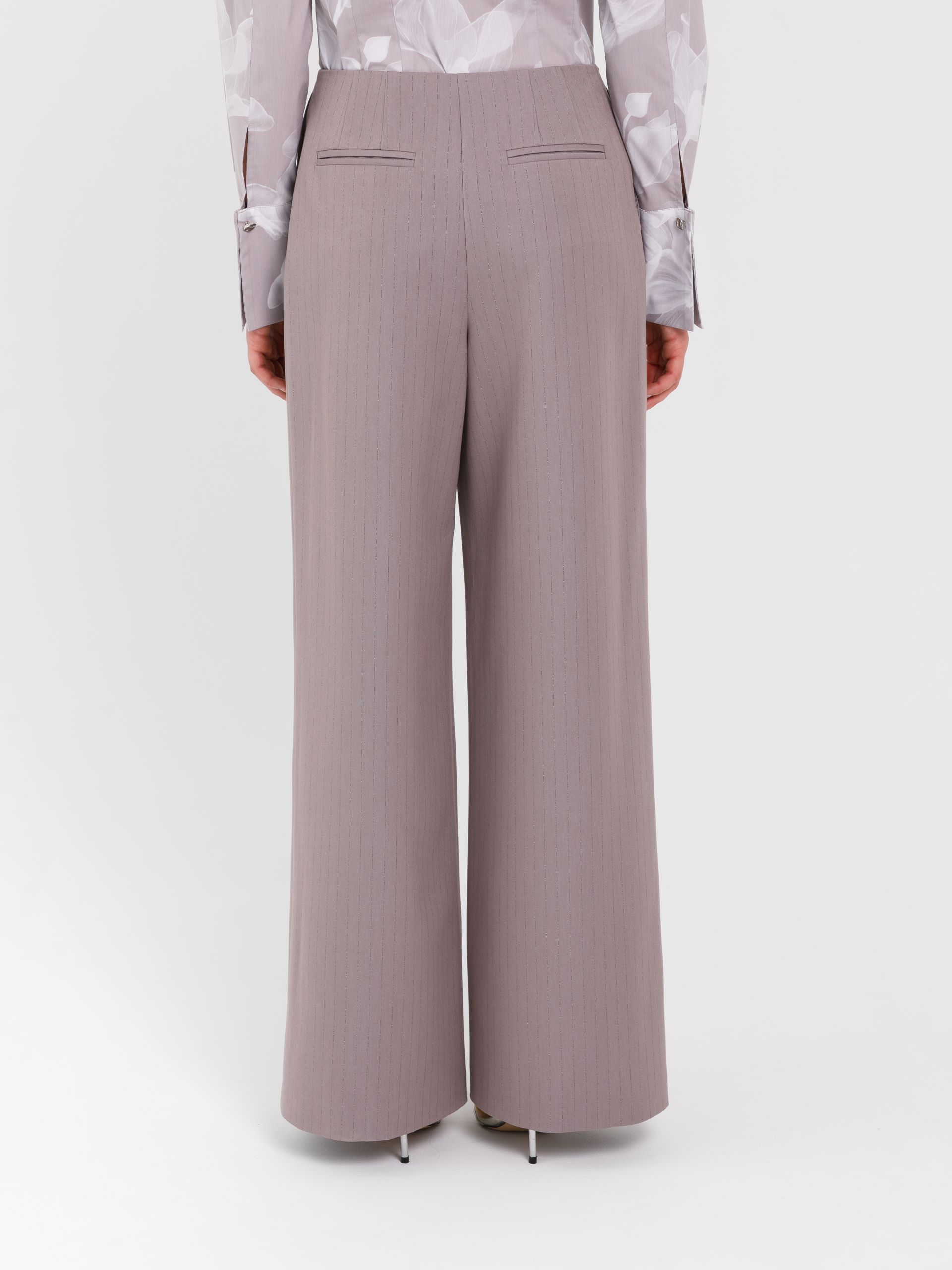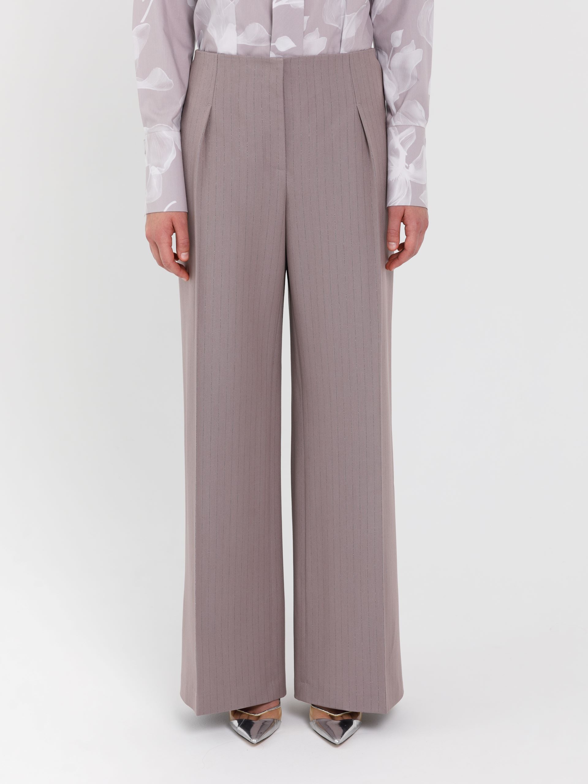 Модель прямого силуэта, низкой посадки, без пояса. Спереди по талии застрочены защипы, в подрезных бочках карманы. Застёжка на крючок и потайную пуговицу. Сзади прорезные карманы в рамку. По низу брюк в швы всталяются съёмные завязки.