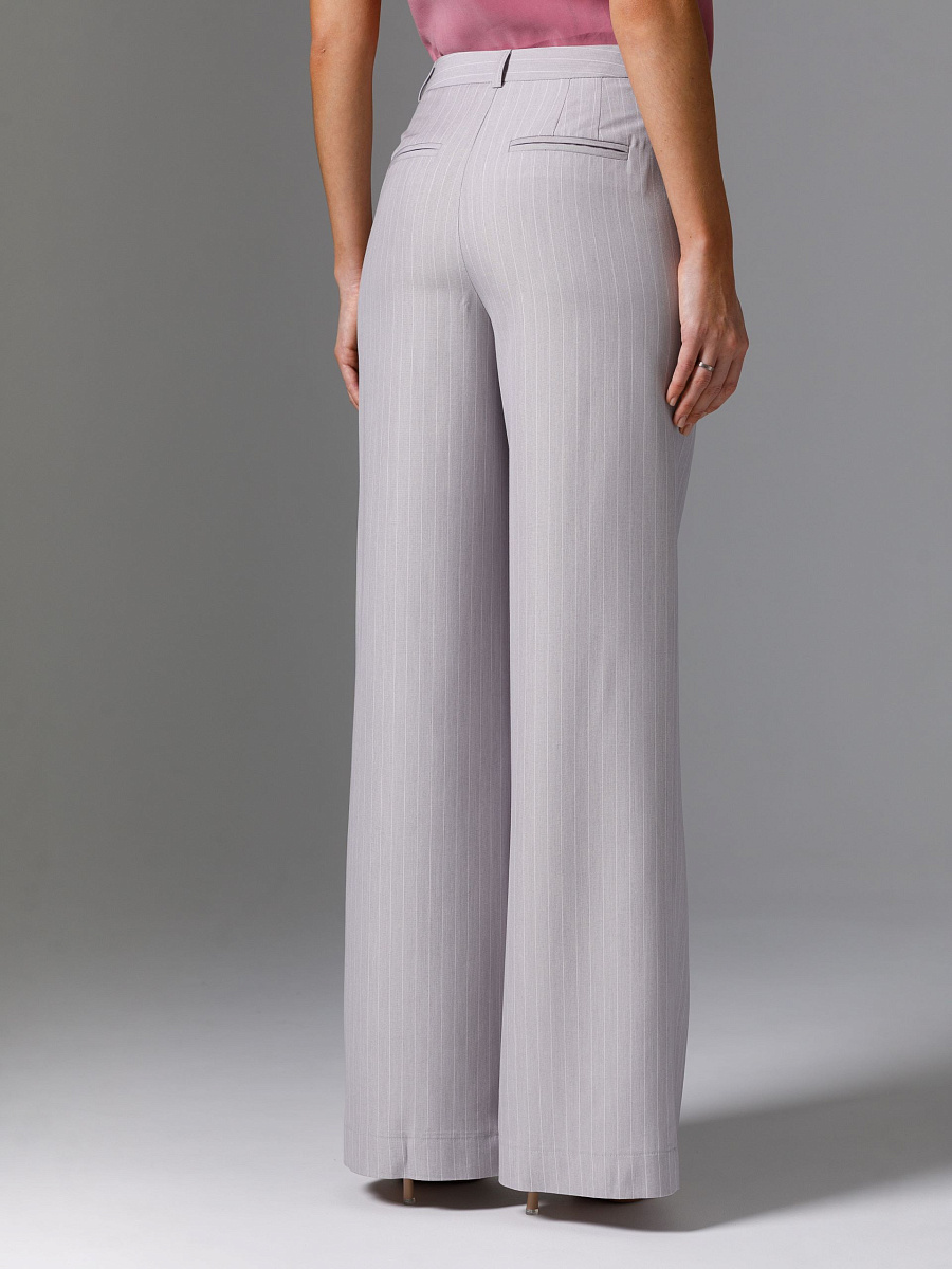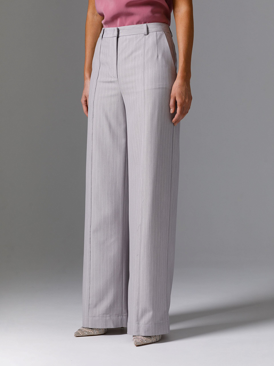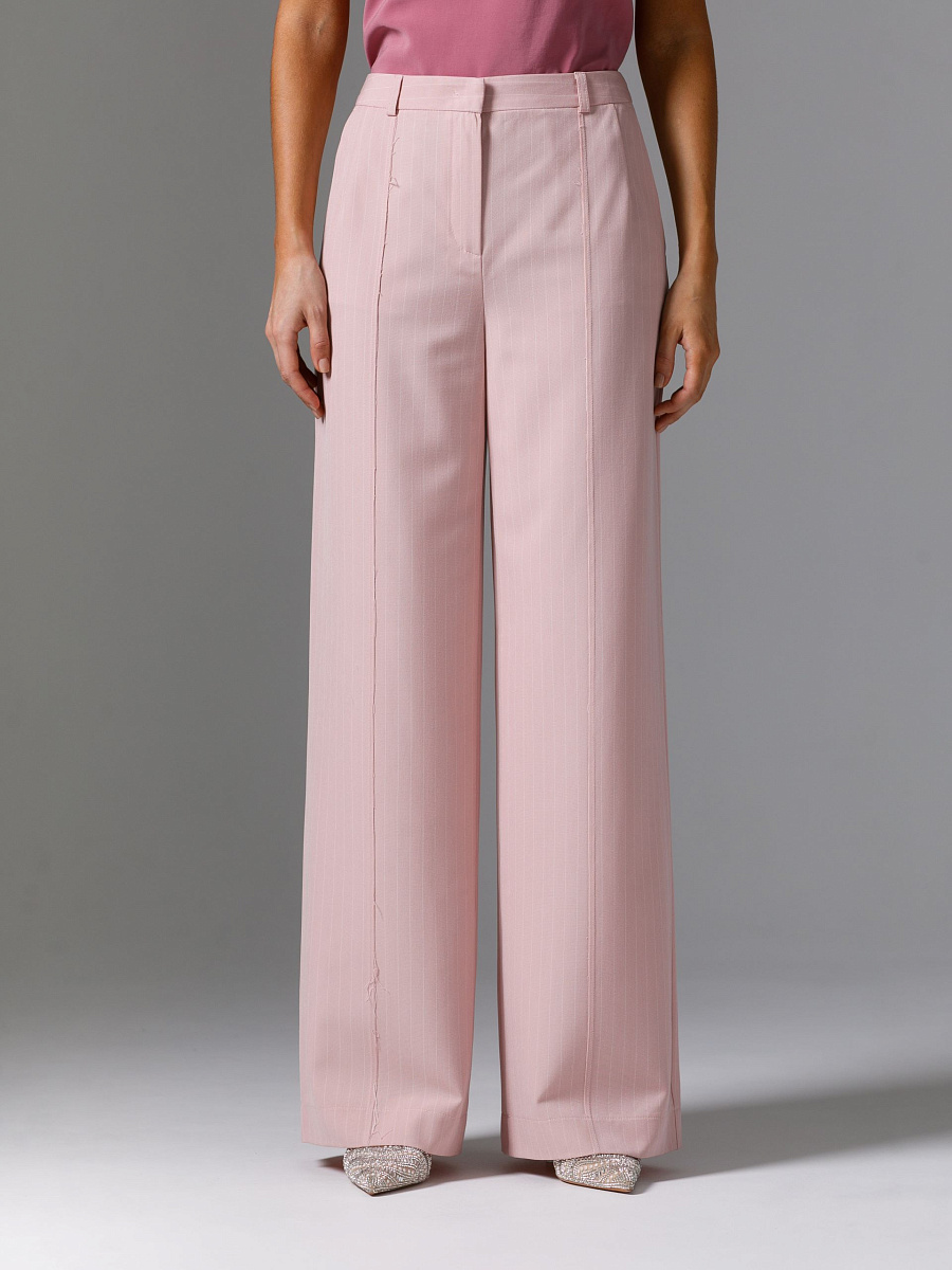 Модель прямого силуэта, на подкройном поясе, со шлёвками. Застёжка на молнию, потайную пуговицу и крючки на поясе. Спереди карманы в подрезных бочках и вертикальные подрезы, обработанные швами с открытыми срезами. Сзади прорезные карманы в рамку. Ремень в комплект не входит.