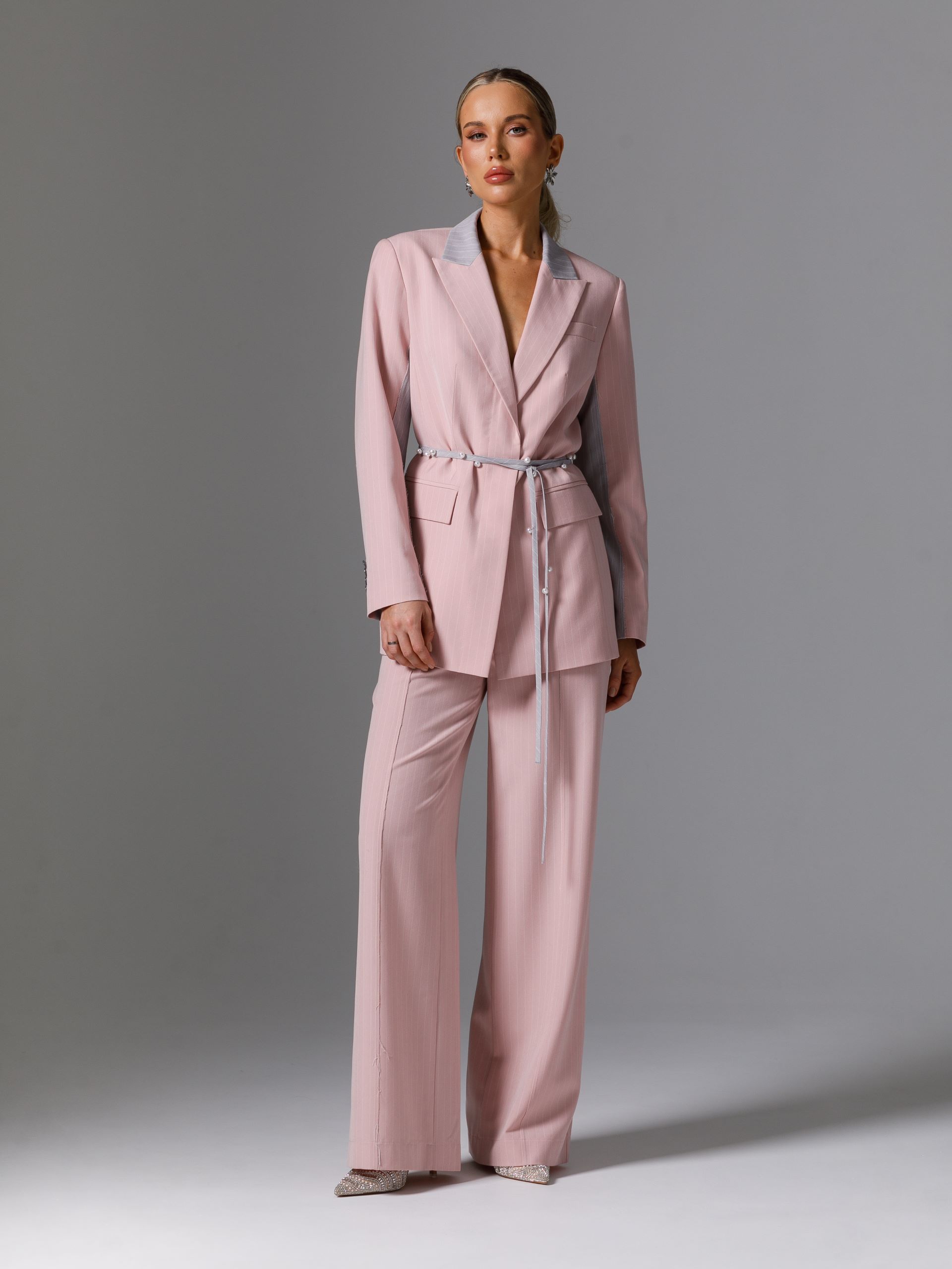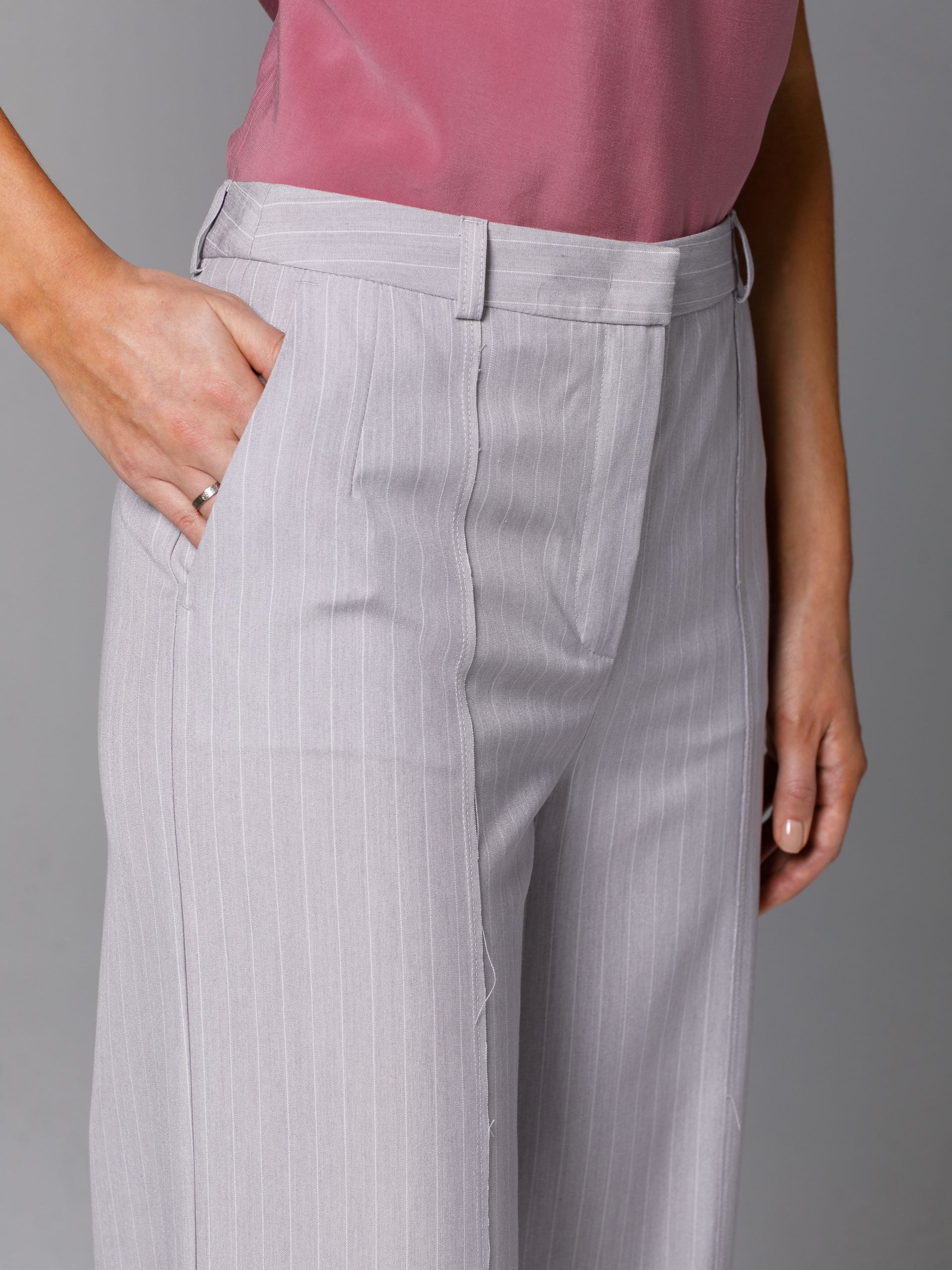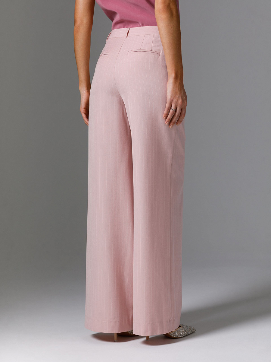 Модель прямого силуэта, на подкройном поясе, со шлёвками. Застёжка на молнию, потайную пуговицу и крючки на поясе. Спереди карманы в подрезных бочках и вертикальные подрезы, обработанные швами с открытыми срезами. Сзади прорезные карманы в рамку. Ремень в комплект не входит.