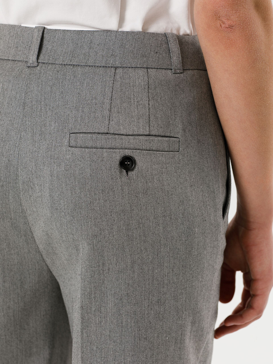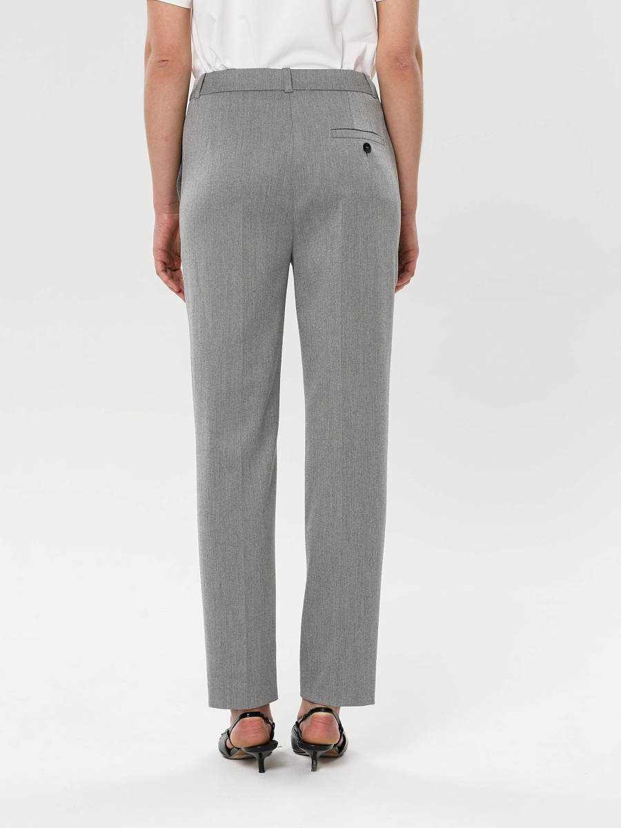 Модель зауженная к низу, со стрелками, на подкройном поясе. Пояс со шлёвками и хлястиком. Застёжка на молнию, крючки и пуговицу на поясе. Спереди карманы в подрезных. Сзади прорезной карман с листочкой, застёгивающийся на пуговицу.