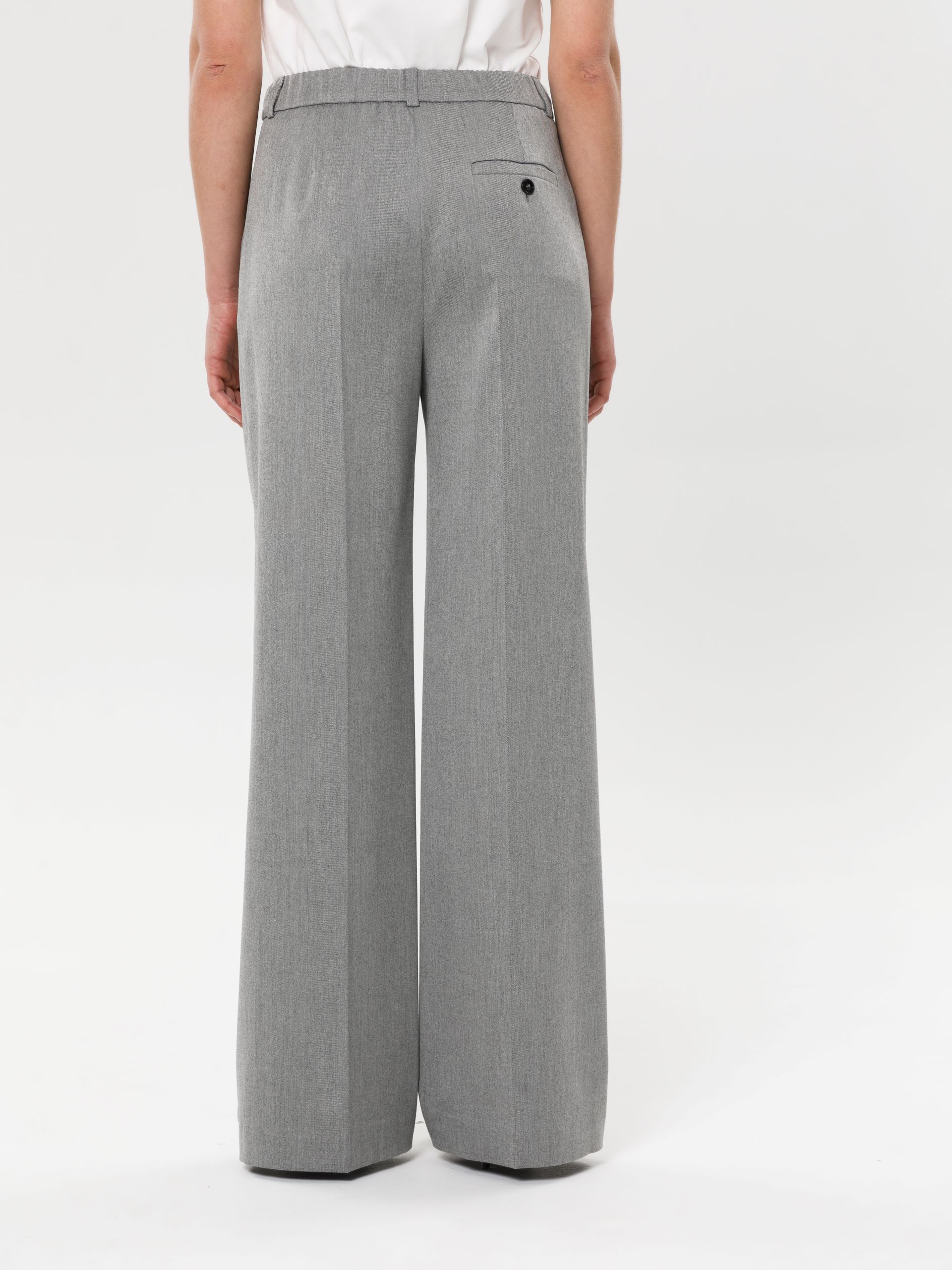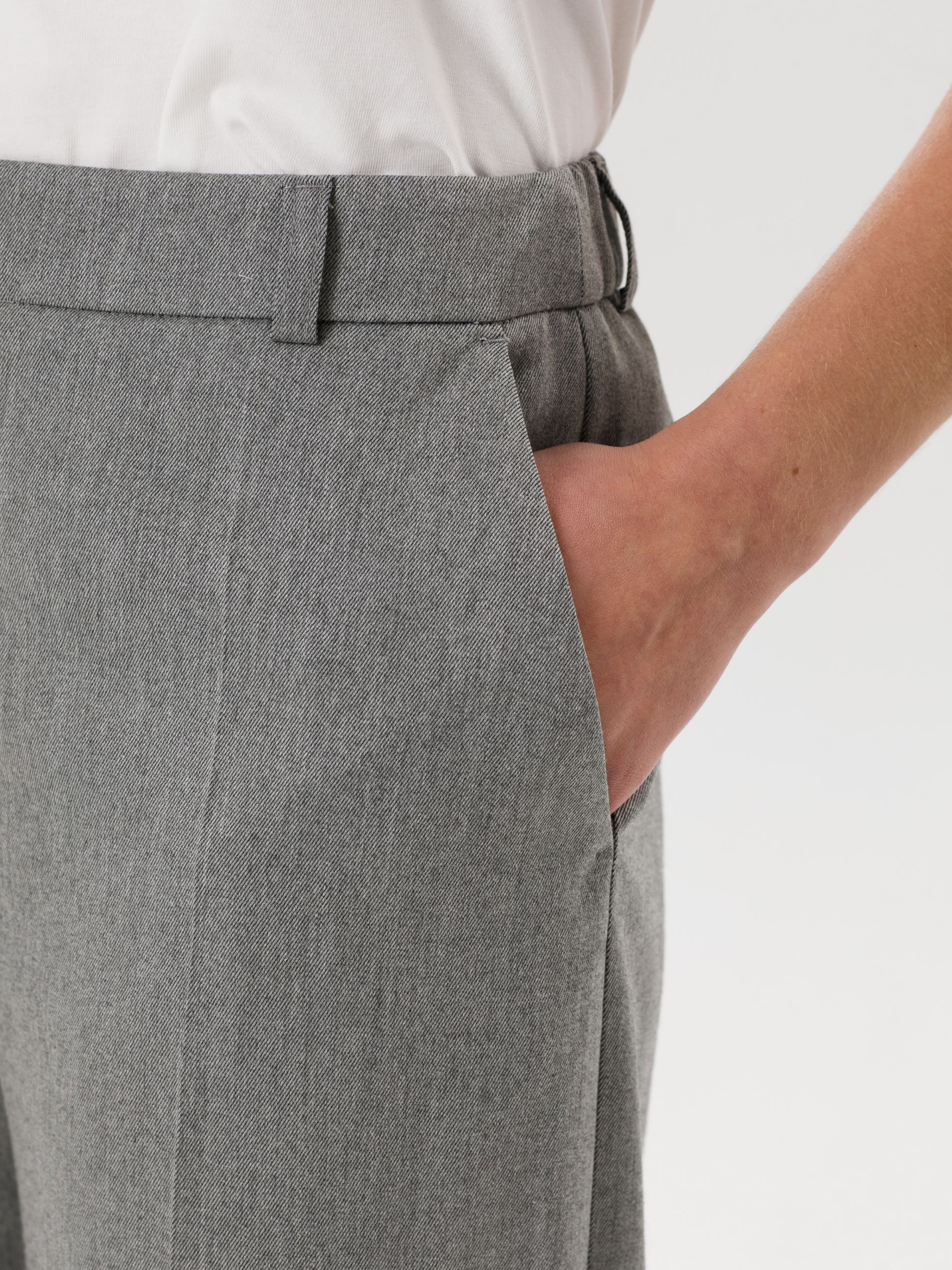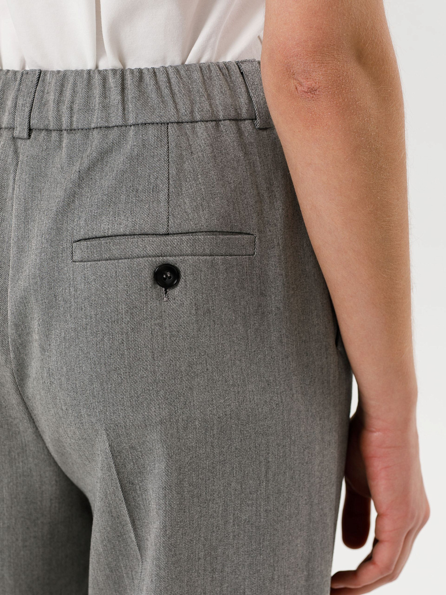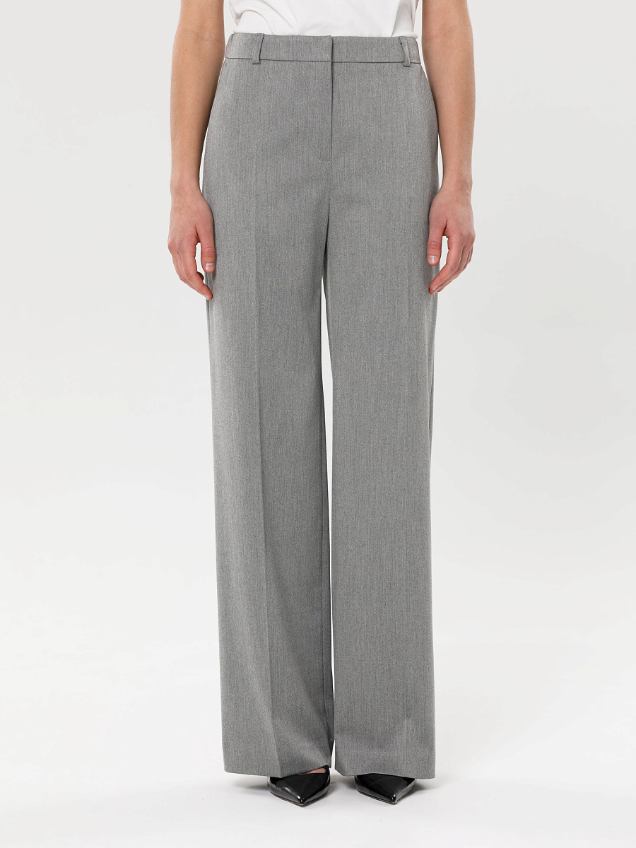 Модель прямого силуэта. Пояс комбинированный, со шлёвками, сзади собран на резину. Спереди карманы в подрезных бочках. Застёжка на молнию и крючки на поясе. Сзади прорезной карман с листочкой и застёжкой на пуговицу. Ремень в комплект не входит.