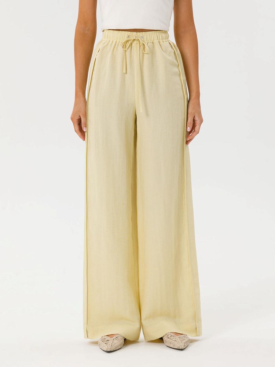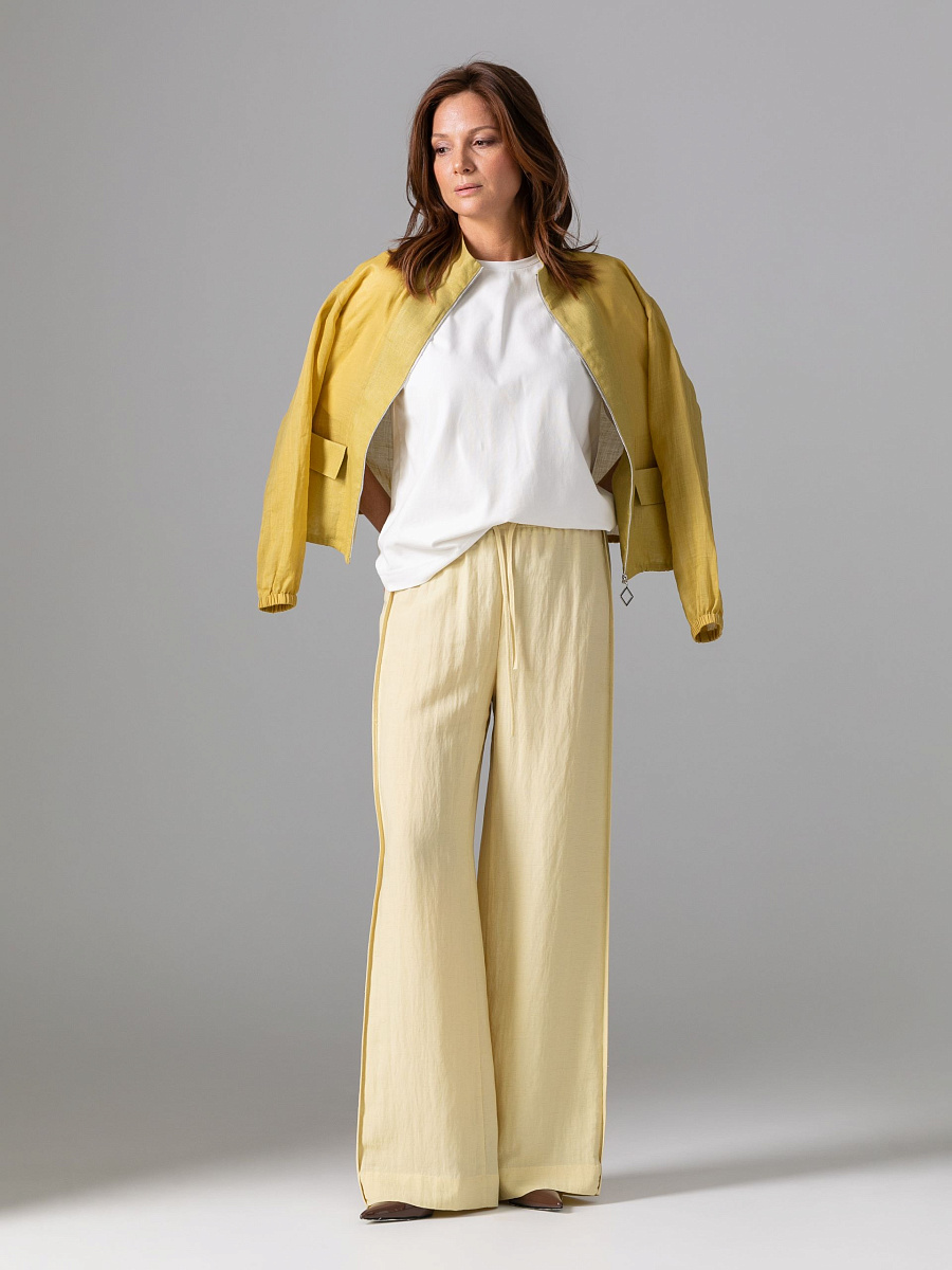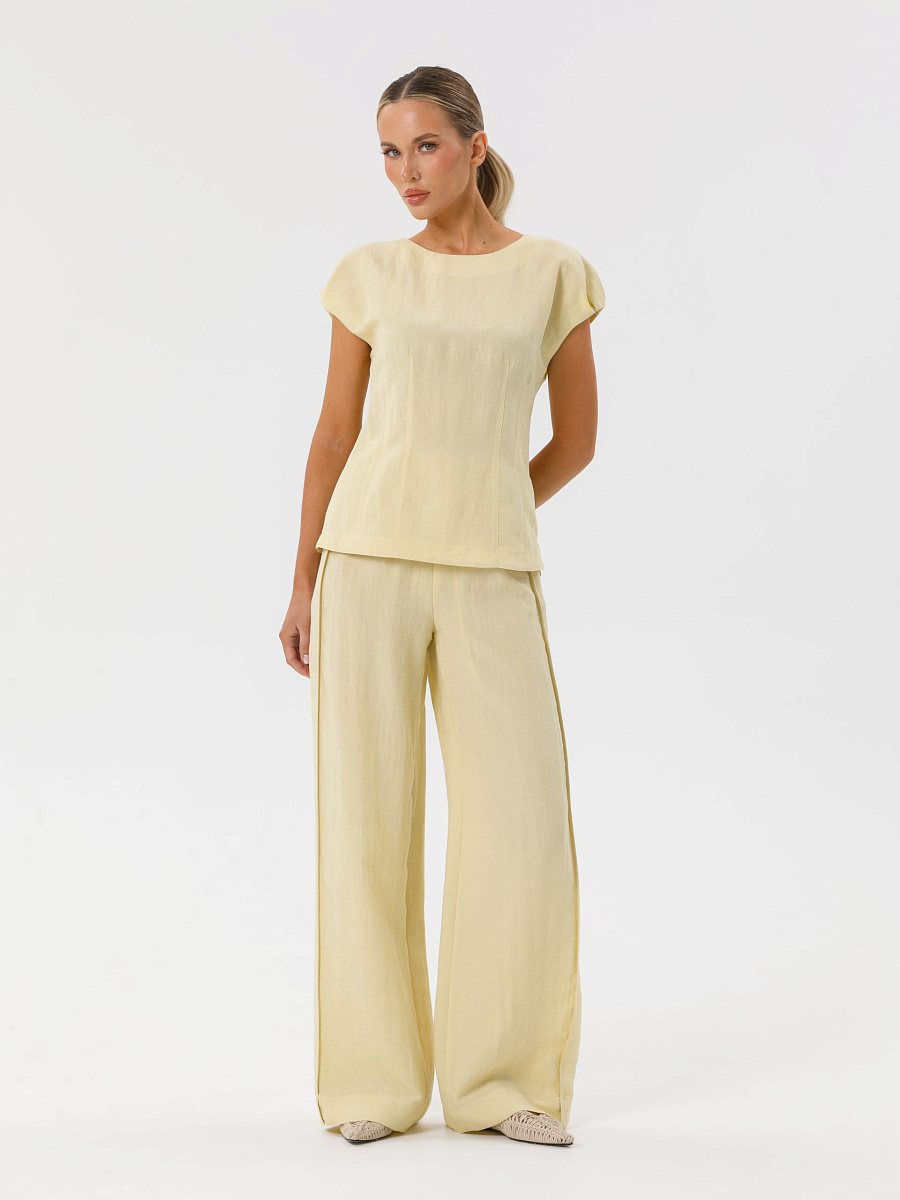 Модель прямого силуэта, с высокой посадкой, без подклада, на эластичном поясе. Боковые швы смещены на перед, окантованы на лицо. Сзади фигурные накладные карманы. Пояс притачной, с резиной и завязками.
