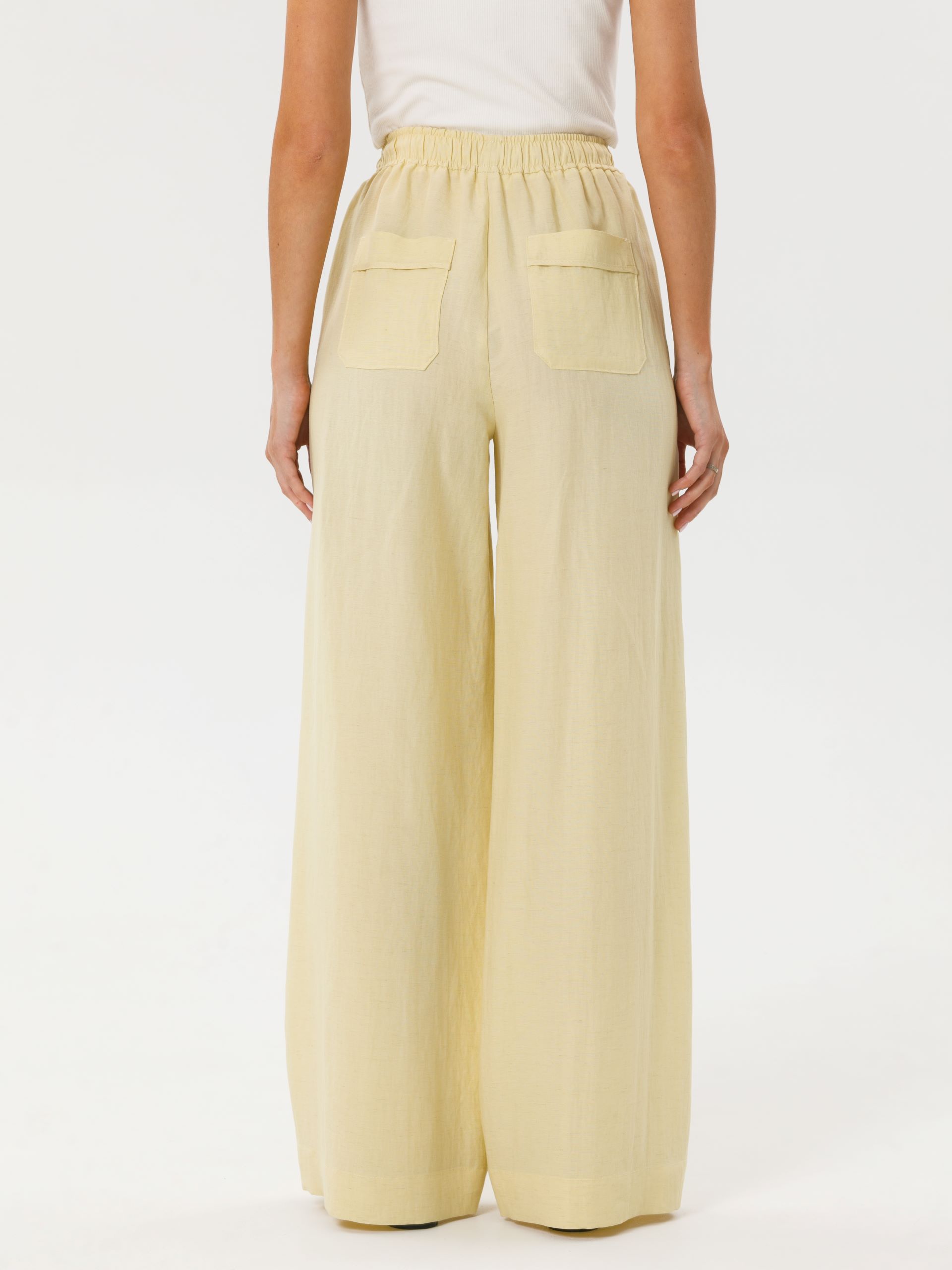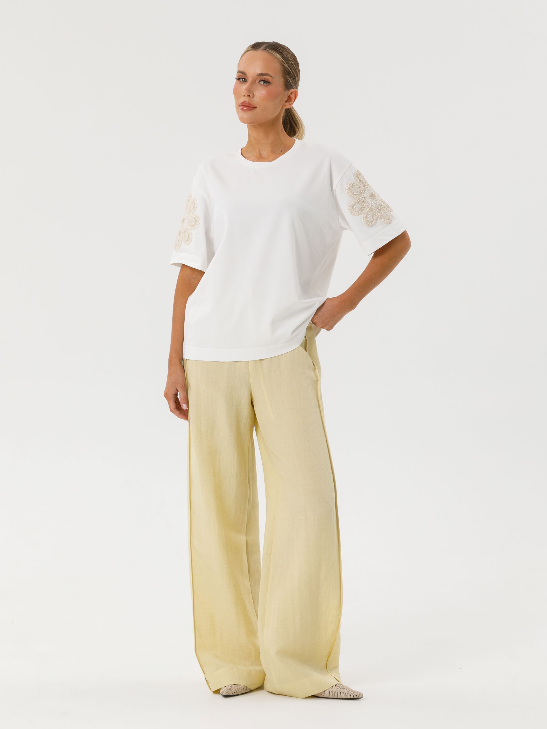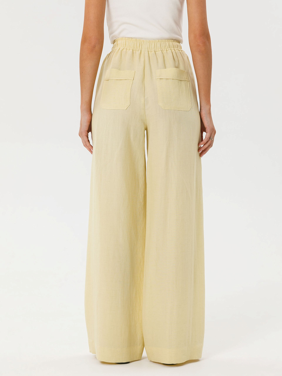 Модель прямого силуэта, с высокой посадкой, без подклада, на эластичном поясе. Боковые швы смещены на перед, окантованы на лицо. Сзади фигурные накладные карманы. Пояс притачной, с резиной и завязками.