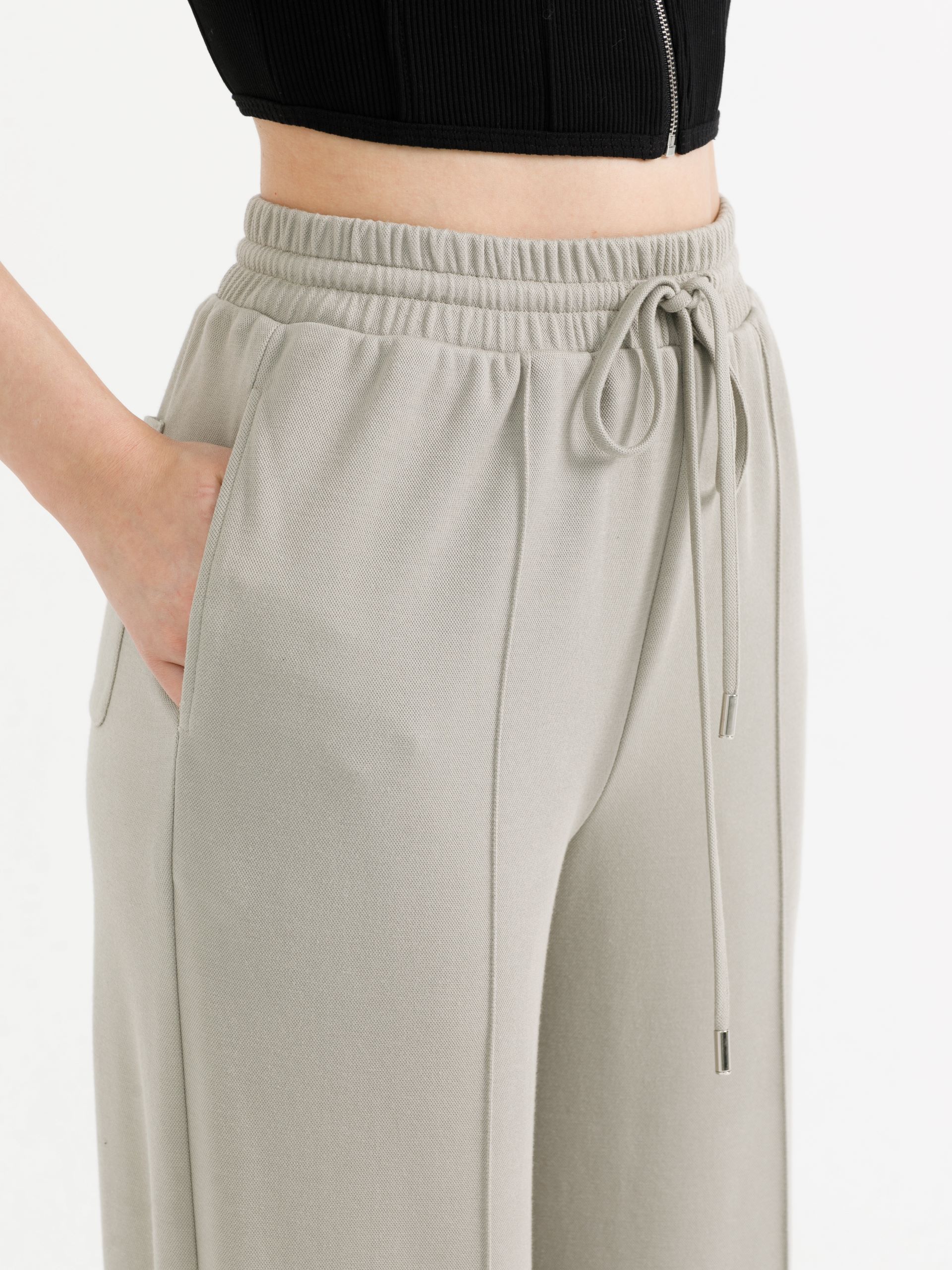 Модель прямого силуэта, с высокой посадкой. Спереди застрочены стрелки. В боковых швах карманы. Сзади накладной карман. Пояс притачной, с резиой и кулисой, в которую вставлен шнурок с наконечниками.