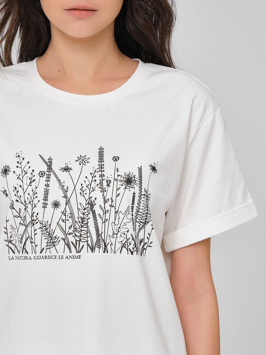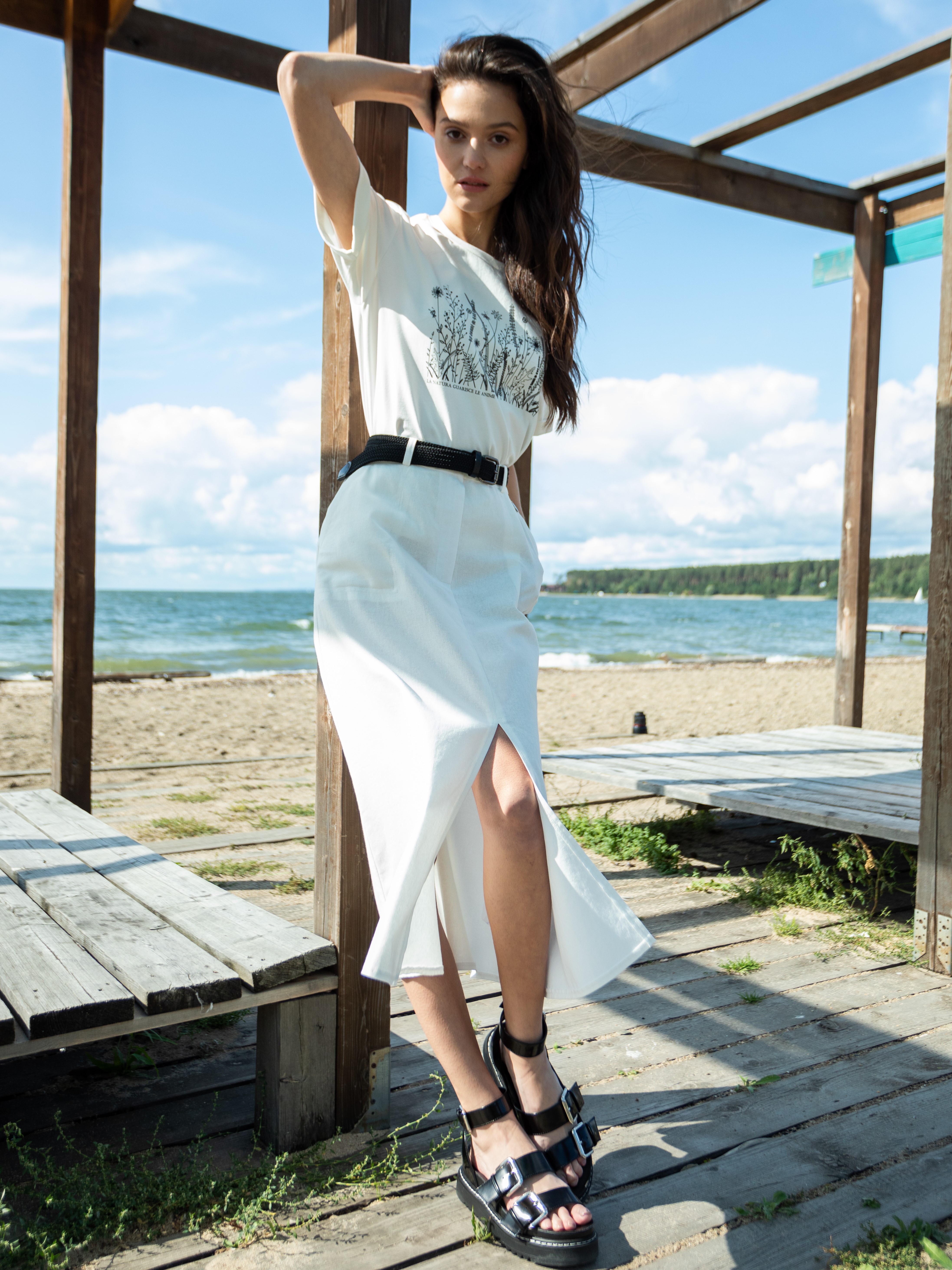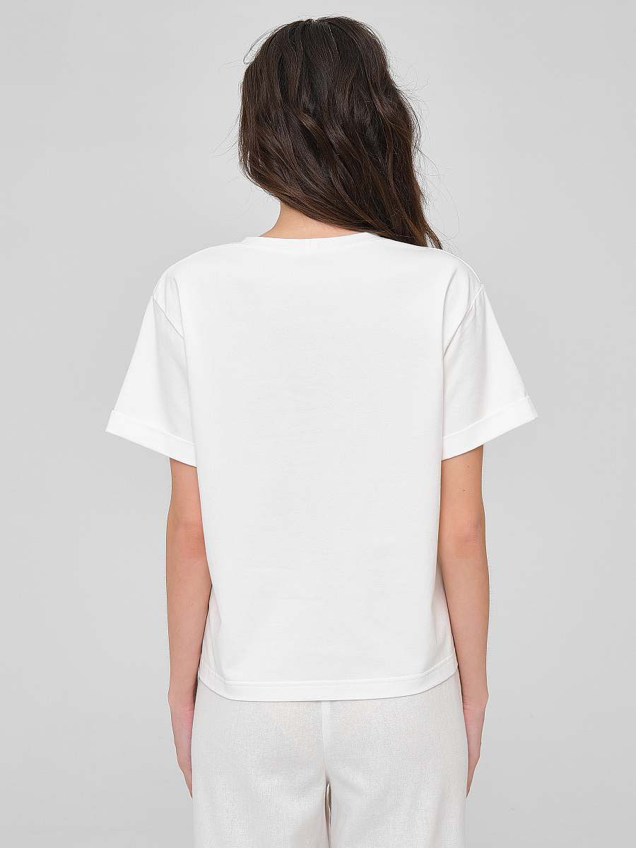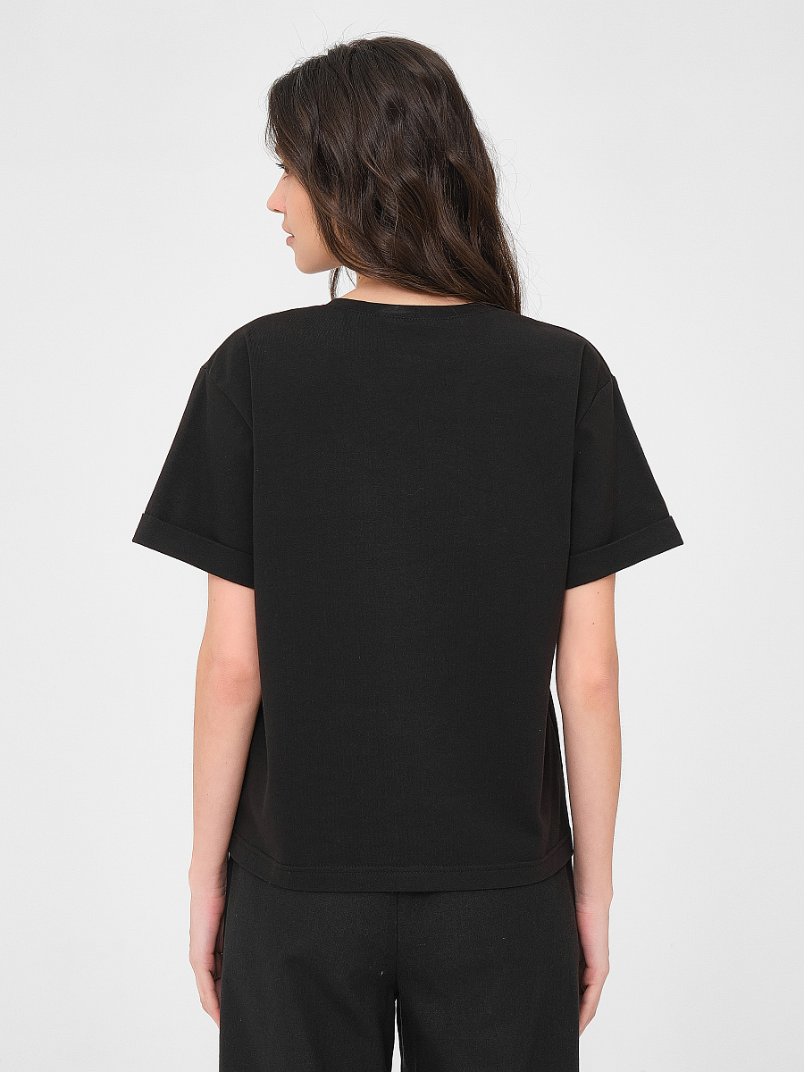 Горловина обработана бейкой. Плечо спущенное. По низу рукава отворот.