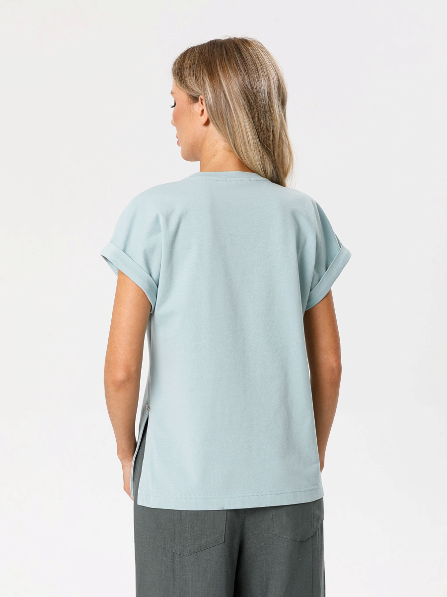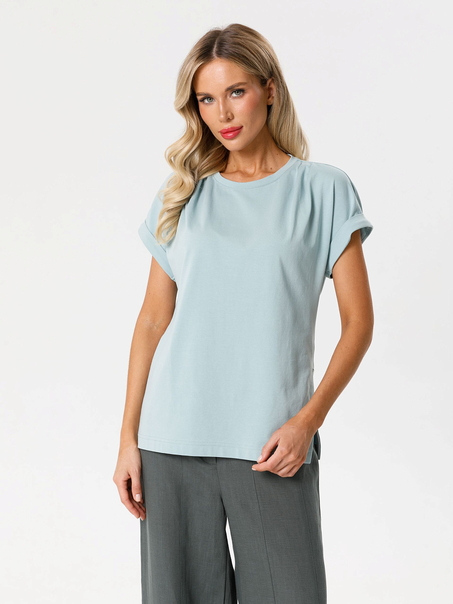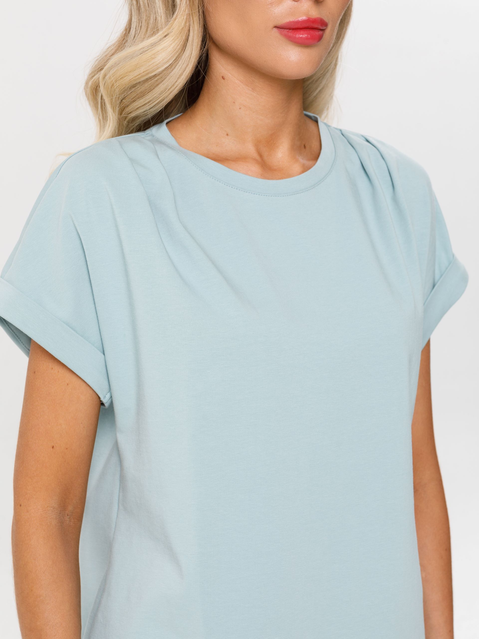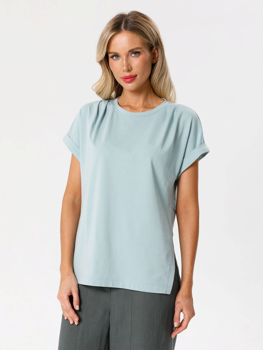 Модель полуприлегающего силуэта, с короттким цельнокроеным рукавом. По низу рукава узкая отложная манжета. Спереди по плечевым швам заложены группы складок. Горловина обработана бейкой. В левом боковом шве разрез.