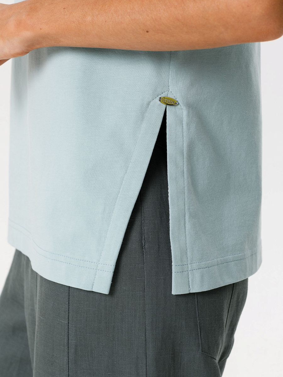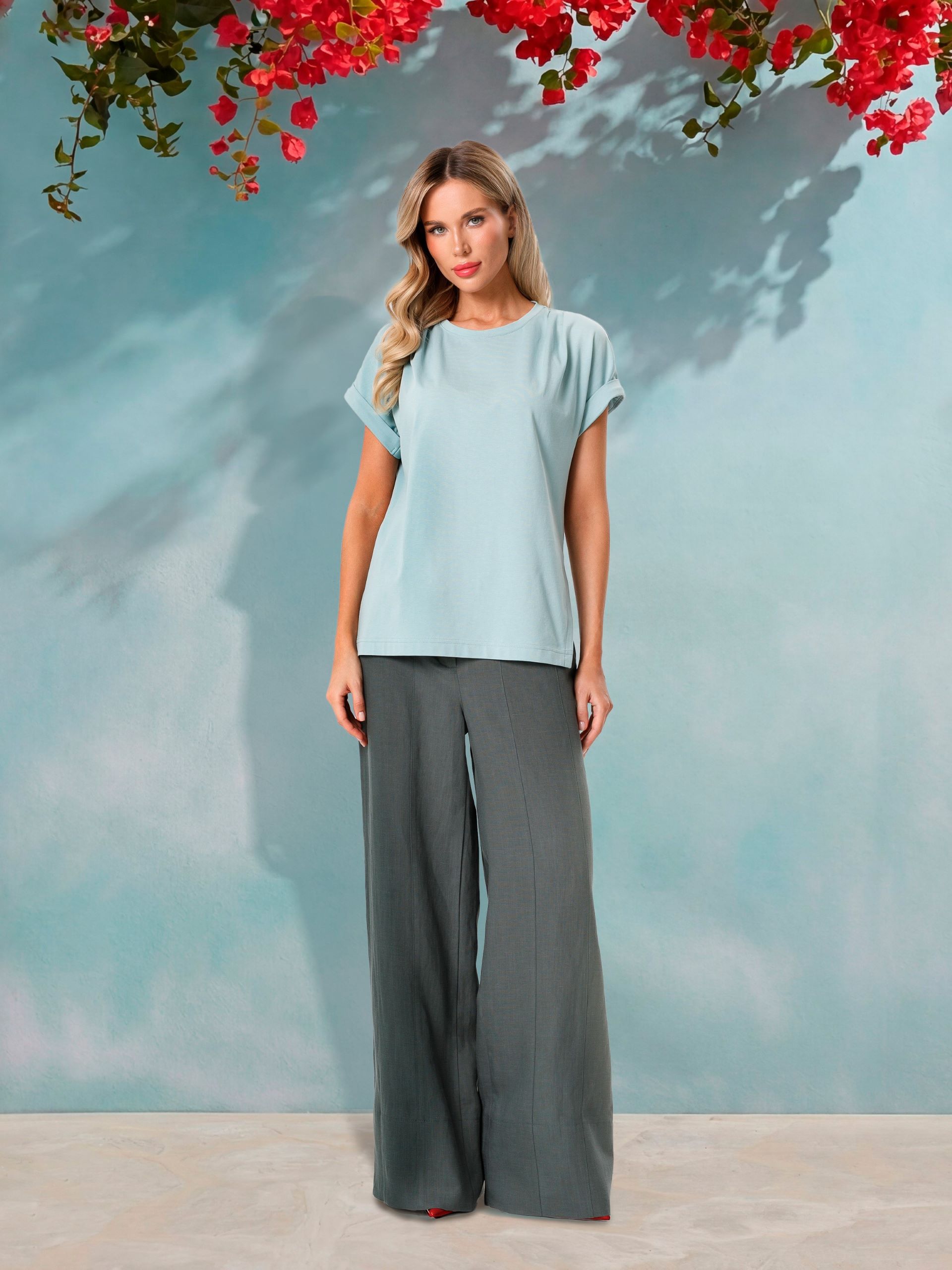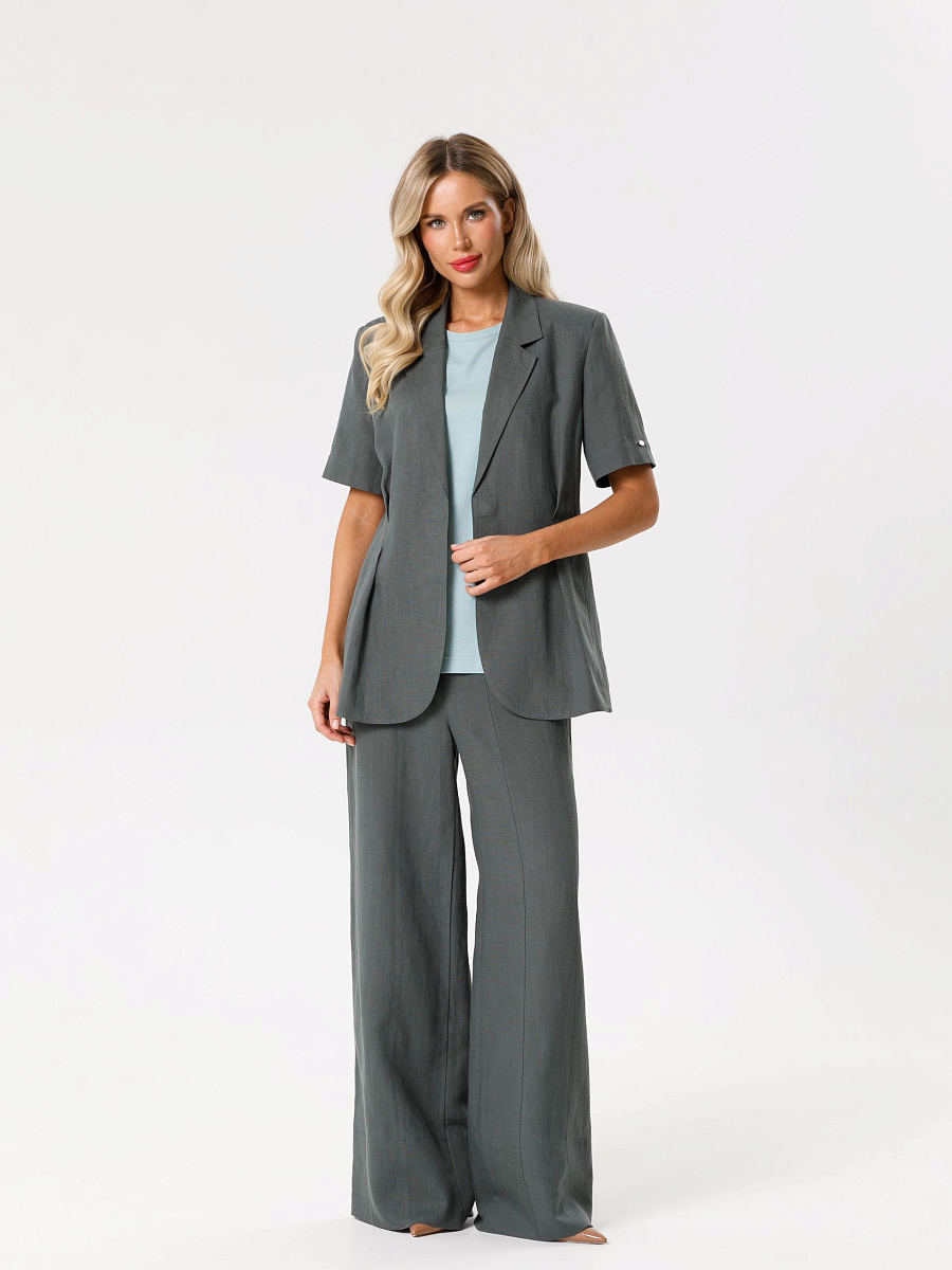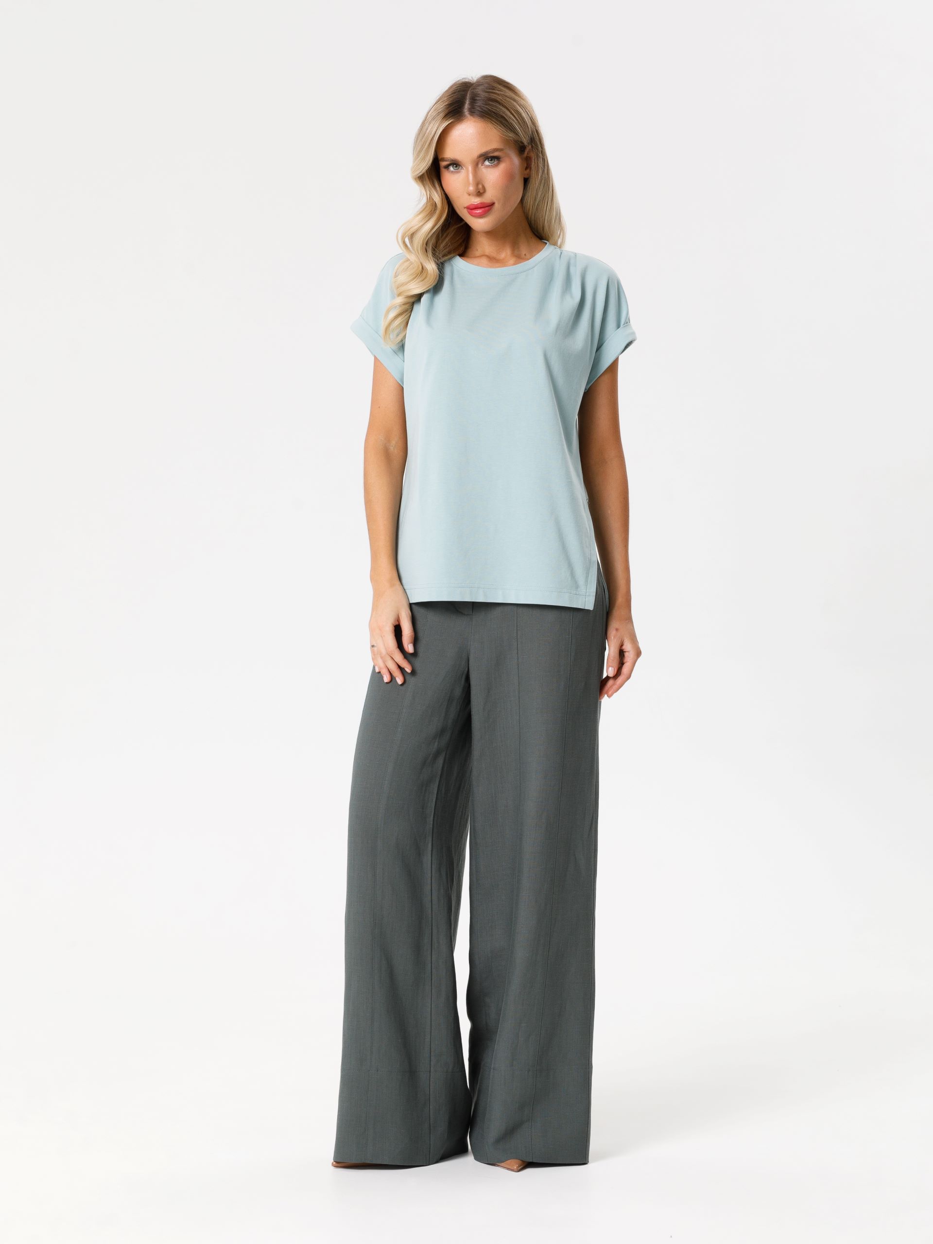 Модель полуприлегающего силуэта, с короттким цельнокроеным рукавом. По низу рукава узкая отложная манжета. Спереди по плечевым швам заложены группы складок. Горловина обработана бейкой. В левом боковом шве разрез.