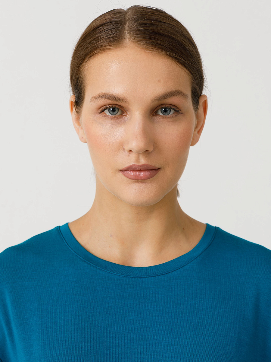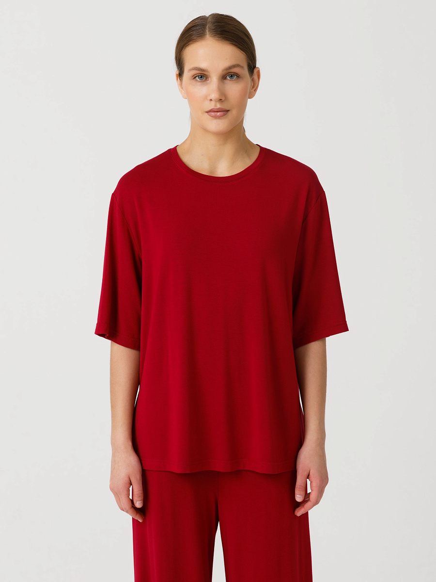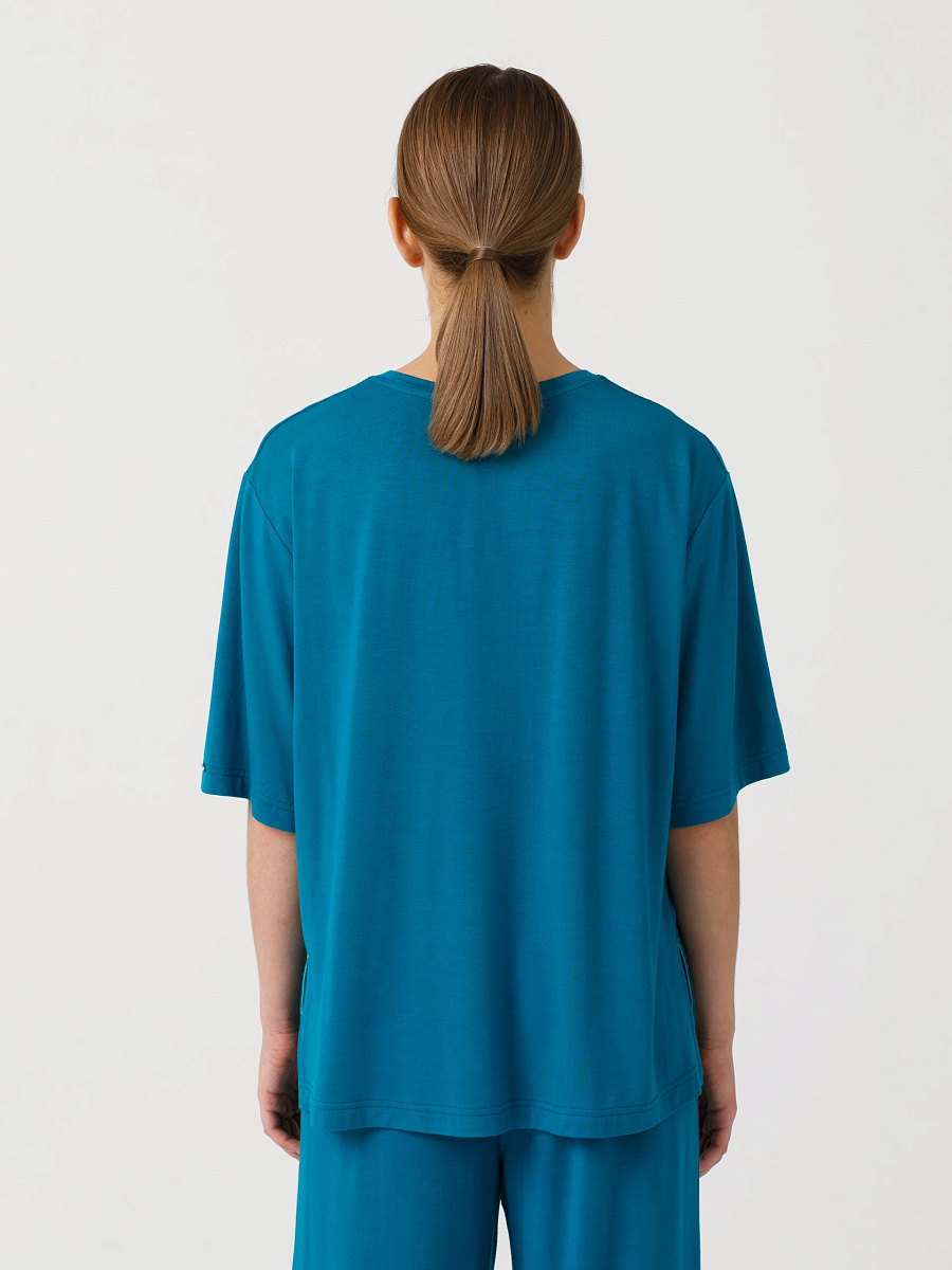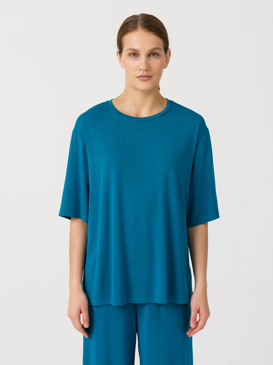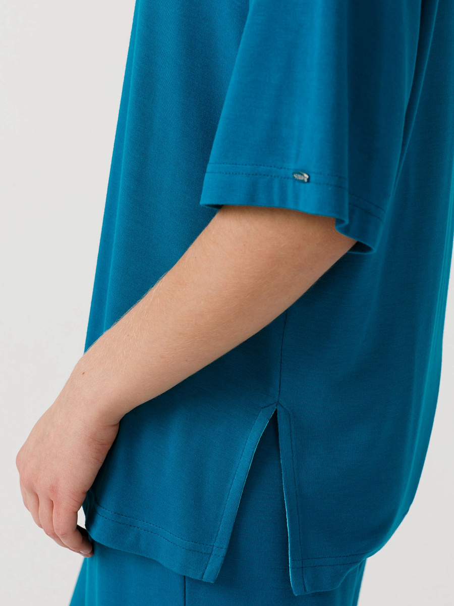 Футболка оверсайз, прямого силуэта, со спущенным плечом. Горловина обработана бейкой. В боковых швах разрезы. Длина по спинке: 42р - 66,5см, 56р - 70см.