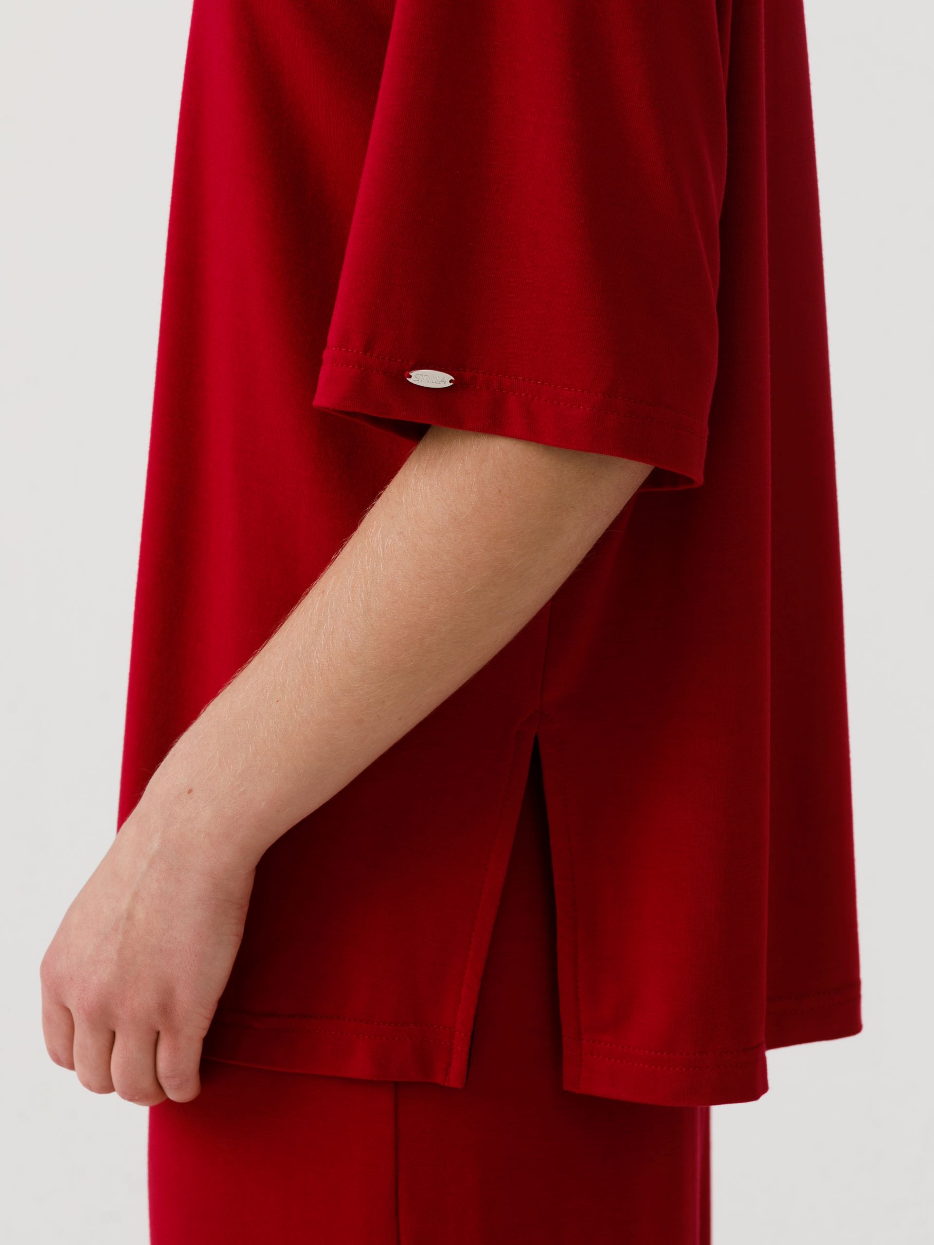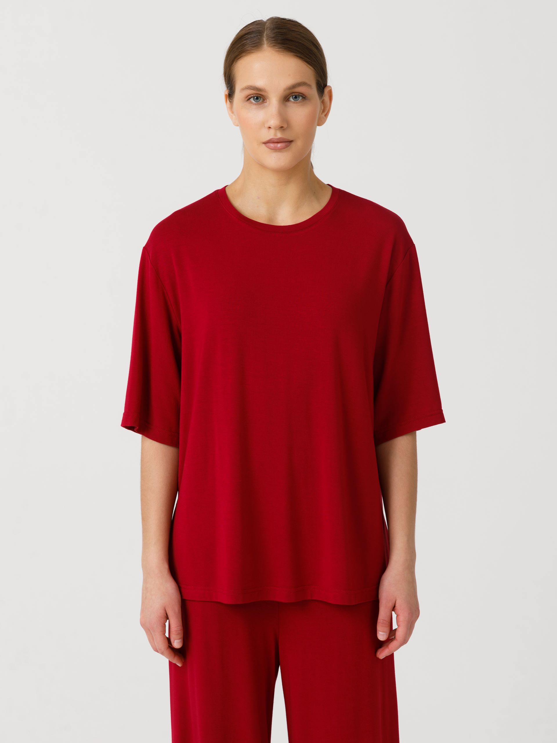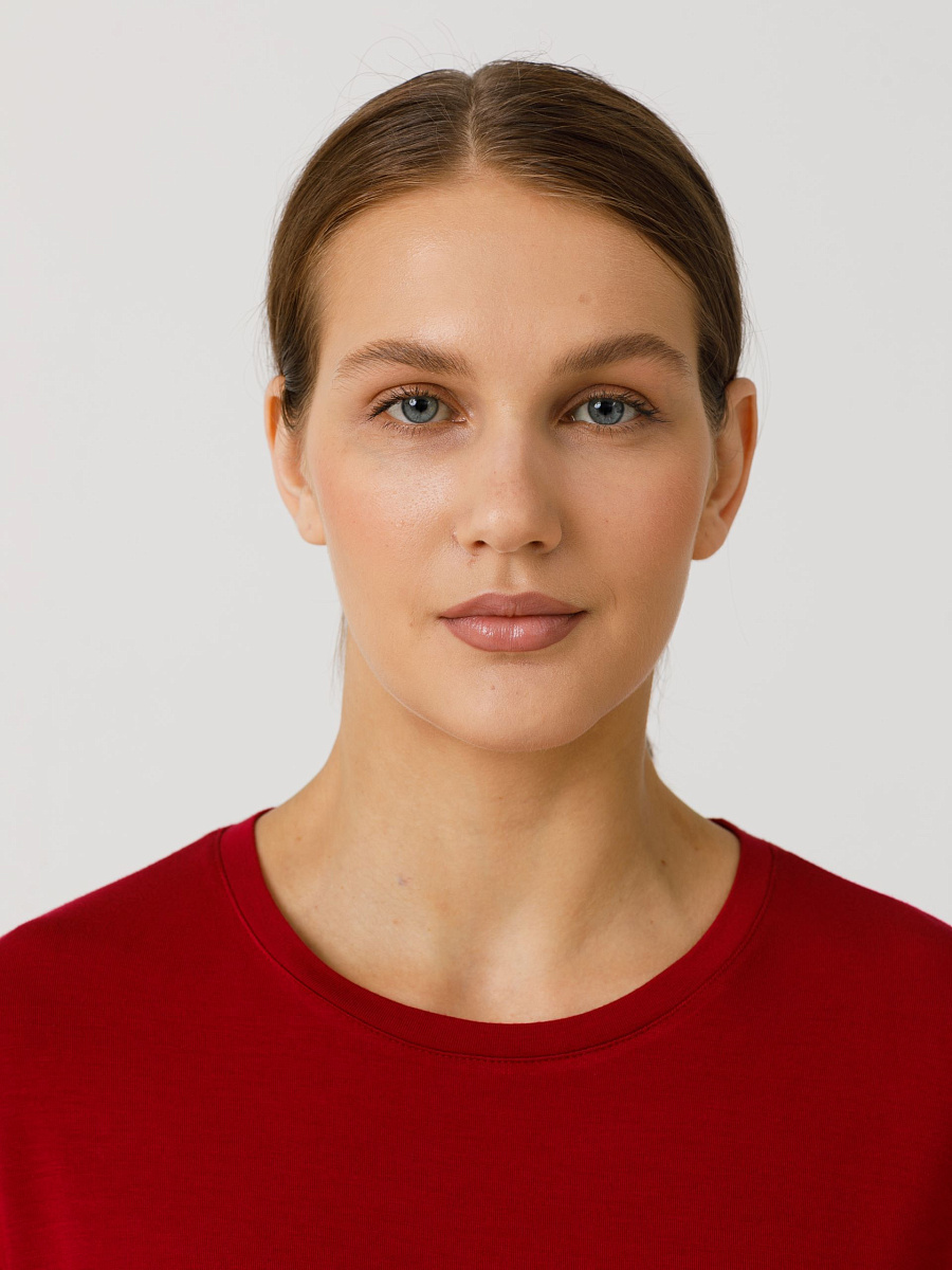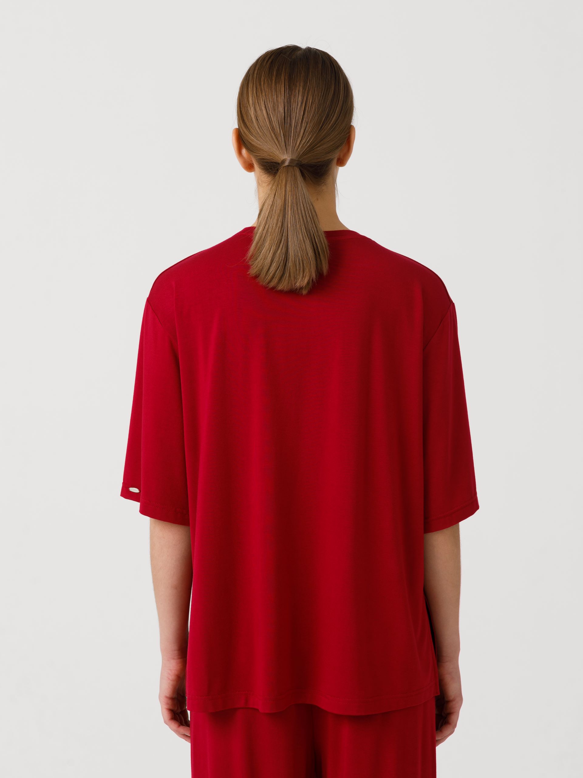Футболка оверсайз, прямого силуэта, со спущенным плечом. Горловина обработана бейкой. В боковых швах разрезы. Длина по спинке: 42р - 66,5см, 56р - 70см.