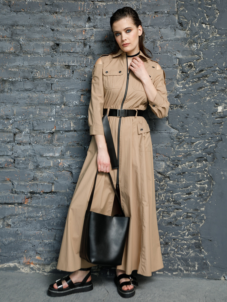 Модель Х-образного силуэта, с отрезной линией талии и втачным поясом, собранным на резину. Спереди центральная застёжка на молнию. Рукав с холодным плечом. По низу рукава защипы и манжета. В верхней части рукава и по плечевым швам паты. Перед и спинка с кокетками. В верхней части переда накладные карманы с клапанами. Спинка с рельефами. Нижняя часть платья расклешенная, спереди накладные карманы с имитацией клапанов. Клапаны, паты и манжеты застёгиваются на пуговицы. Талия подчёркнута съёмным ремнём. Платье декорировано отделочными строчками.
