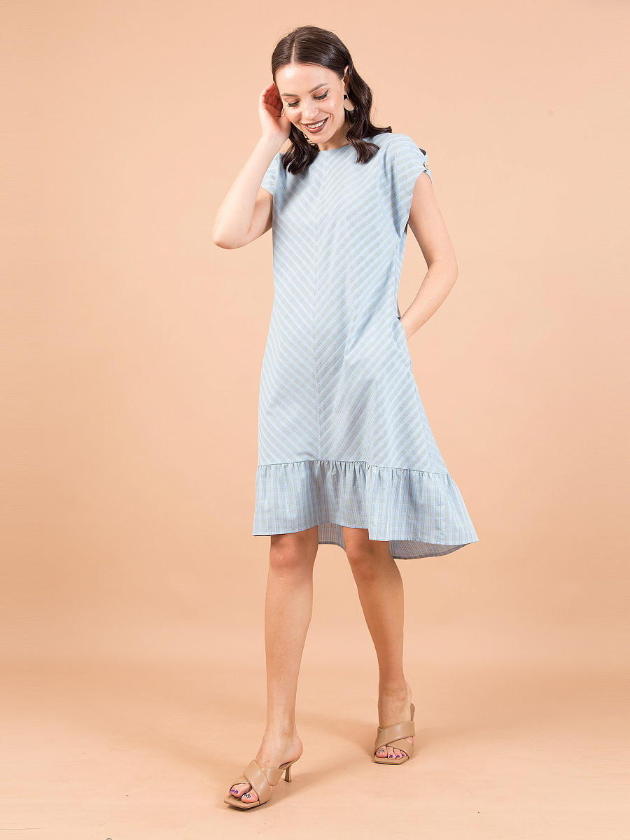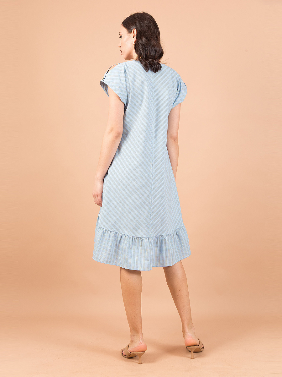 В плечевых швах обработаны фигурные вырезы и застёжка на пуговицу. Спереди и сзади средние швы. Низ платья закруглён, длиннее по спинке, оформлен воланом. Платье декорировано отделочными строчками. Ремень в комплект не входит.